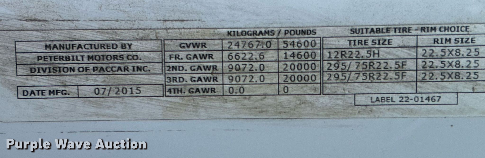 2016 Peterbilt 567 semi truck. Miles: 235,487 on odometer, VIN: 1XPCD49X6GD353028. Engine Cummins ISX15, Serial: 79858791, Displacement: 15L, Cylinders: 6, Fuel type: Diesel, HP: 485. Transmission Automated manual. Chassis Axles: Tandem, Differential lock: Inter-axle, Suspension: Air Dump valves, Brakes: Air, PTO, Wet kit, GVWR: 54,600 lbs FAWR: 14,600 lbs, IAWR: 20,000 lbs, RAWR: 2,000 lbs. Interior AC, Heat, Power windows, Power locks, Cruise control, Air ride cab. Features Deck plate: Aluminum, Fifth wheel type: Air operated, Sliding, Fuel tank: Single. Tires Size: 11R22.5. Notes Windshield chipped or cracked. Oklahoma title. Title has a lien that will be released following the close of the auction. Title distribution may be delayed up to 30 days from verification of funds. ARKK Trucking, Inc.. 18912 W 51 Hy S. Sand Springs, OK 74063