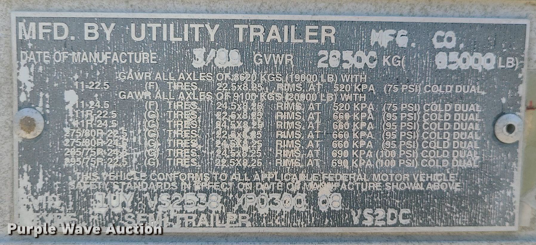 1999 Utility VS2DC dry van trailer. VIN: 1UYVS2538XP030008. Dimensions Overall: 53' L x 102" W, Body: 53' L x 102" W. Features Deck type: Wood. Chassis Landing gear: Dual, Suspension: Air, Brakes: Air, Axles: Tandem, GVWR: 65,000 lbs. Tires Steel wheels, Size: 295/75R22.5. Missouri title. Title distribution may be delayed up to 14 days from verification of funds. LT Delivery, Inc.. Northmoor, MO 64151