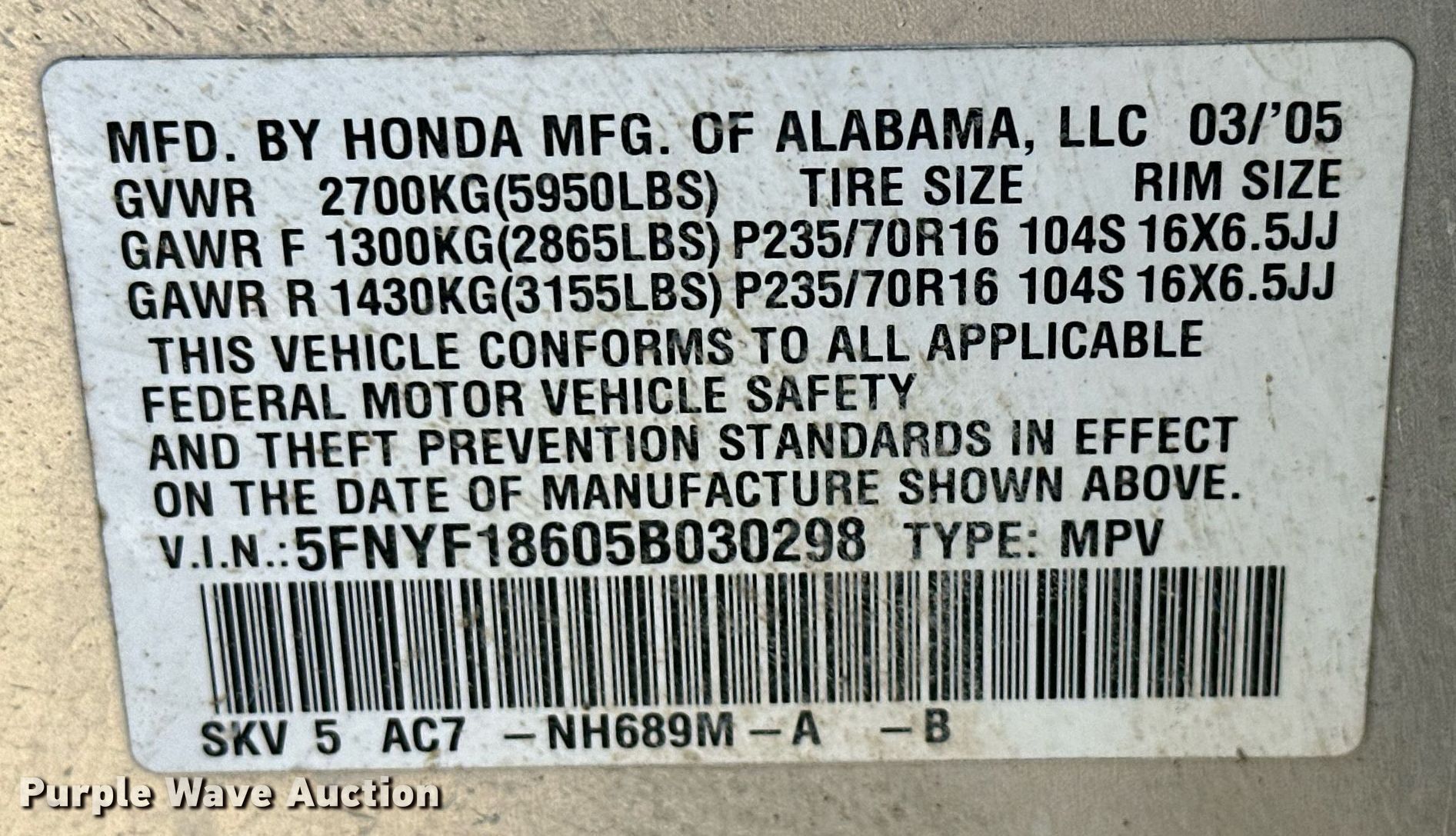 Purple Wave is selling a used Passenger Vehicle in Kansas. This item is a 2005 Honda Pilot SUV with the following: Miles: 308,043 on odometer, VIN: 5FNYF18605B030298