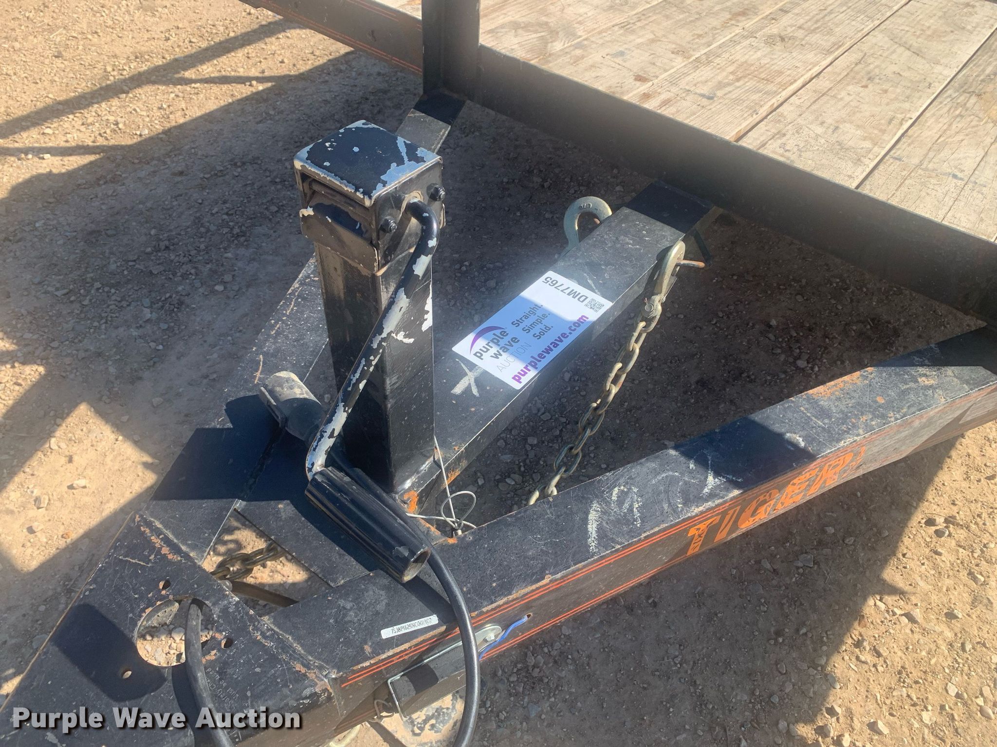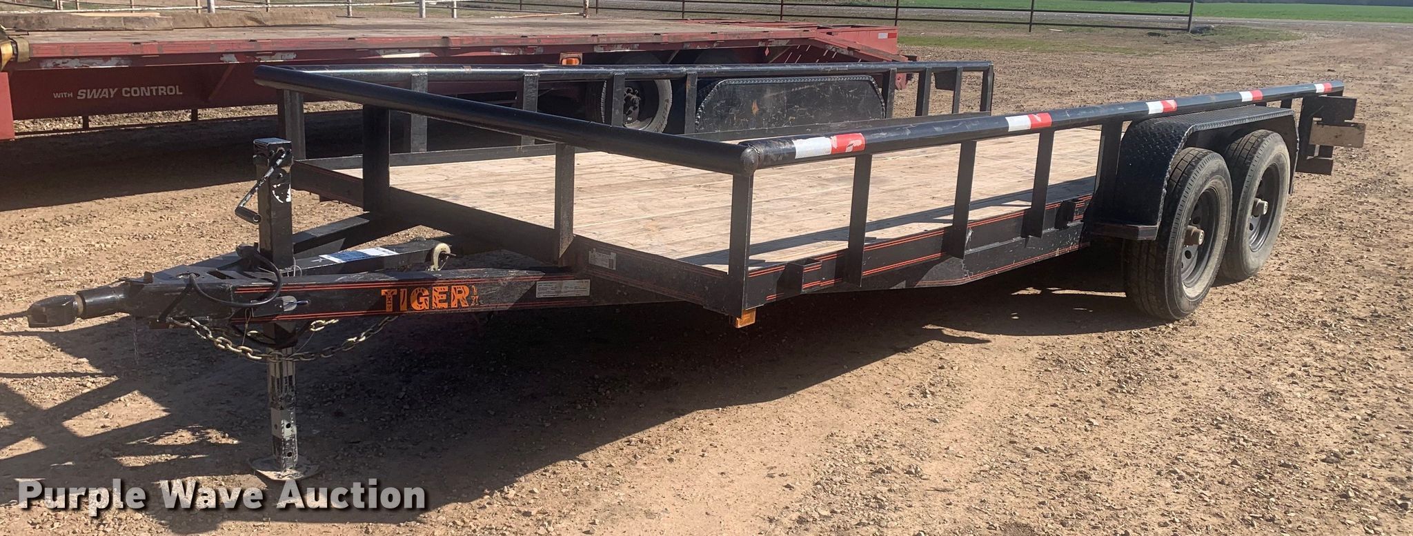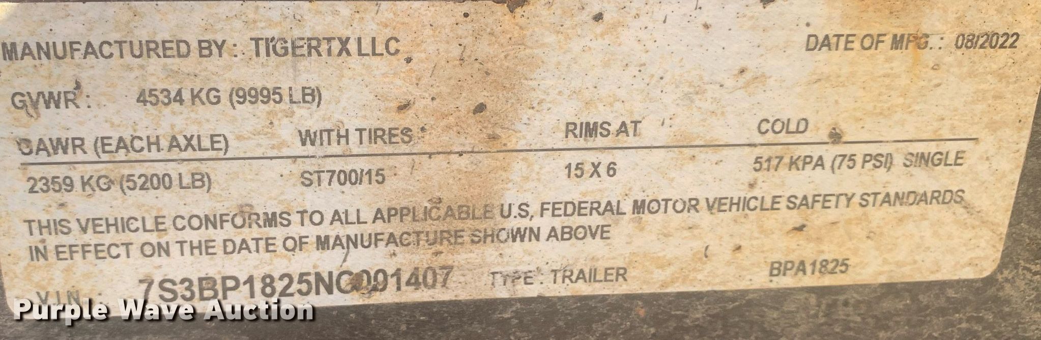 2022 Tiger BPA1825 utility trailer. VIN: 7S3BP1825NC001407. Dimensions Overall: 22' 2" L x 8' 5" W, Deck: 18' 2" L x 7' 5" W, Side height: 12", Deck height: 1' 11", Ramps: Manual Length: 5'. Features Deck type: Wood. Chassis Ball hitch: 2 5/16", Landing gear: Single, Suspension: Spring, Brakes: Electric, Axles: Tandem, GVWR: 9,995 lbs, GAWR: 5,200 lbs. Tires Steel wheels, Size: ST225/75R15. Texas title. Title distribution may be delayed up to 14 days from verification of funds. 16122 Farm to Market 38. Honey Grove, TX 75446