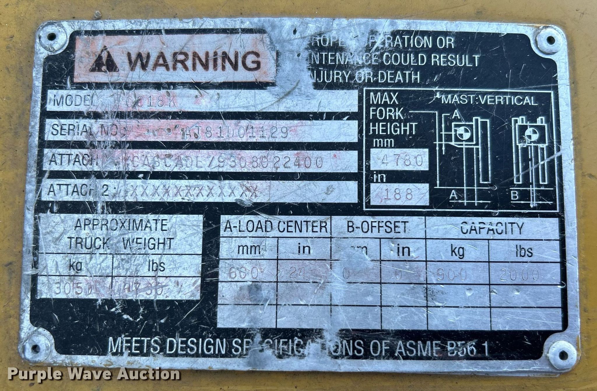 Caterpillar GC18K forklift. Hours: 4,952 on meter, Serial: AT81D01129. Engine Mitsubishi, Cylinders: 4, Fuel type: LPG LP bottle: Included. Transmission Powershift. Operators station Canopy. Features Maximum lift capacity: 2,000 lbs, Maximum lift height: 188", Mast stages: 3, Side shift, Mast tilt, Fork length: 42". Tires Front: 18x6x12, Rear: 14x4 1/2x8, Solid. 15107 North 137th East Avenue. Collinsville, OK 74021