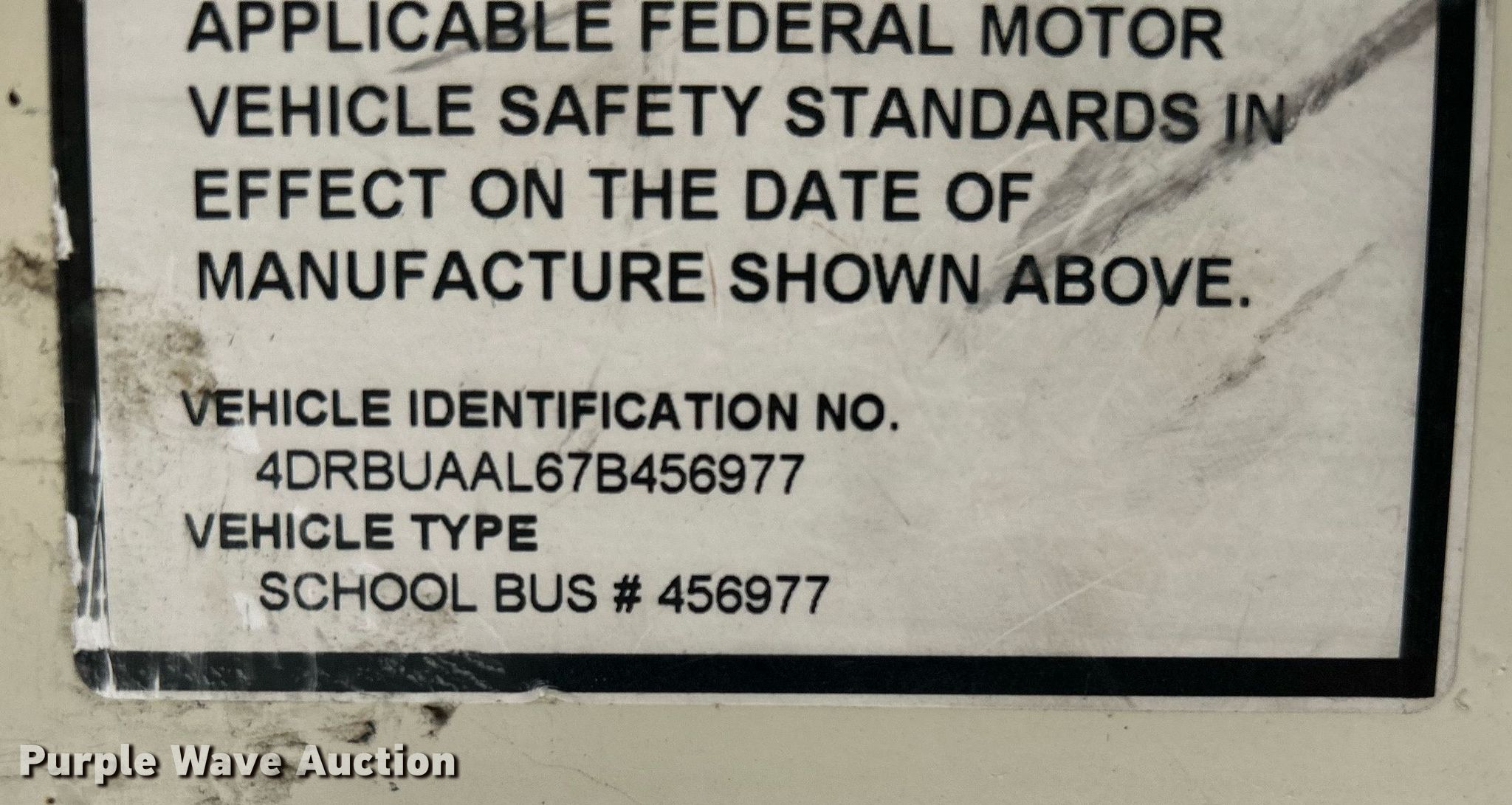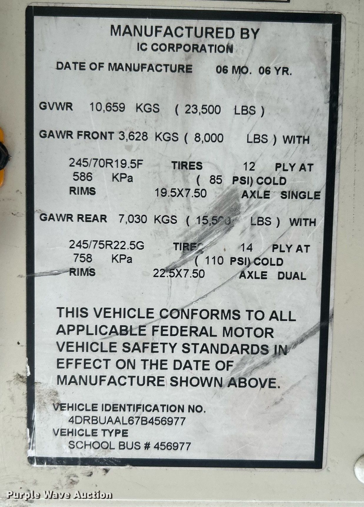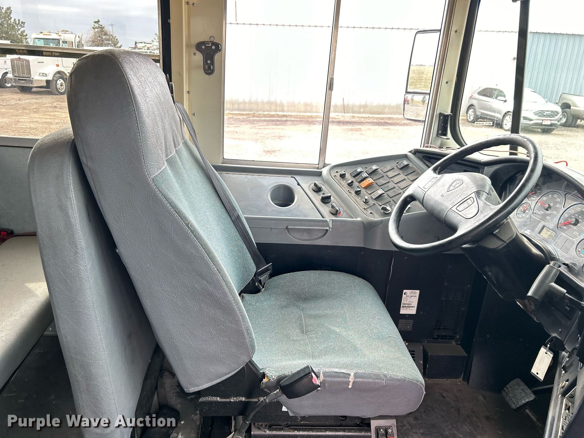 2007 International CE. Miles: 166,282 on odometer, Hours: 11,188 on meter, VIN: 4DRBUAAL67B456977. Engine International D210, Displacement: 7.6L, Cylinders: 6, Fuel type: Diesel. Transmission Automatic. Chassis Axles: Single, Suspension: Spring, Brakes: Air, GVWR: 23,500 lbs. Interior AC, Heat, Cruise control, Electric passenger sliding door, Passengers: 27, Wheelchair lift. Tires Front: 245/75R22.5, Rear: 255/70R22.5. Notes Unknown operating condition of wheelchair lift. Oklahoma title. Title distribution may be delayed up to 14 days from verification of funds. 15107 North 137th East Avenue. Collinsville, OK 74021