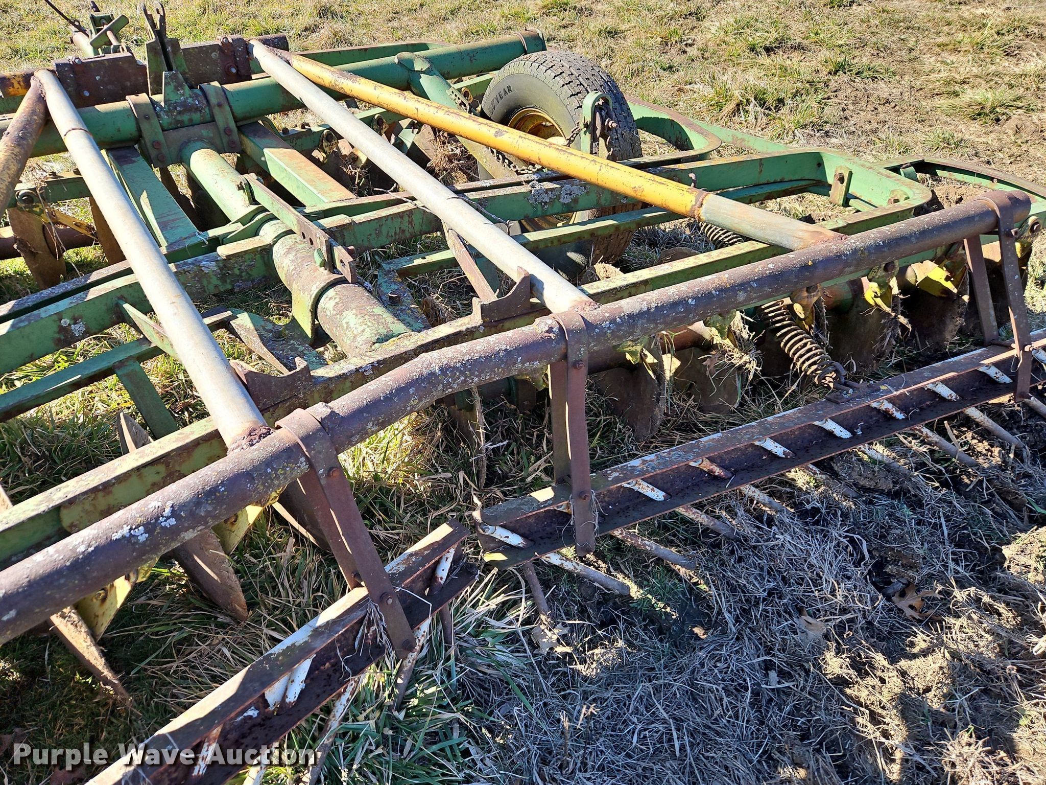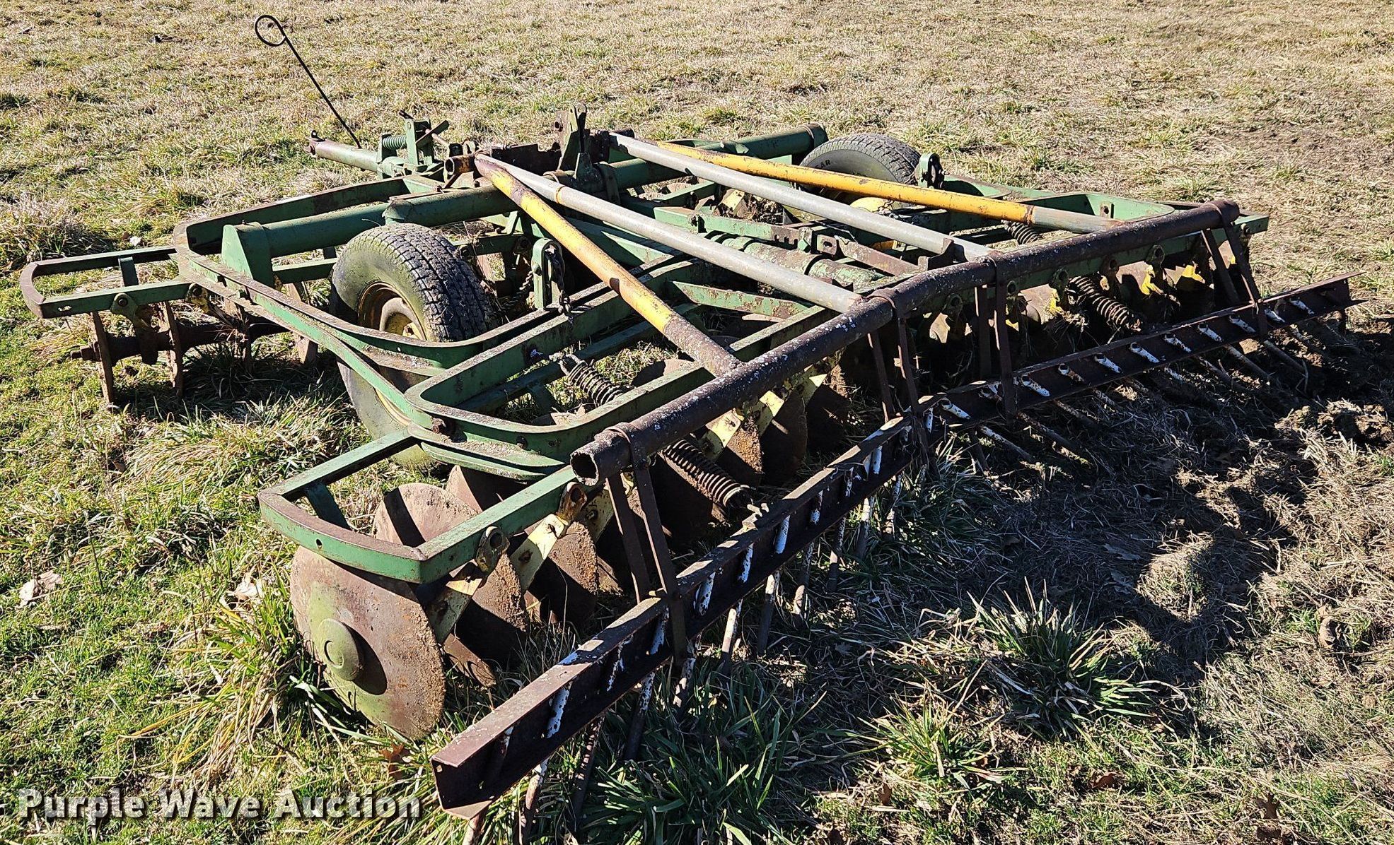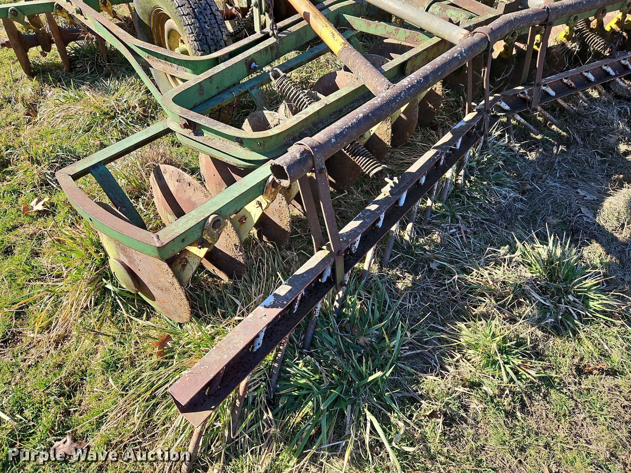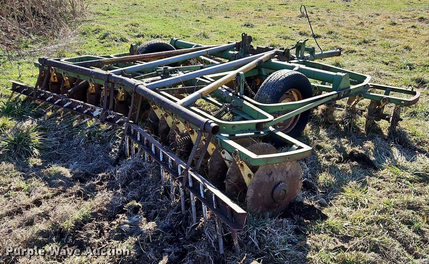 John Deere H1000 double off-set disk. Overall width: 12', Serial: 012756B. Features Front blades Diameter: 16", Spacing: 9", Rear blades Diameter: 18", Spacing: 9", Disk scrapers, Attachments Spike tooth harrow Harrow bars: 1.. Tires Tire size: 225/75R15. R.J. Smith Farms. 29620 Shaler Rd. Cleveland, MO 64734
