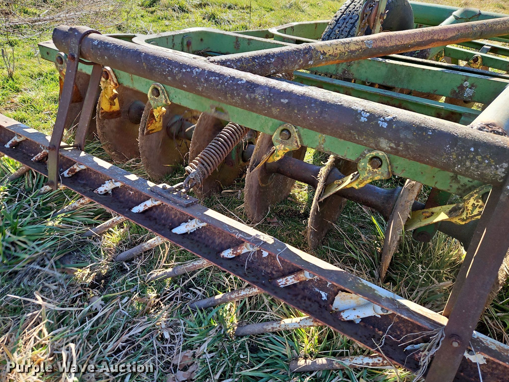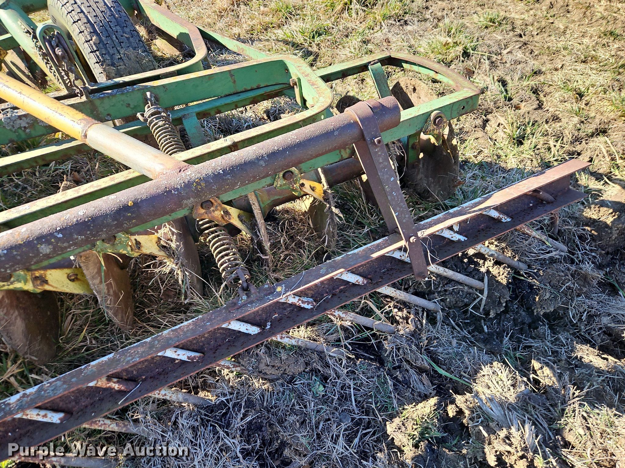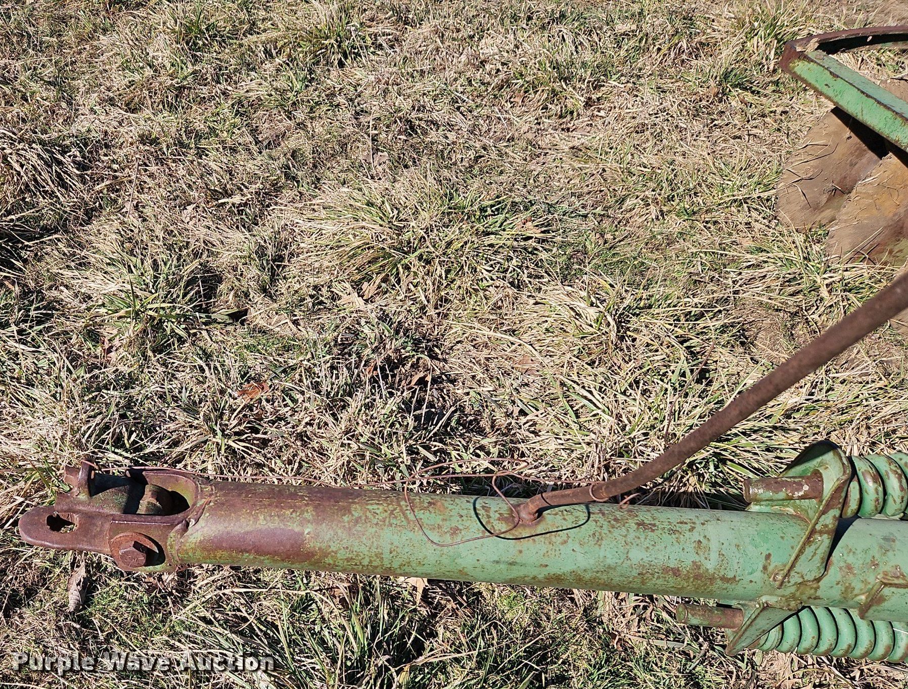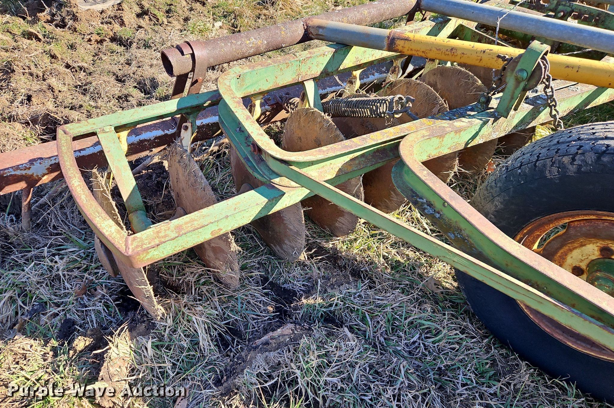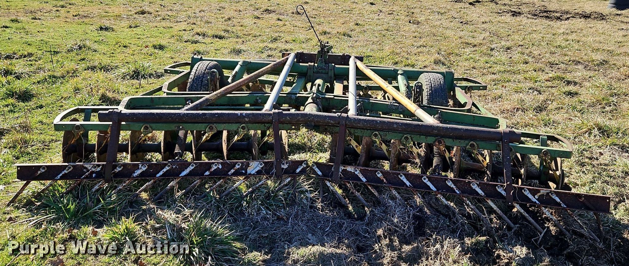 John Deere H1000 double off-set disk. Overall width: 12', Serial: 012756B. Features Front blades Diameter: 16", Spacing: 9", Rear blades Diameter: 18", Spacing: 9", Disk scrapers, Attachments Spike tooth harrow Harrow bars: 1.. Tires Tire size: 225/75R15. R.J. Smith Farms. 29620 Shaler Rd. Cleveland, MO 64734