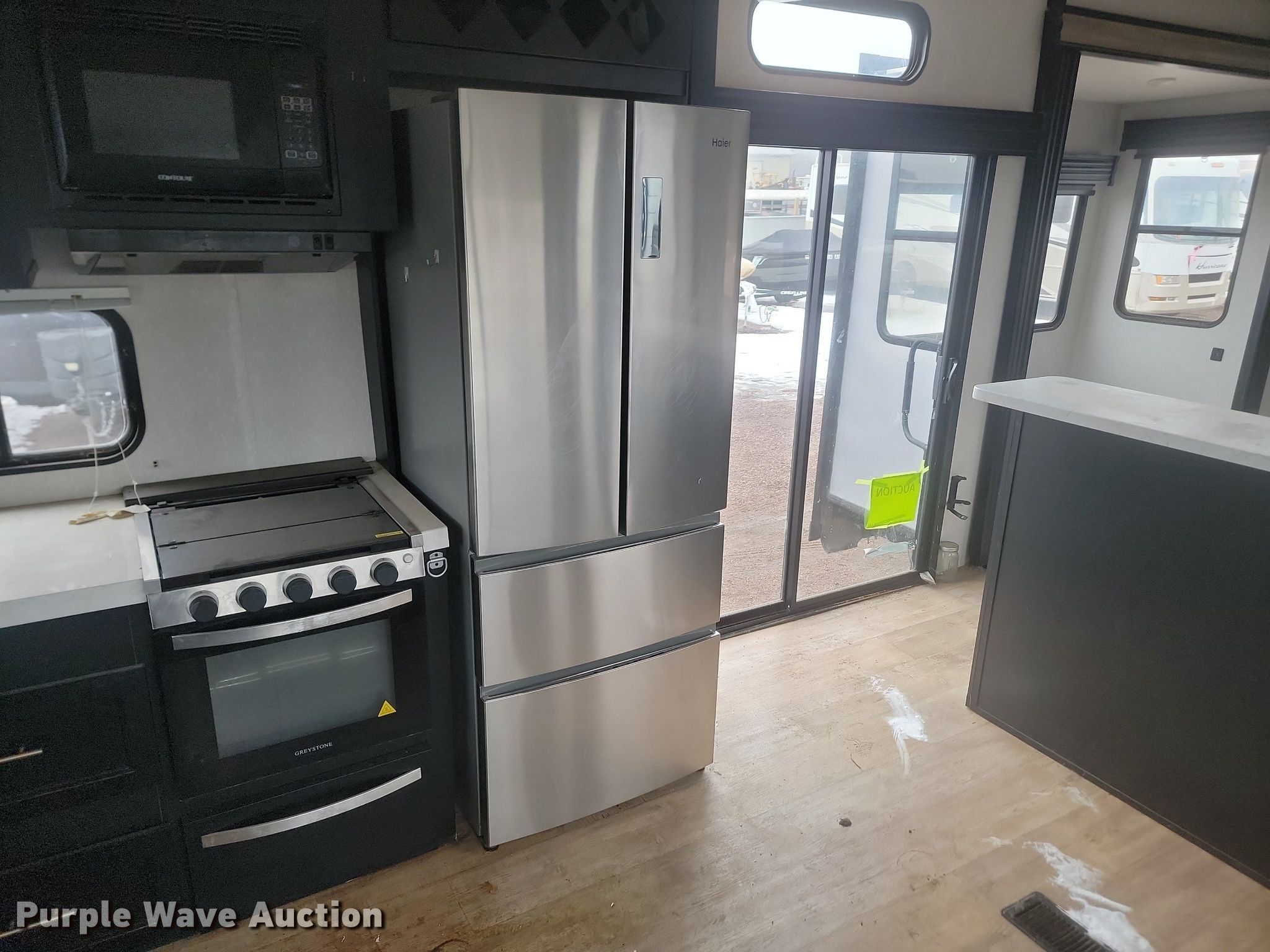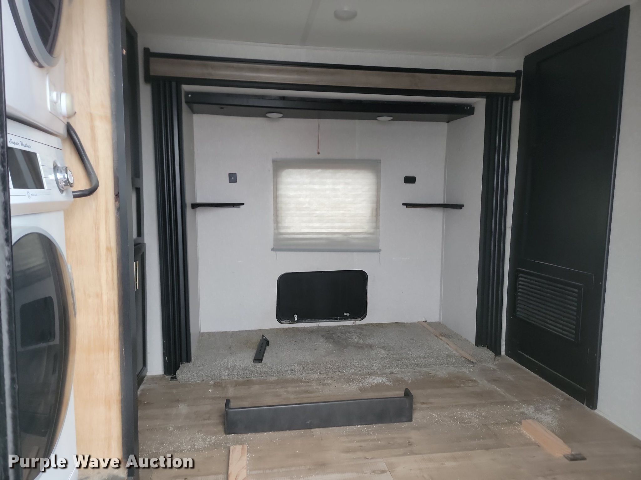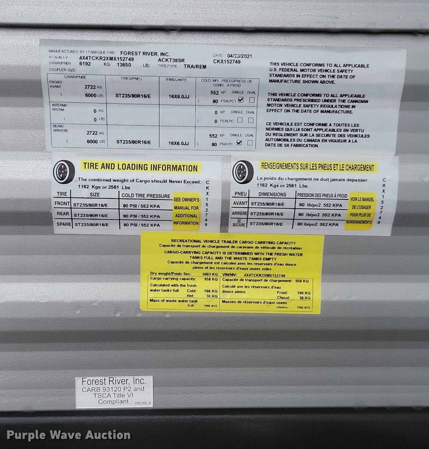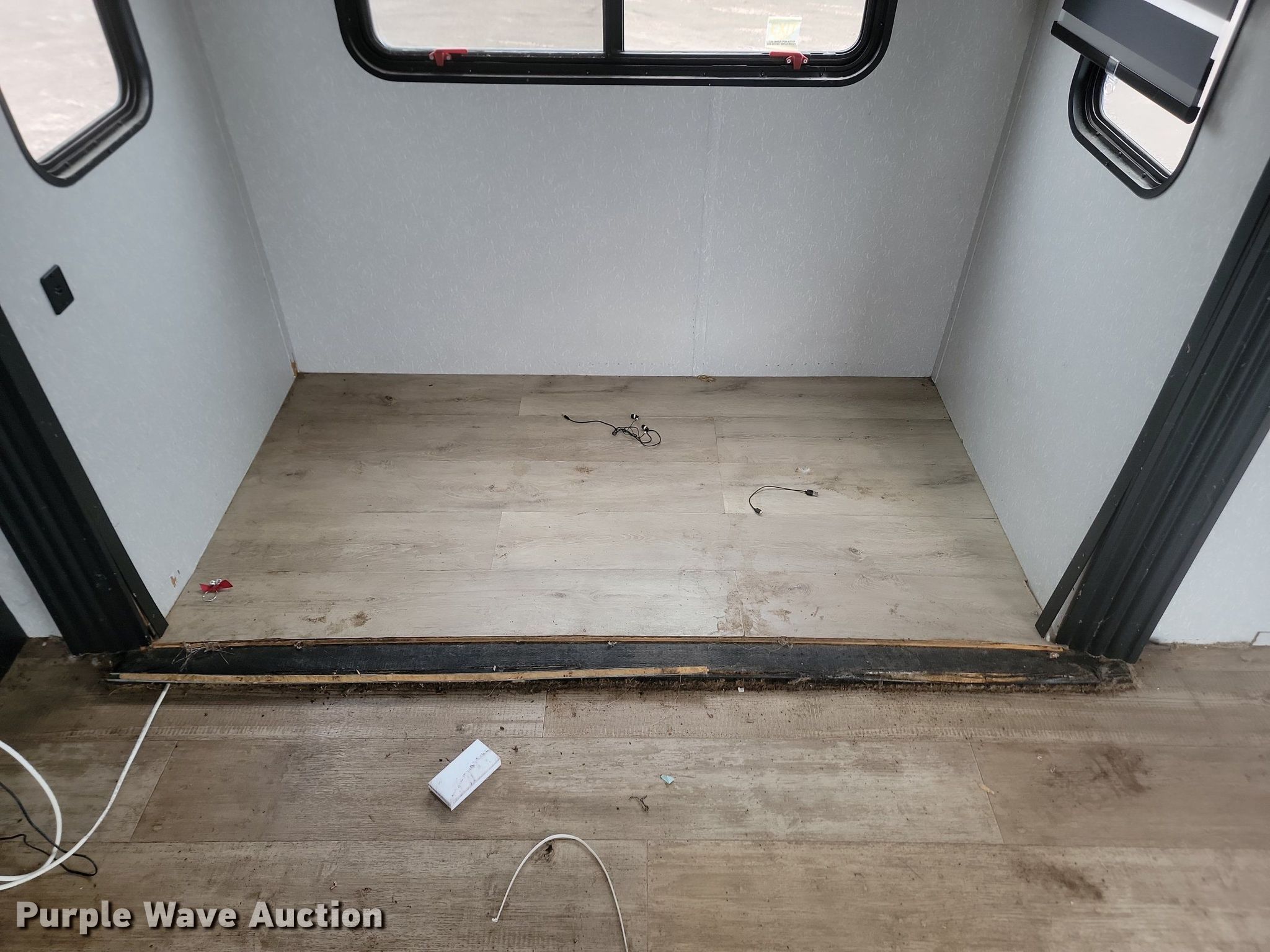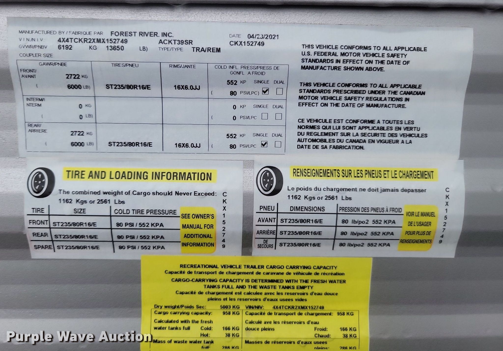 2021 Forest River Timberwolf camper. Camper length: 42' 11", VIN: 4X4TCKR2XMX152749. Chassis Axles: Tandem, Suspension: Spring, Brakes: Electric, GVWR: 13,650 lbs, GAWR: 6,000 lbs. Interior Kitchen: Sink, Refrigerator, Freezer, Oven, Stove: Propane, Living room: Table, Washer, Dryer, Heater, AC units: 2. Features Slide outs: 4, Awnings: 1 Awning type: Electric, Ball hitch: 2 5/16". Tires Size: ST235/80R16. Notes Floor damaged. South Dakota title. Title distribution may be delayed up to 14 days from verification of funds. Noteboom RV. 27316 SD-115. Harrisburg, SD 57032