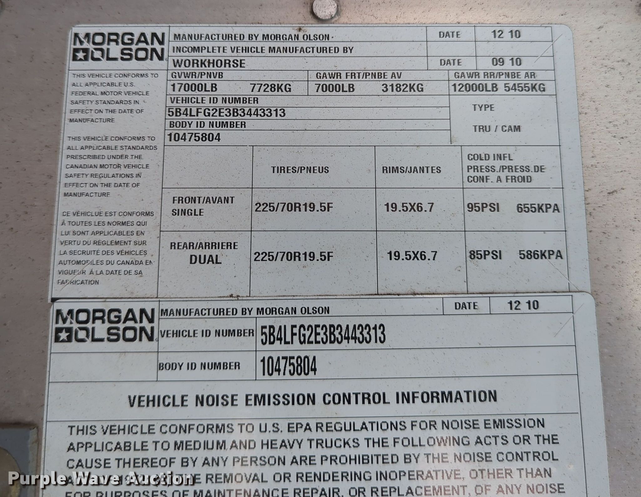 2011 Workhorse W62 delivery truck. Miles: 171,735 on odometer, VIN: 5B4LFG2E3B3443313, Unit #: F-100568 / 825-F-40. Engine Displacement: 6.0L, Cylinders: 8, Fuel type: Gas. Transmission Automatic. Chassis Axles: Single, Suspension: Spring, Brakes: Hydraulic, GVWR: 17,000 lbs. Interior AC, Heat. Features Box bed Morgan Olson, Serial: 10475804, 18' L x 96" W x 84" H, Floor: Aluminum. Tires Size: 225/70R19.5. Notes Dash warning indicator: Check engine, Low coolant level, Transmission light, Coolant leak. Oklahoma title. Title distribution may be delayed up to 30 days from verification of funds. Unifirst Corporation. 2130 East California Avenue. Oklahoma City, OK 73117