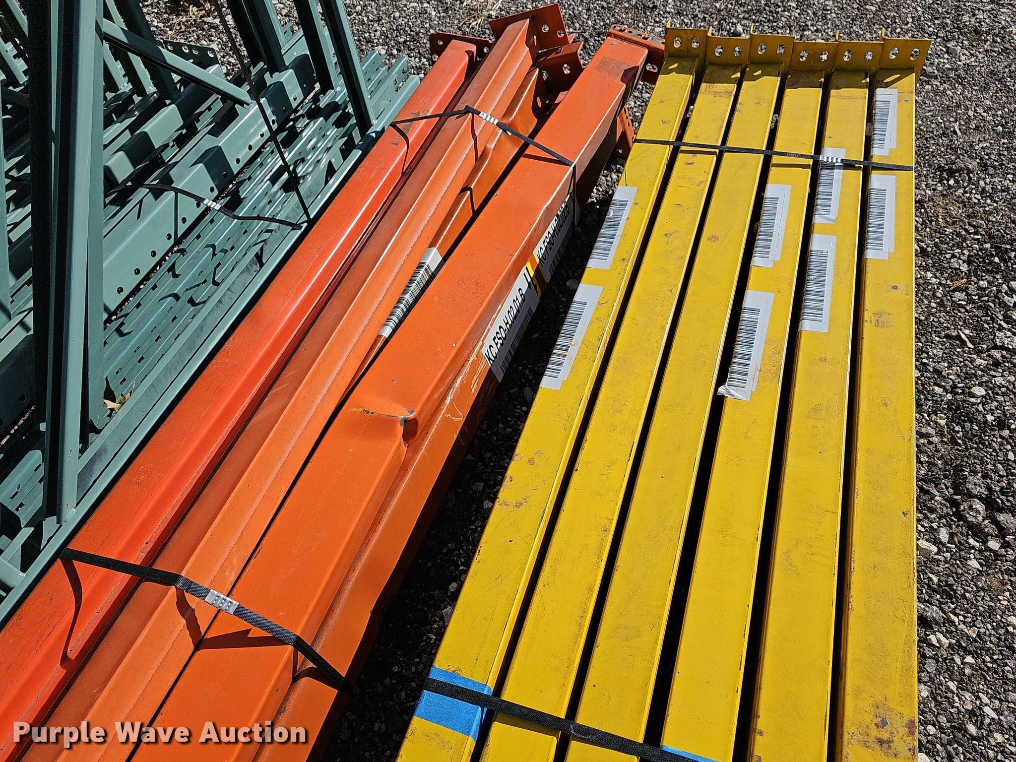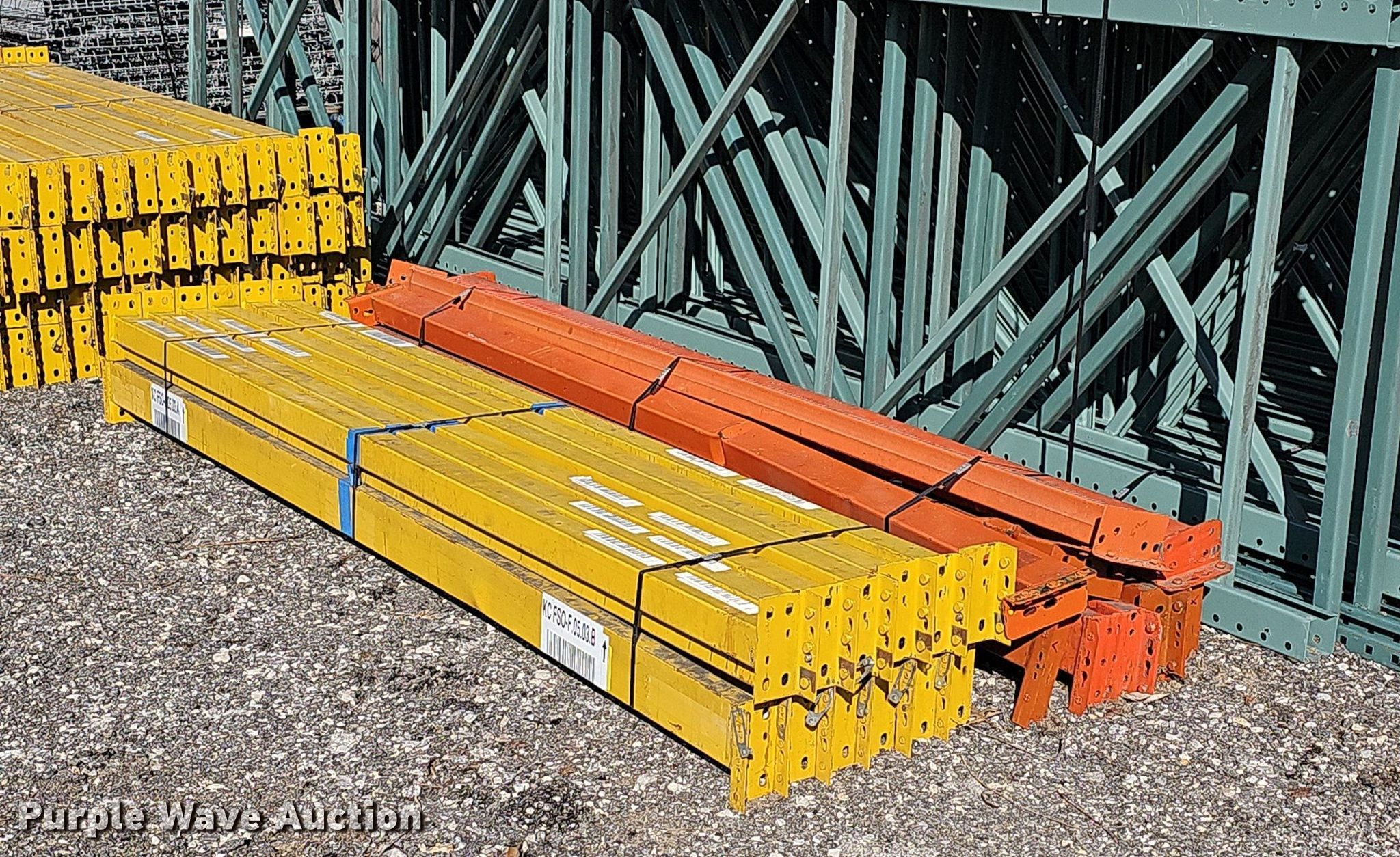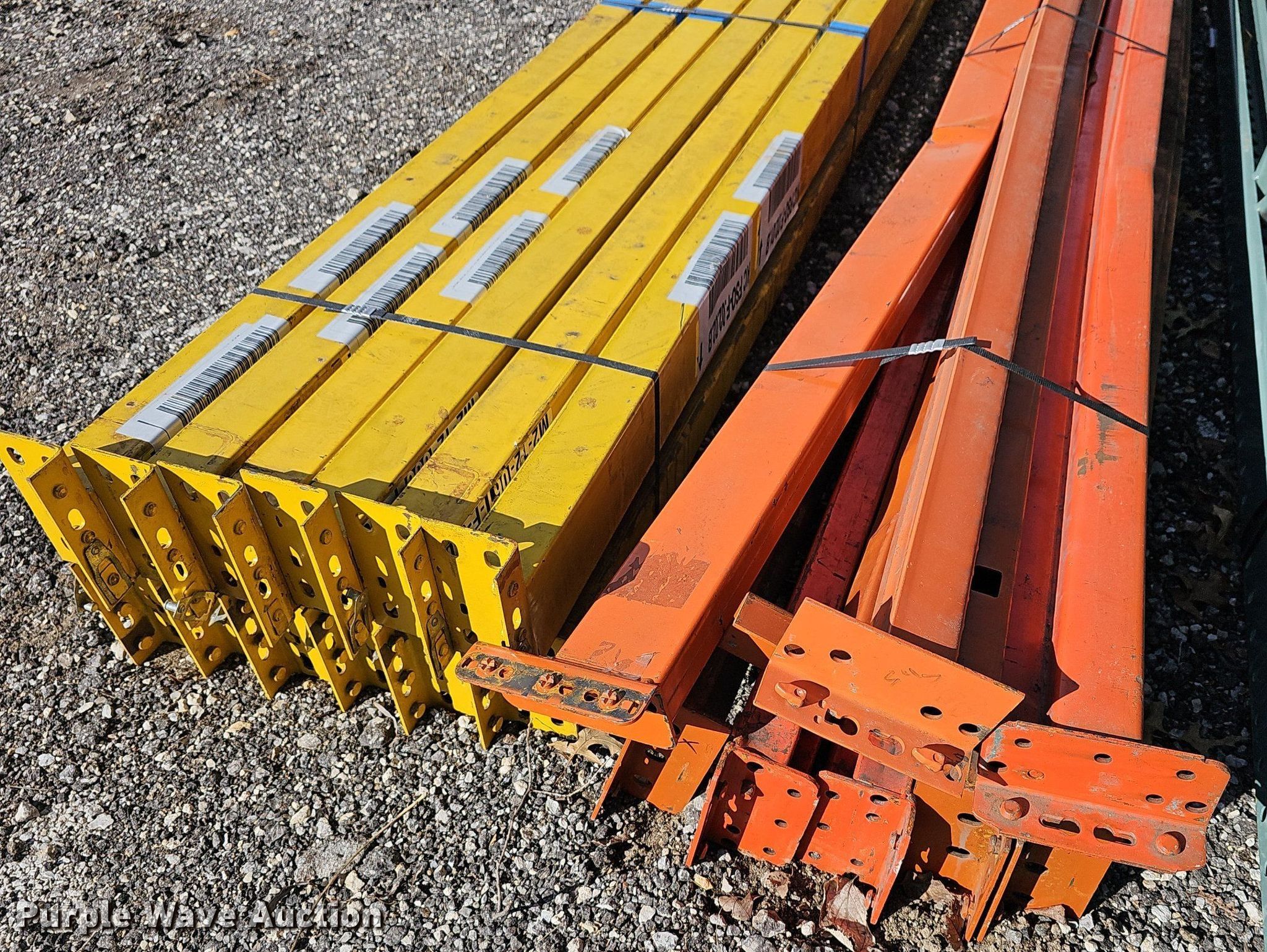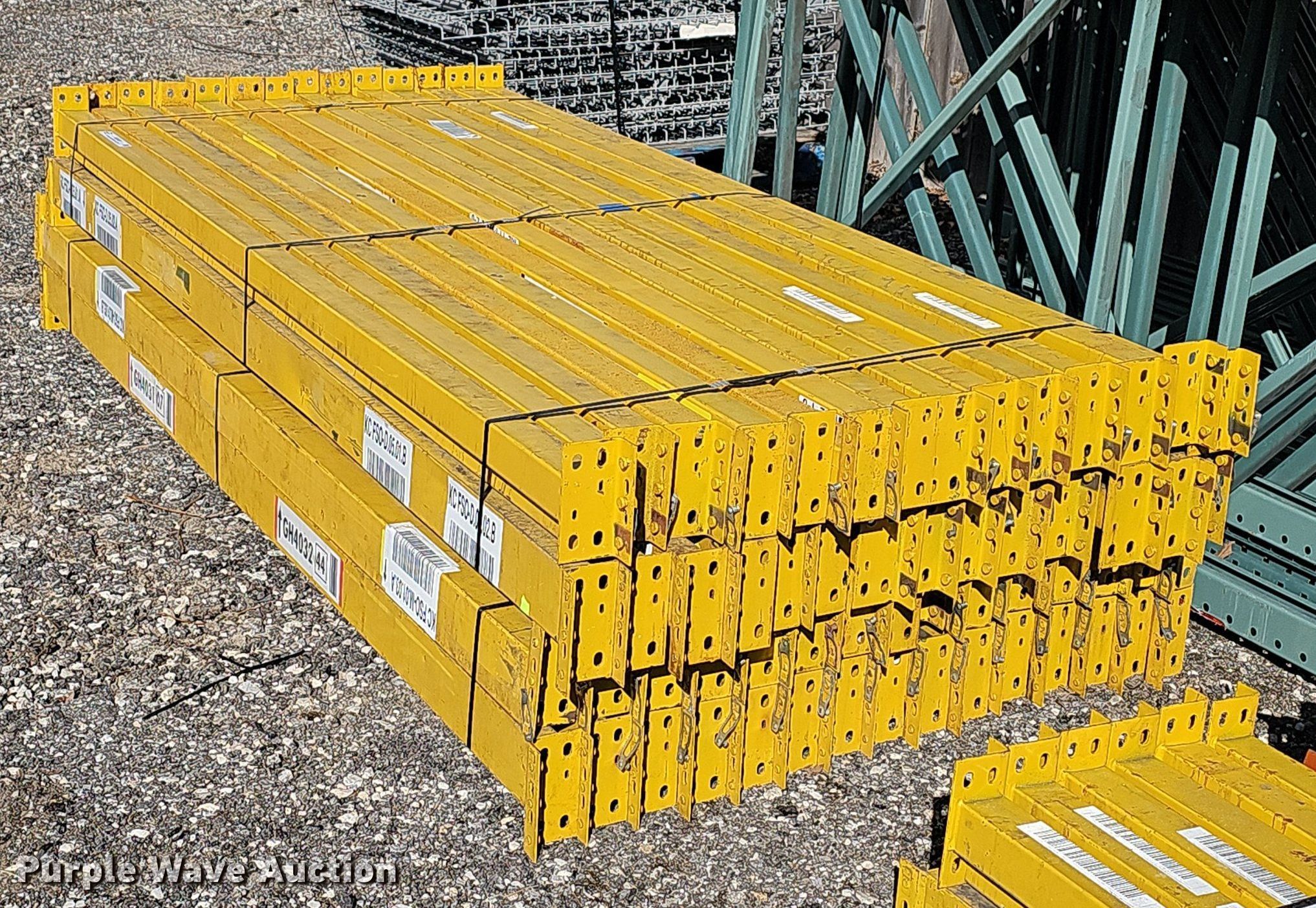 Purple Wave is selling a used Pallet Racking in Kansas. This item is a Pallet racking with the following: Uprights, Size:18', (3) 14', (8) 16', (6) uprights have damage, Cross braces, (70) 8', Cross Braces, (9) 8', Damaged, (26) basket/shelves, Size: 4' x 4'