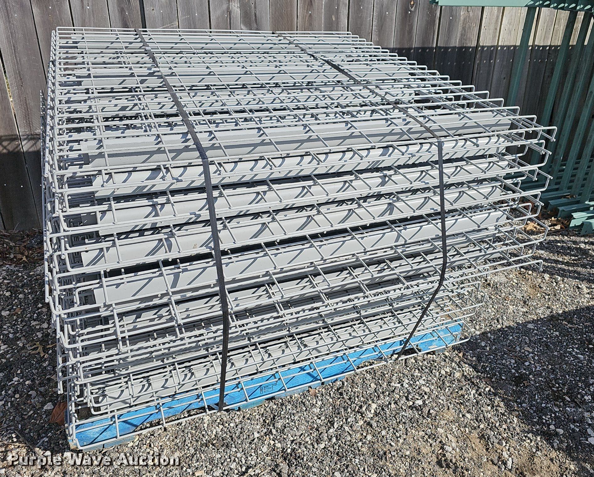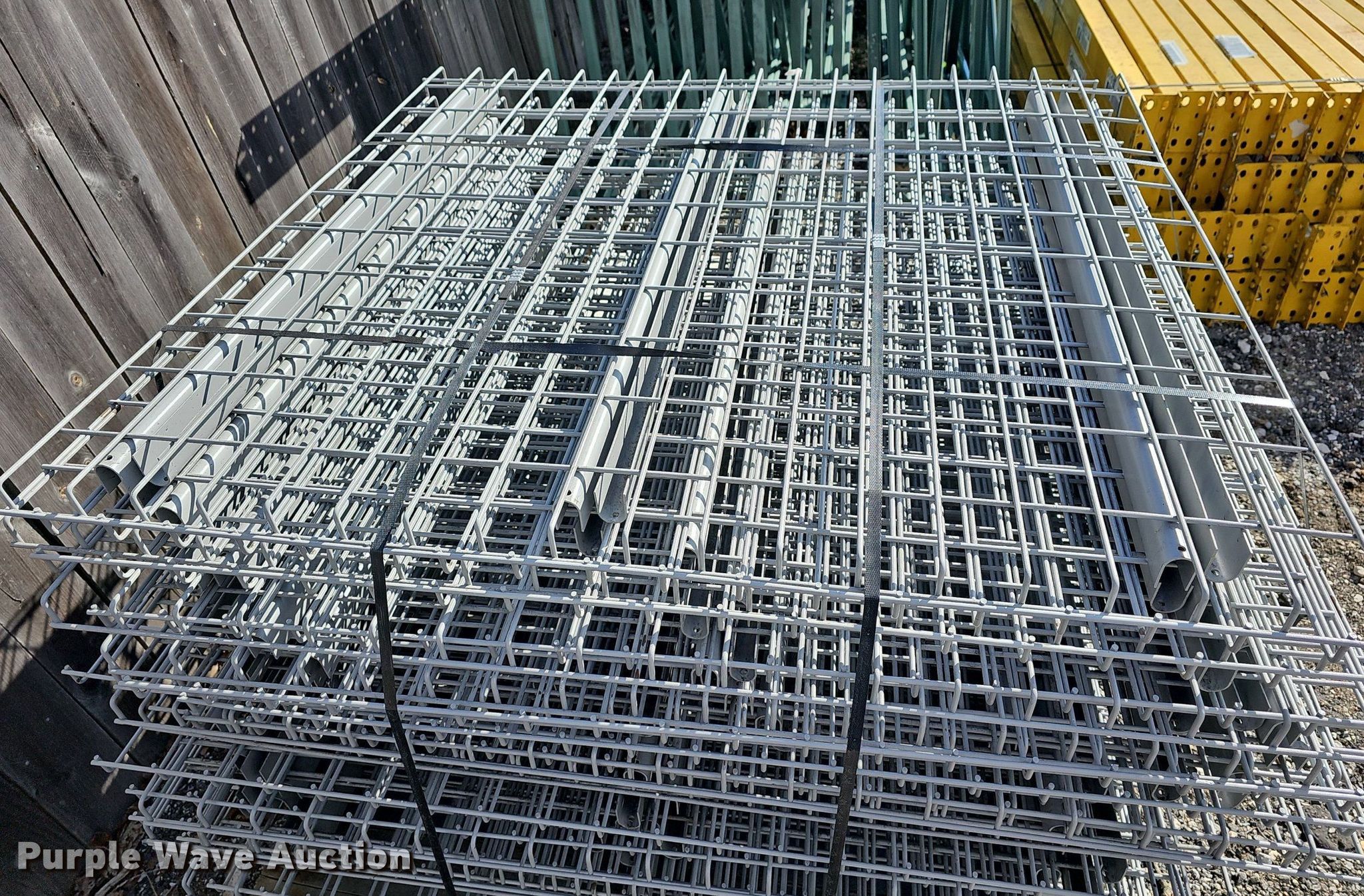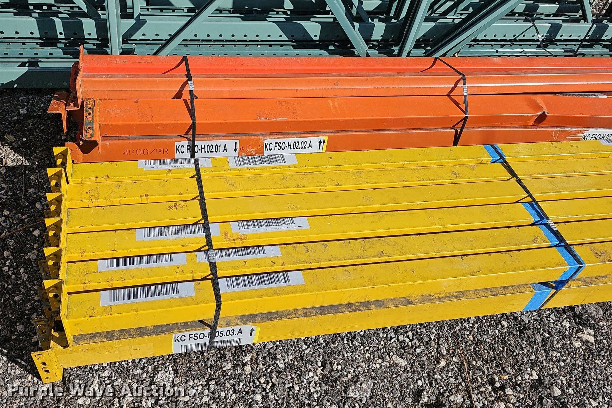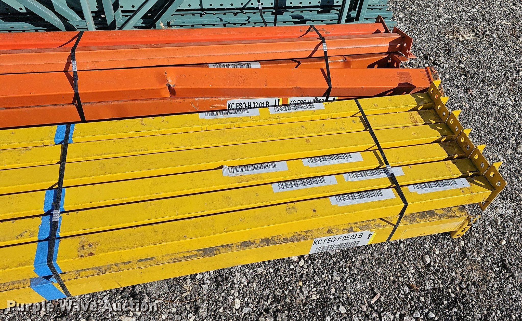 Purple Wave is selling a used Pallet Racking in Kansas. This item is a Pallet racking with the following: Uprights, Size:18', (3) 14', (8) 16', (6) uprights have damage, Cross braces, (70) 8', Cross Braces, (9) 8', Damaged, (26) basket/shelves, Size: 4' x 4'
