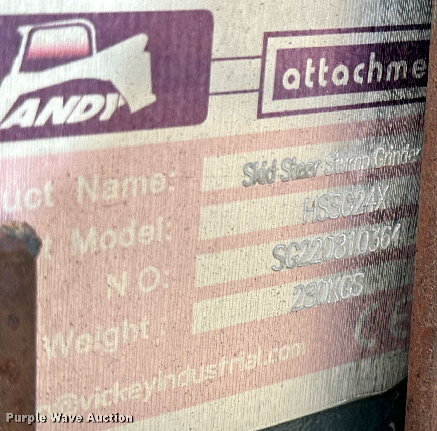 Purple Wave is selling a used Skid Steer Attach. in Kansas. This item is a Handy HSSG24X skid steer stump grinder with the following: Serial: SG220810364, Overall: 66" L x 45" W, Blade Diameter: 24", Operating weight: 606 lbs