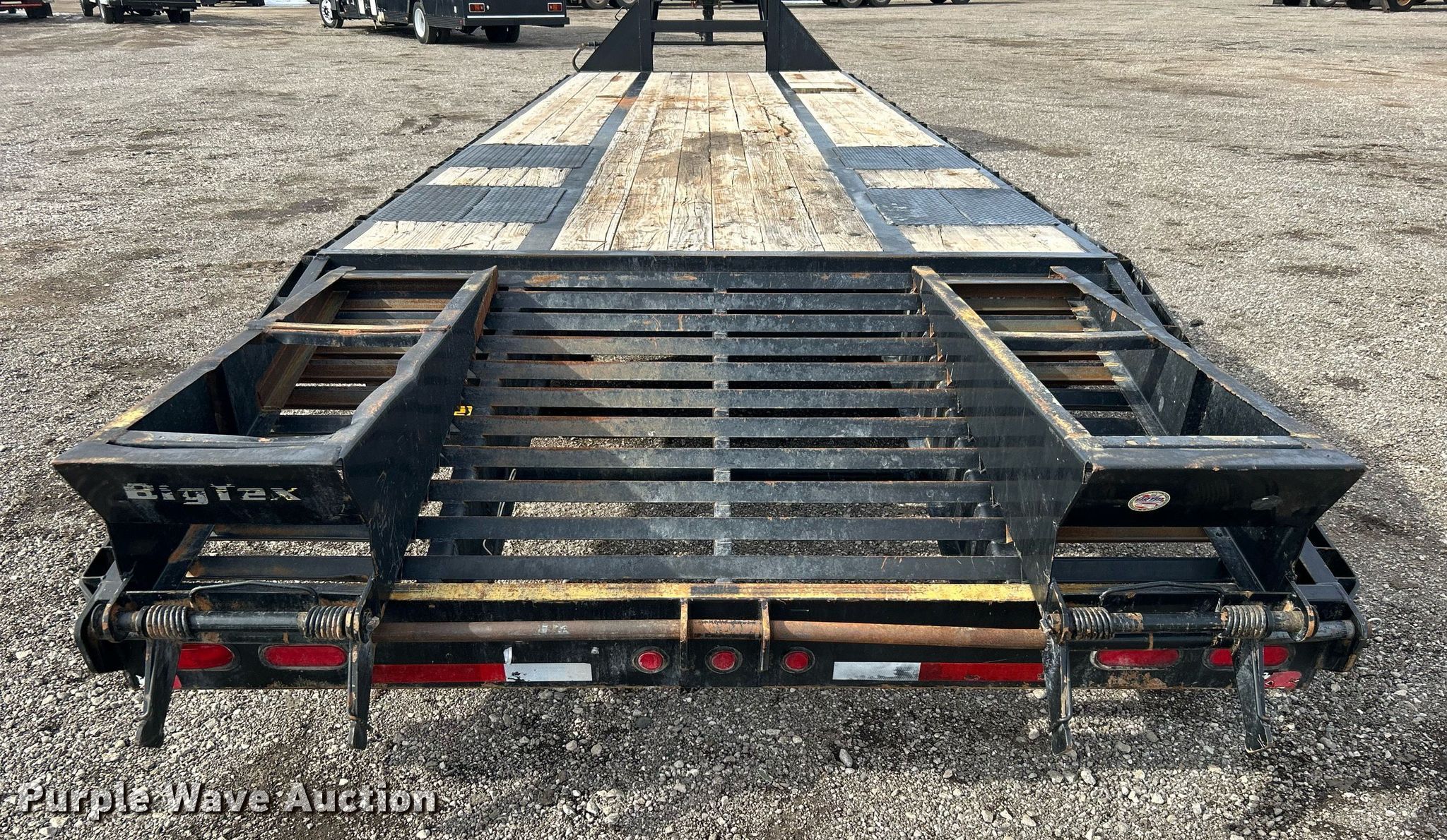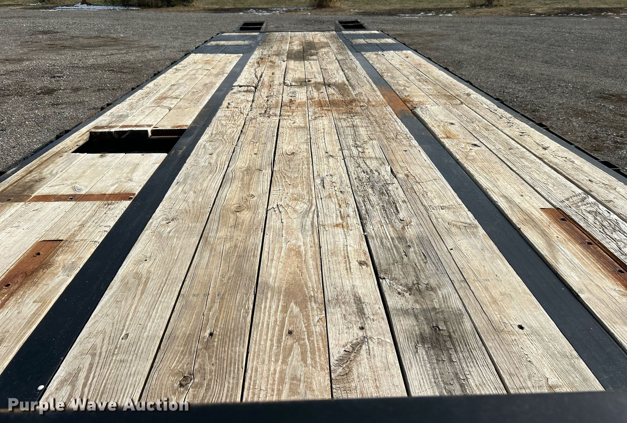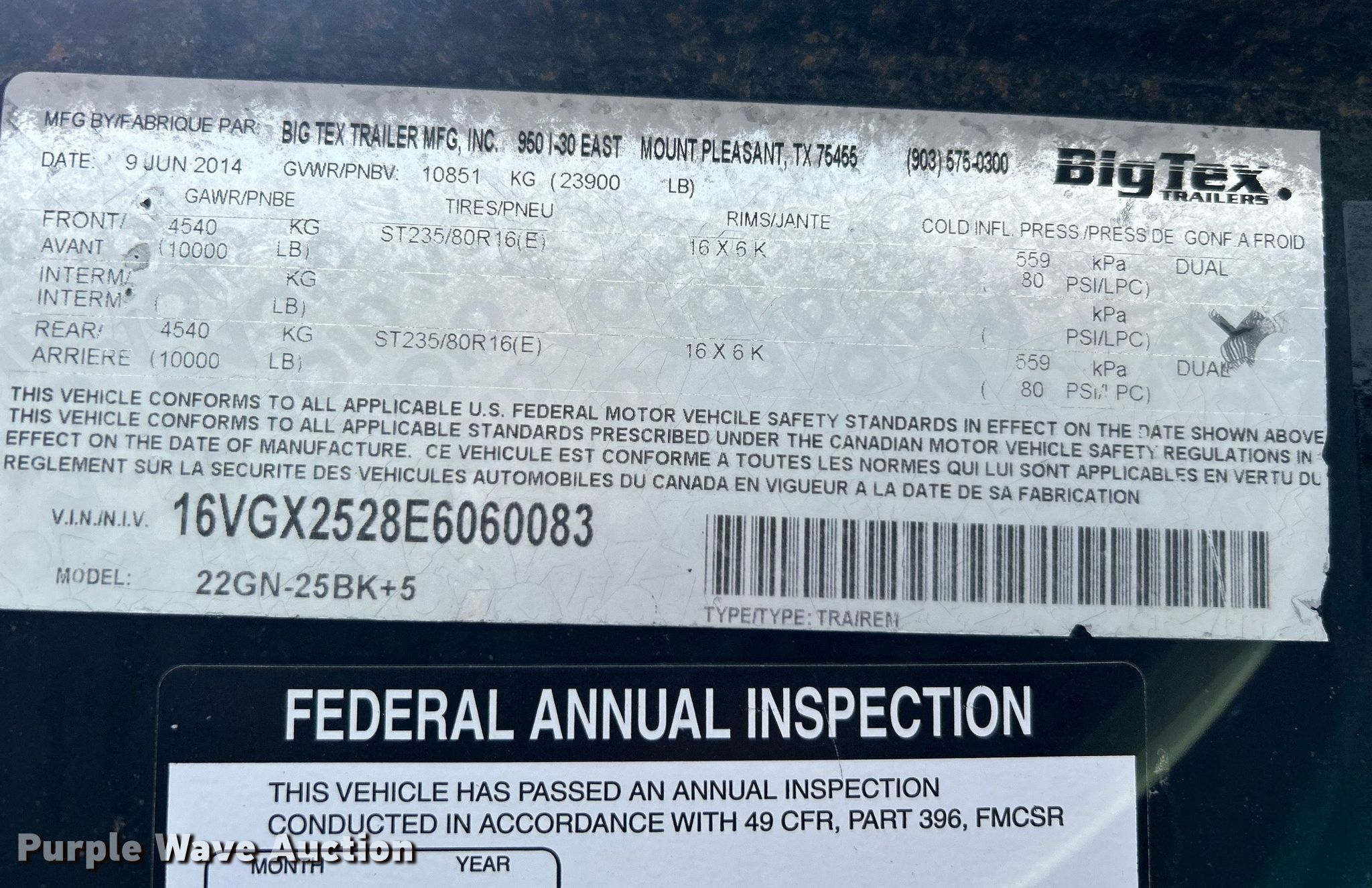 2014 Big Tex 22GN-25BK+5 equipment trailer. VIN: 16VGX2528E6060083. Dimensions Overall: 43' L x 102" W, Deck: 25' L x 93" W, Tail length: 5', Ramps: Manual Length: 5' 4". Features Deck type: Wood. Chassis Hitch: Gooseneck, Landing gear: Dual, Suspension: Spring, Brakes: Electric, Axles: Tandem, GVWR: 23,900 lbs, GAWR: 10,000 lbs. Tires Steel wheels, Size: ST235/80R16. Notes Deck boards missing. Oklahoma title. Title distribution may be delayed up to 14 days from verification of funds. 15107 North 137th East Avenue. Collinsville, OK 74021