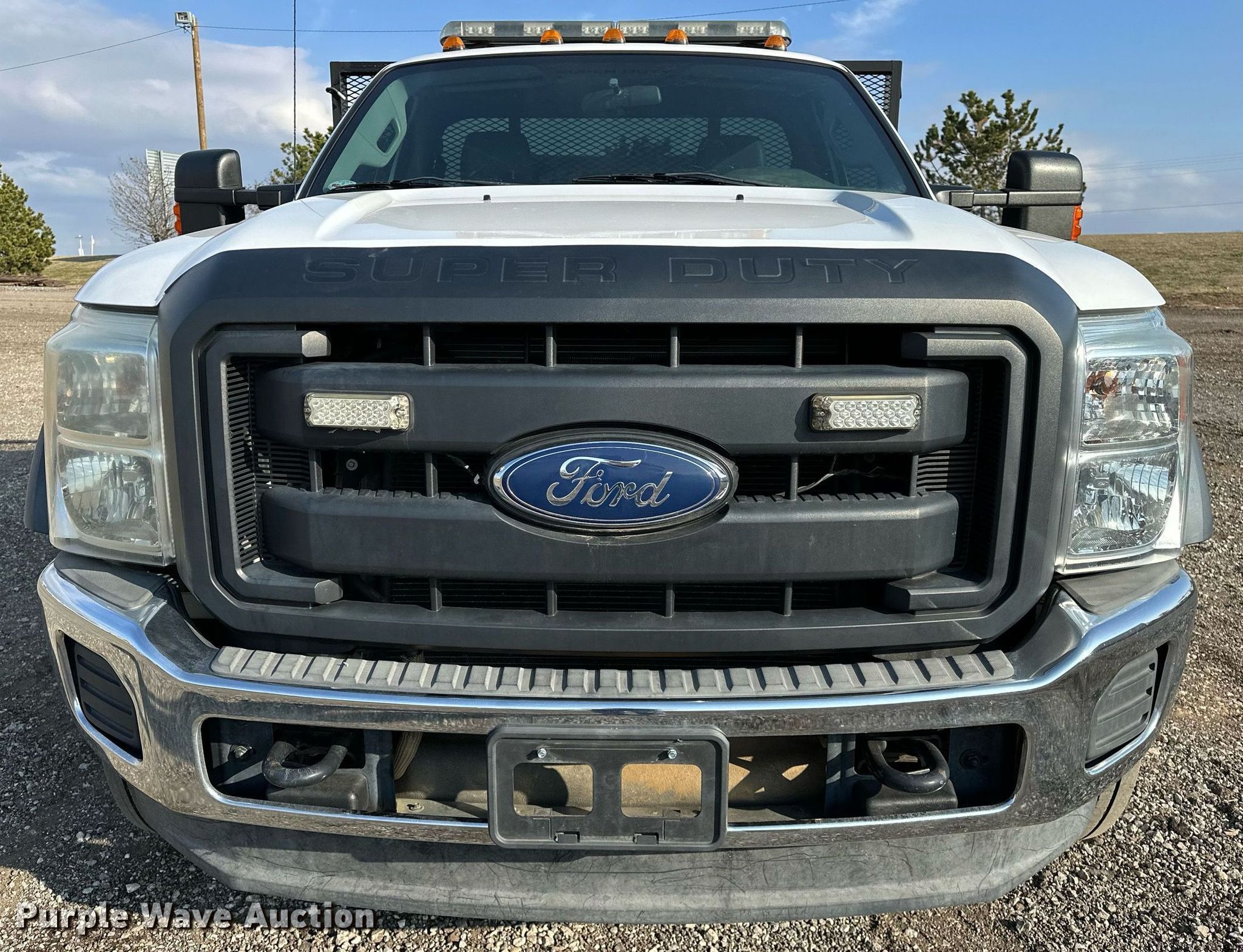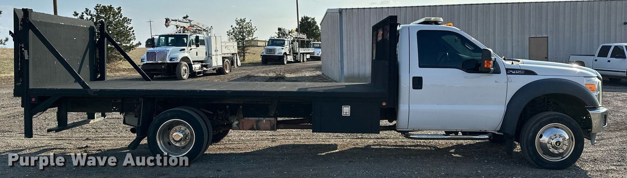 2015 Ford F450 Super Duty flatbed truck. Miles: 66,030 on odometer, VIN: 1FDUF4HY3FEC10228. Engine Displacement: 6.8L, Cylinders: 8, Fuel type: Gas. Transmission Automatic. Chassis Four wheel drive, Axles: Single, Suspension: Spring, Brakes: Hydraulic, GVWR: 16,500 lbs. Interior AC, Heat, Heated mirrors, Power windows, Power locks, Cruise control, Auxiliary controls. Features Flatbed 16' 6" L x 96" W, End gate lift. Tires Size: 225/70R19.5. Notes Windshield chipped or cracked, Non-operational passenger side power lock switch. Oklahoma title. Title distribution may be delayed up to 14 days from verification of funds. 15107 North 137th East Avenue. Collinsville, OK 74021