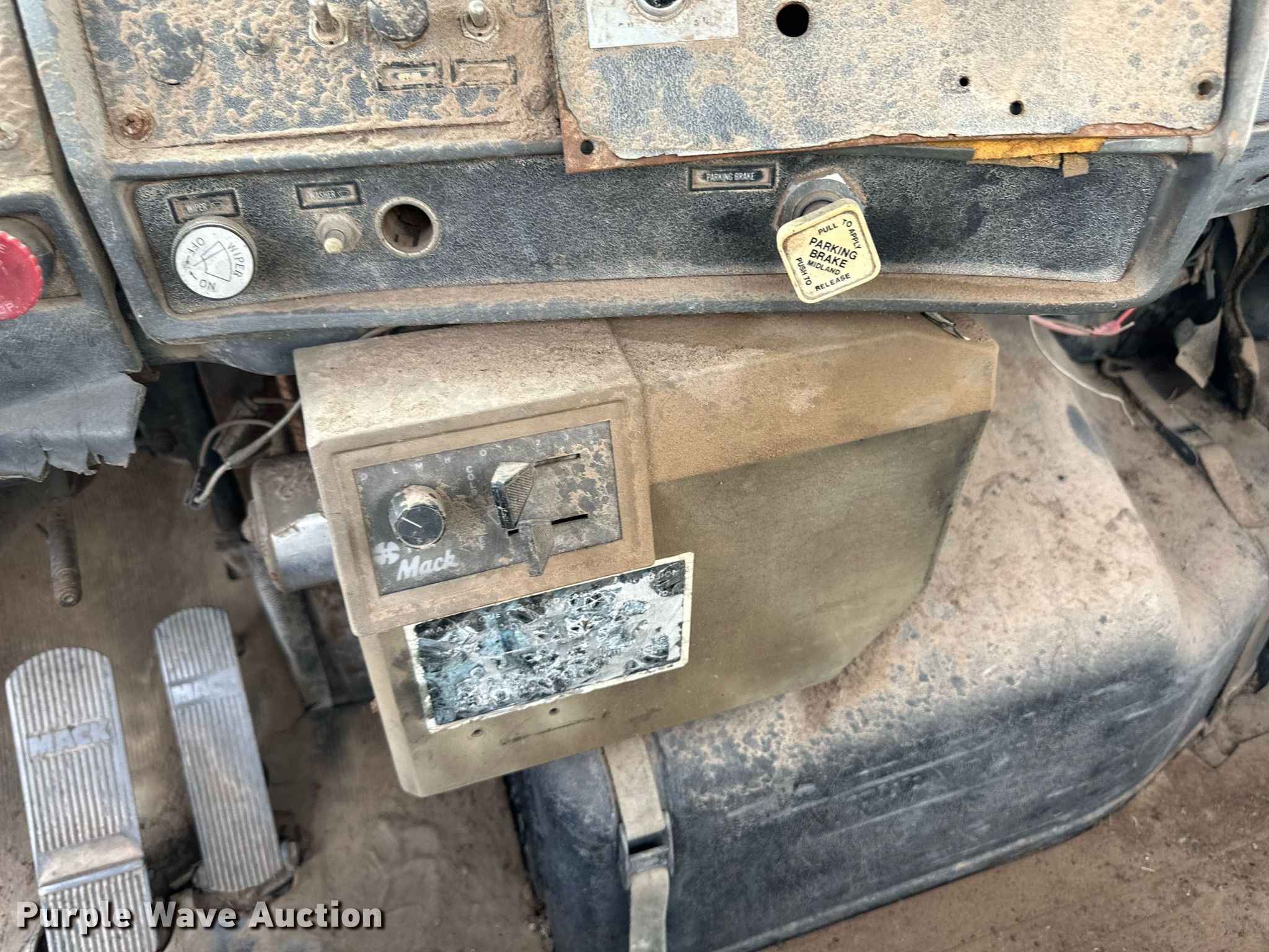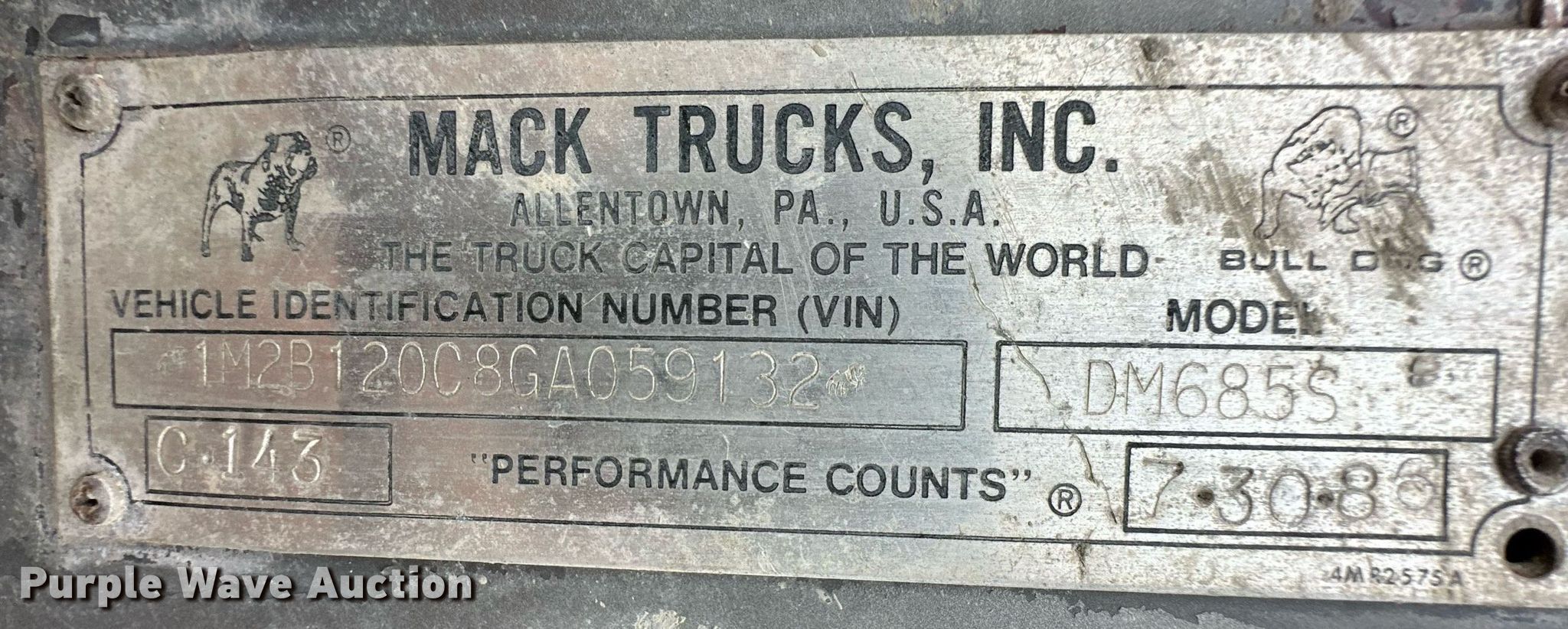 1986 Mack DM685S ready mix truck. Miles: 160,029 on odometer, Hours: 4,255 on meter, VIN: 1M2B120C8GA059132. Engine Mack, Cylinders: 6, Fuel type: Diesel. Transmission Manual. Chassis Axles: Tandem, Suspension: Spring, Brakes: Air, Front mount PTO. Interior Heat. Features Mixer Discharge: Rear, In-cab controls, Rear drum controls, Chute Extensions: 3, Chute type: Steel.. Tires Front: 425/65R22.5, Rear: 10.00R20. Oklahoma title. Title distribution may be delayed up to 14 days from verification of funds. 4215 Oklahoma Avenue. Woodward, OK 73801