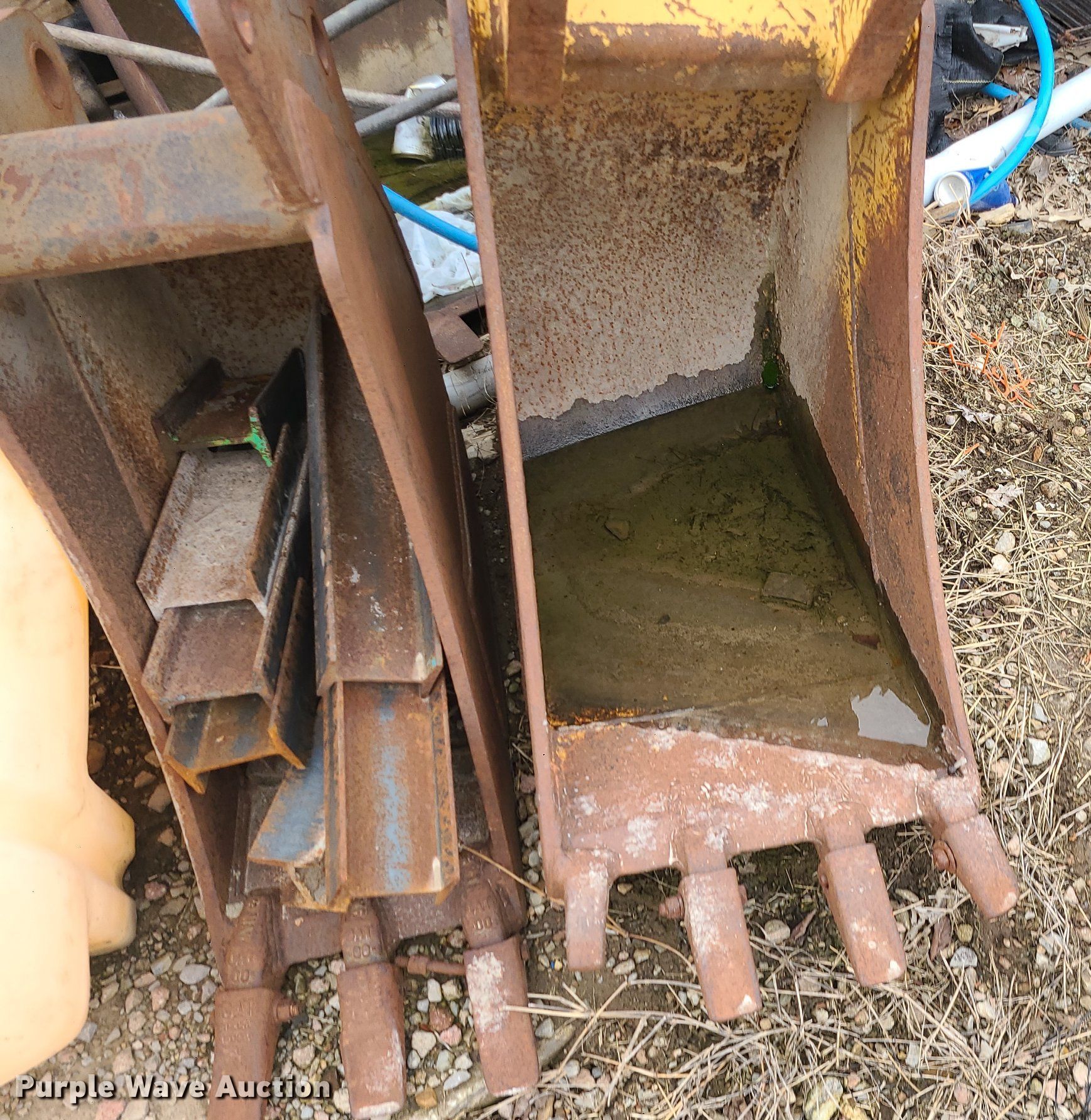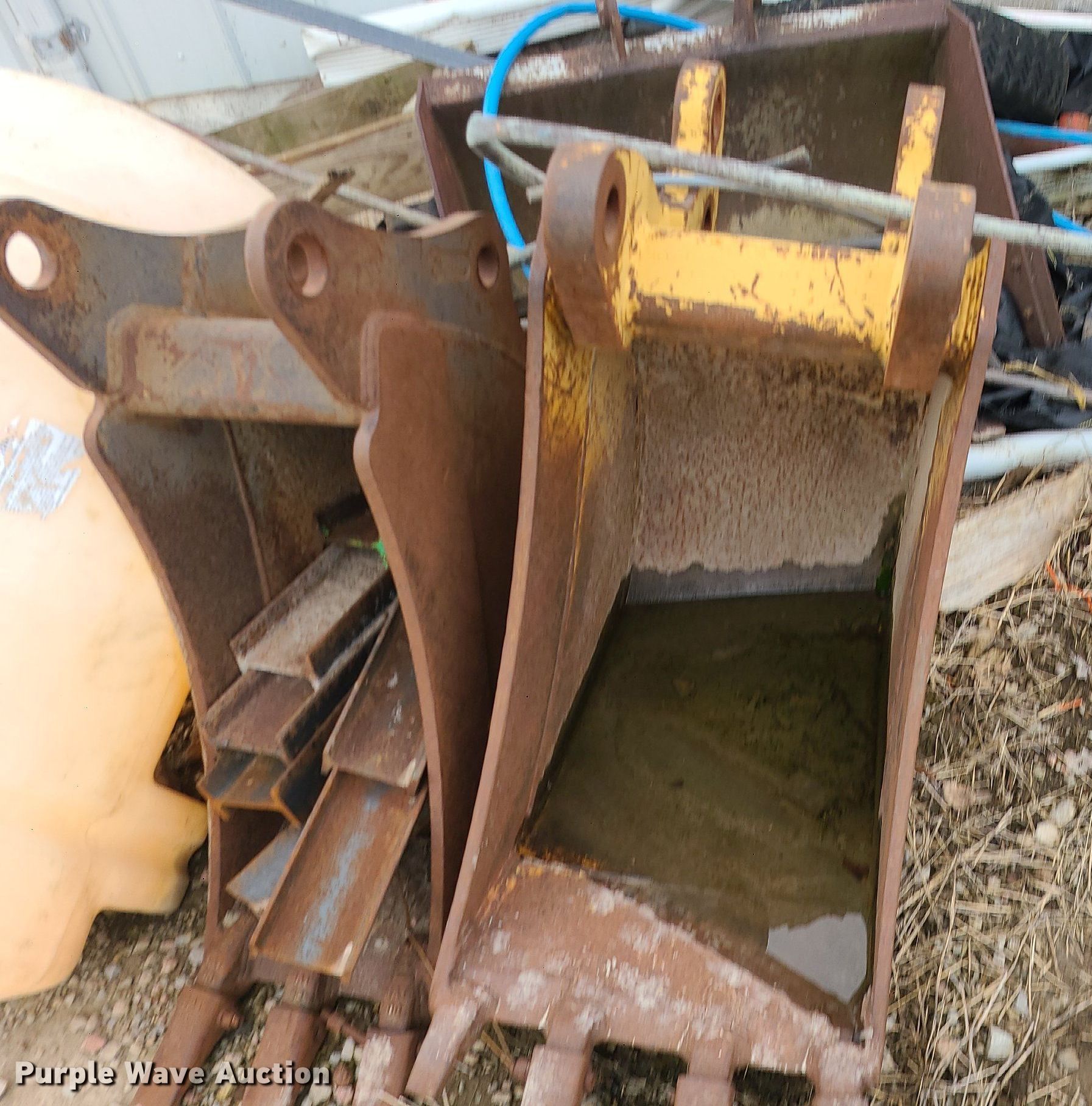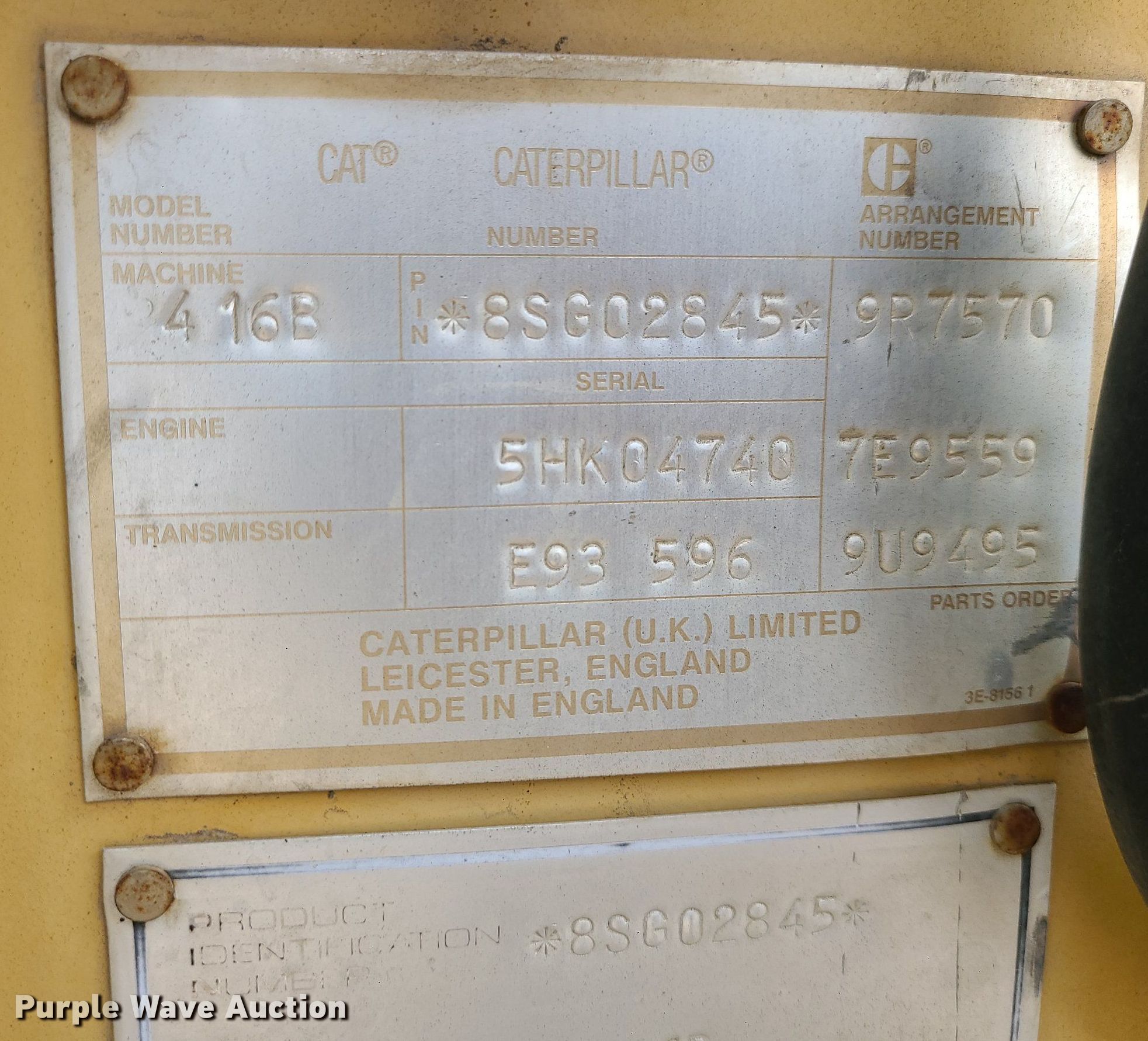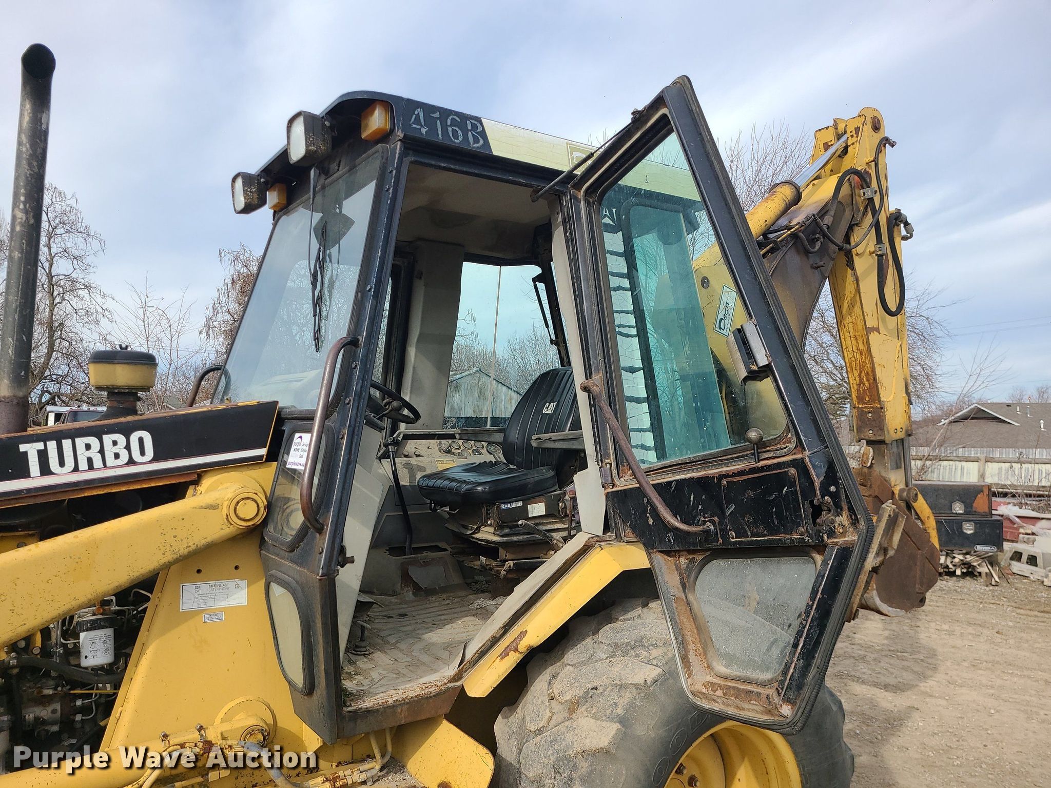 1993 Caterpillar 416B backhoe. Hours: 11,122 on meter, Serial: 8SG02845. Engine Cylinders: 4, Fuel type: Diesel. Transmission Shuttle shift, 4F - 4R. Chassis Four wheel drive, Differential lock. Operators station Enclosed cab, Heat, Backhoe controls: Wobble stick / two stick. Features Loader Bucket Width: 88", Cutting edge: Bolt-on, Backhoe Extendable stick, Width: 24", Teeth: 4. Tires Front: 11-16, Rear: 13.5-24. Notes Non-operational brakes, Hydraulic oil leak. Tracy & Wegener Inc.. 106 W 22nd St. Higginsville, MO 64037