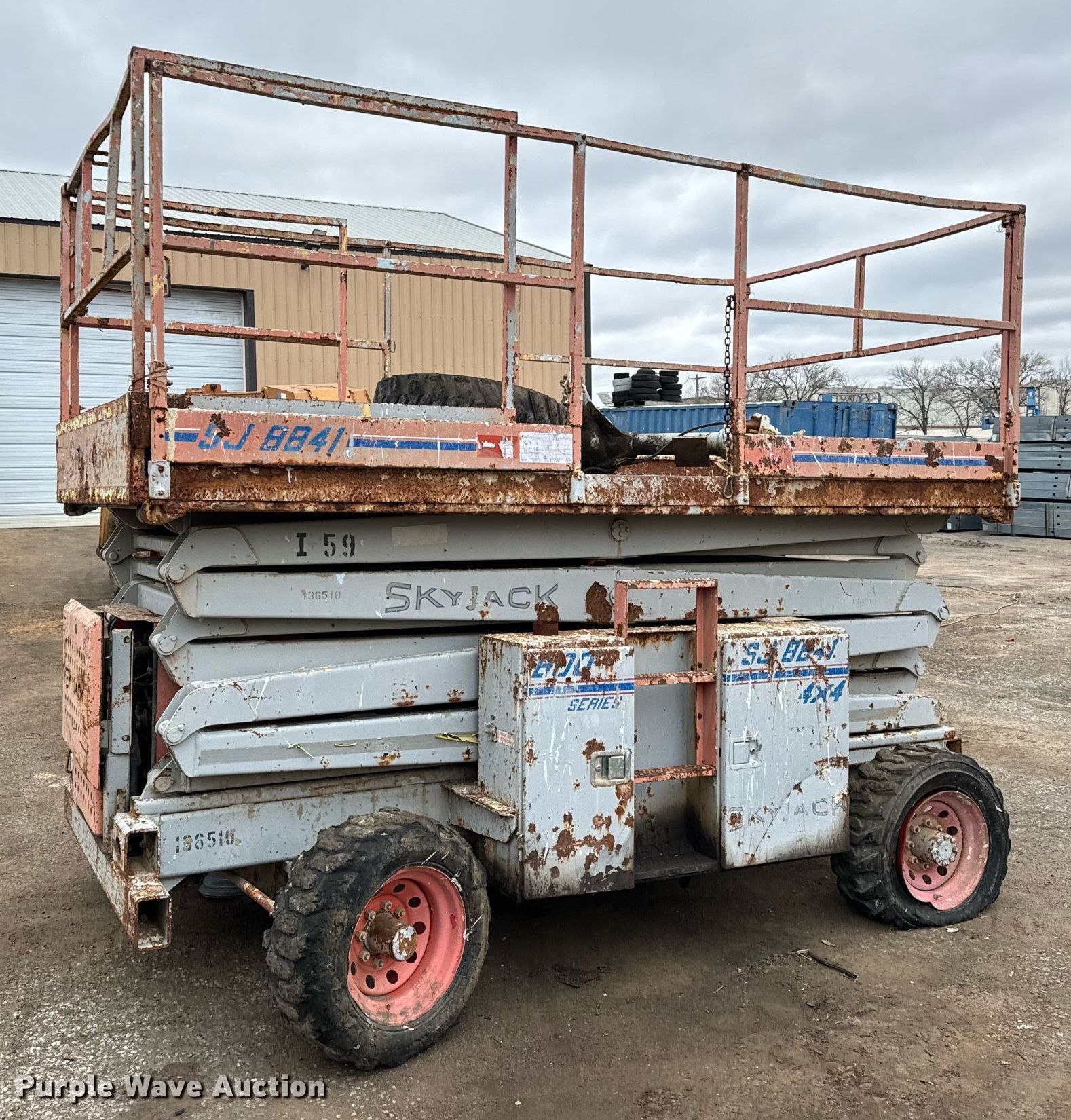 Purple Wave is selling a used Scissor or Vertical Lift in Kansas. This item is a Skyjack SJ8841 scissor lift with the following: Hours: 3,767 on meter, Serial: 41849