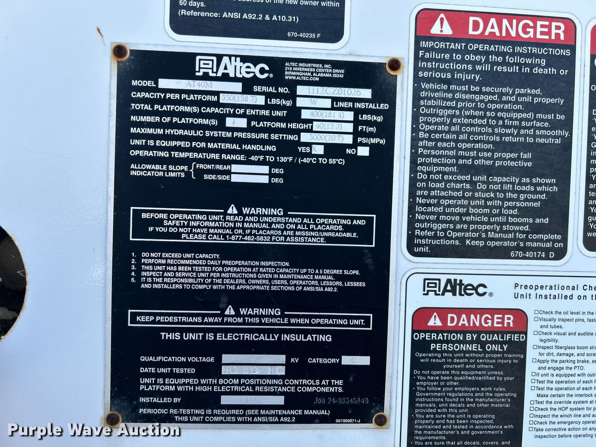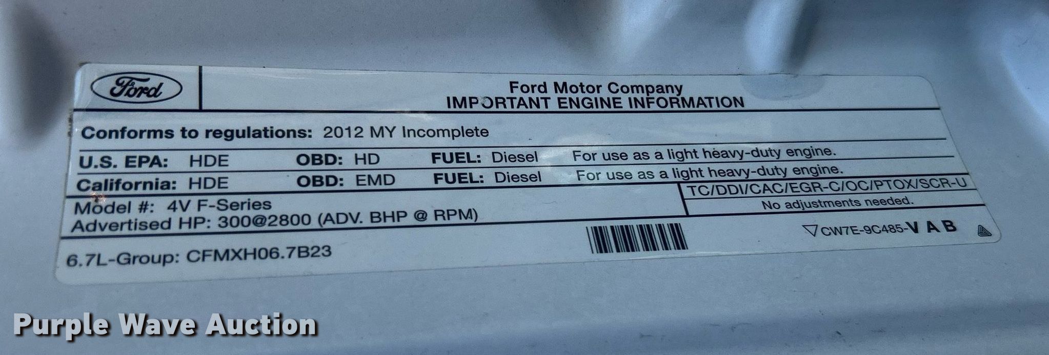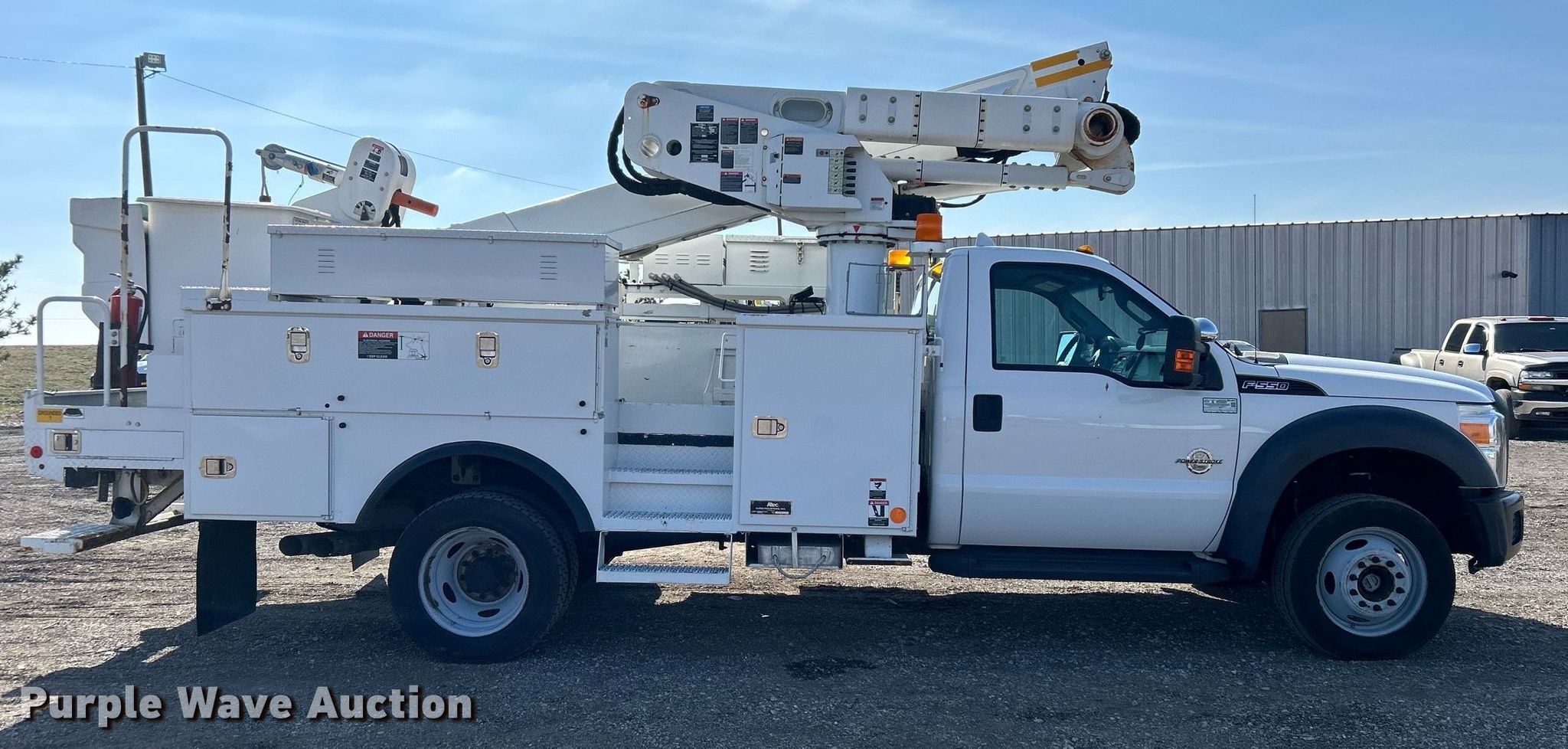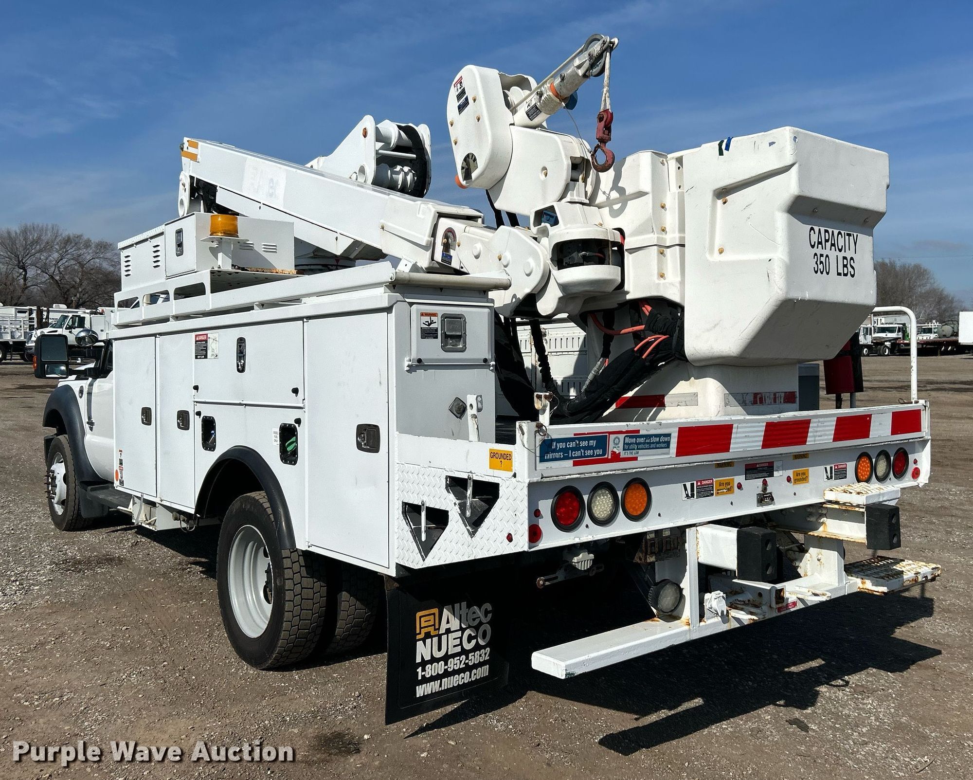 2012 Ford F550 Super Duty bucket truck. Miles: 115,825 on odometer, VIN: 1FDUF5HTXCEC49713. Engine Displacement: 6.7L, Cylinders: 8, Fuel type: Diesel. Transmission Automatic. Chassis Four wheel drive, Axles: Single, Suspension: Spring, Brakes: Hydraulic, PTO, GVWR: 19,500 lbs, Wheelbase: 165". Interior AC, Heat, Heated mirrors, Power windows, Power locks, Cruise control, Auxiliary controls, Brake controller. Features Bed Altec, 11' 2" L x 94" W, Boom 2012 Altec AT40M, Serial: 1112CZ01026, Maximum lift capacity: 350 lbs, Maximum lift height: 40', Boom type: Articulating, Insulated, Telescopic, Man basket, Boom controls Platform/ basket, Material handler. Tires Size: 225/70R19.5. Oklahoma title. Title distribution may be delayed up to 14 days from verification of funds. 15107 North 137th East Avenue. Collinsville, OK 74021