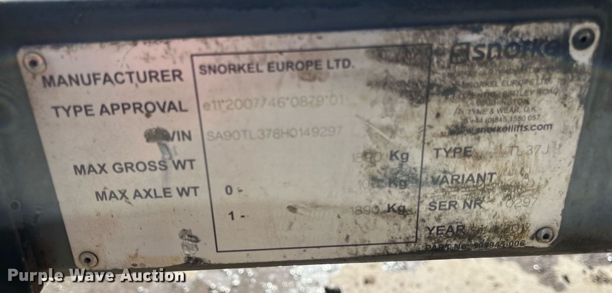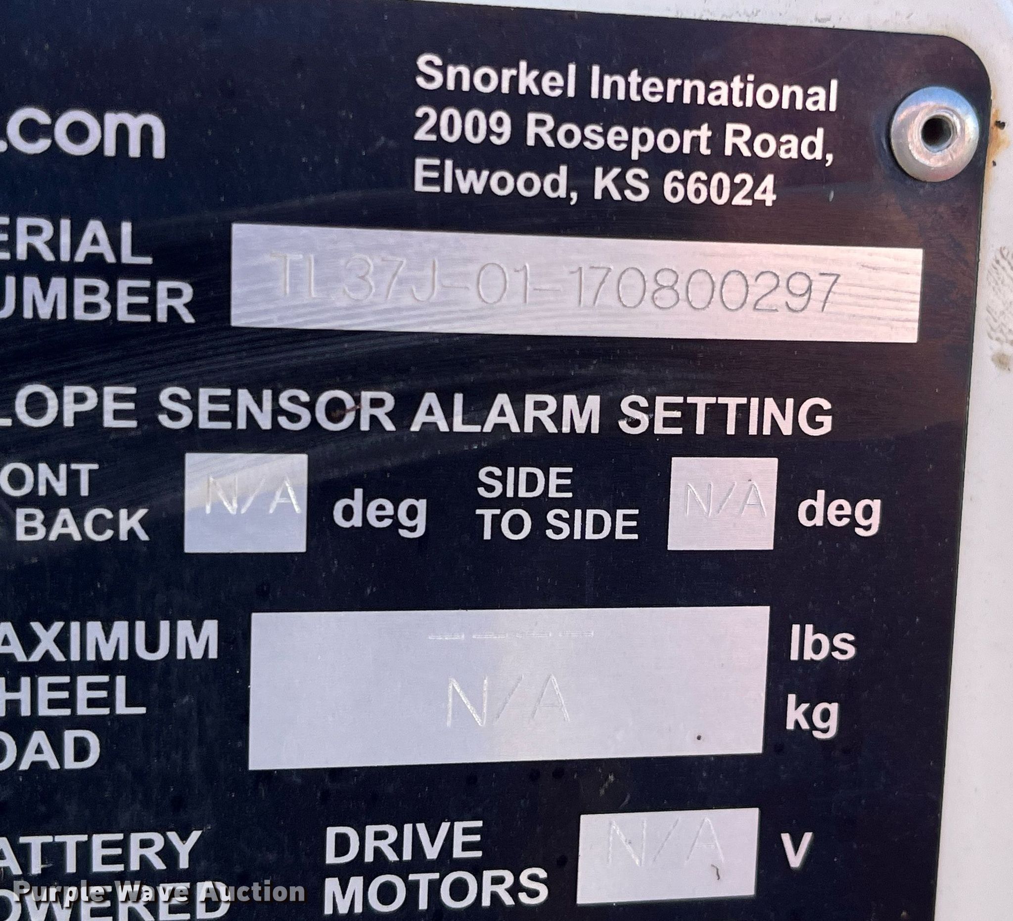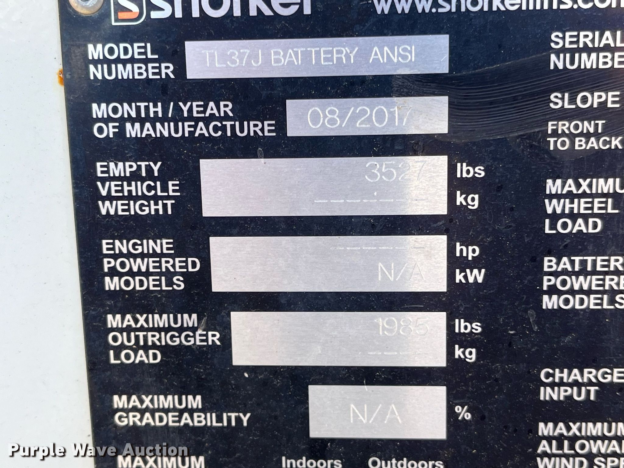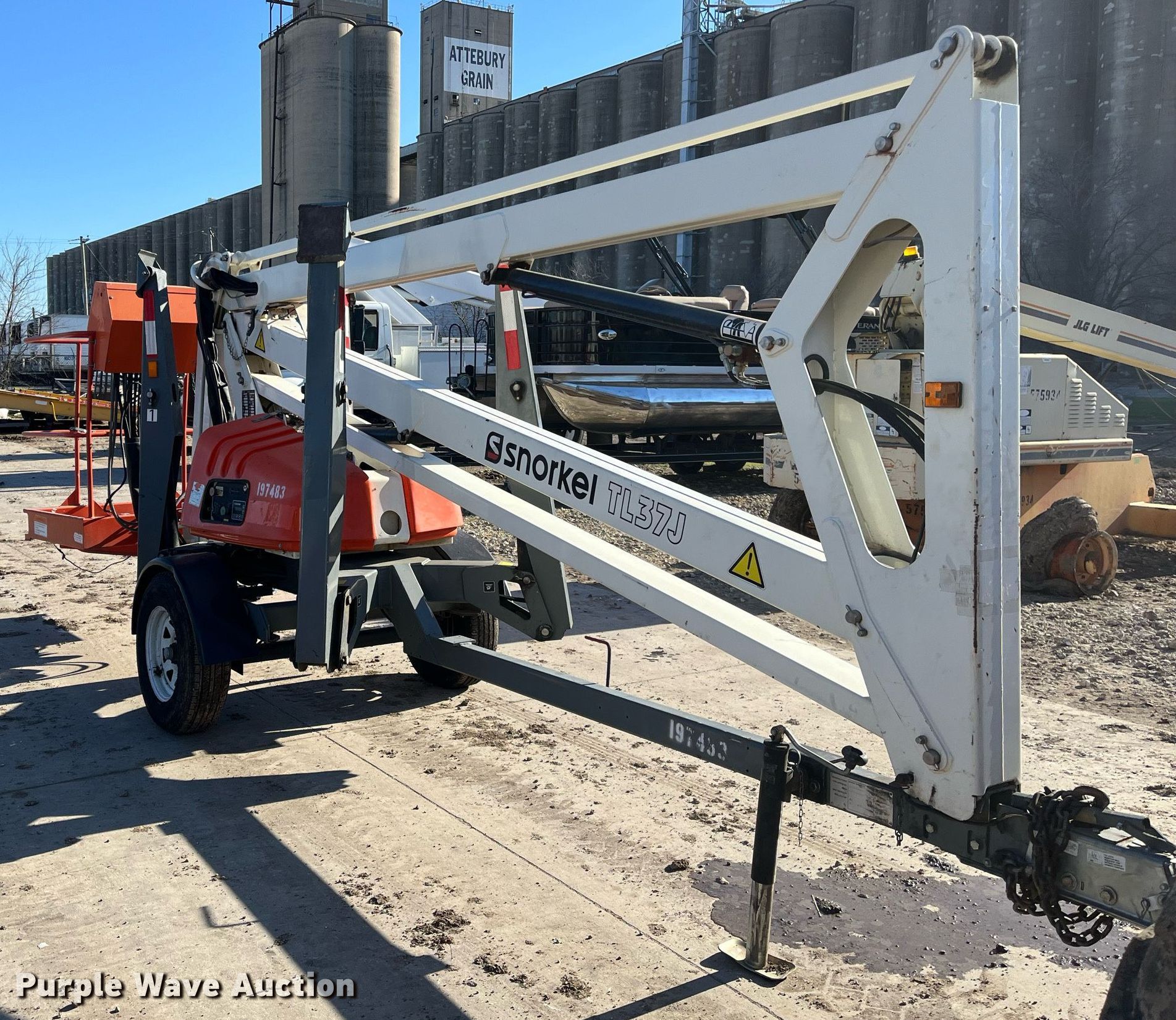 2017 Snorkel TL37J boom lift. Hours: 65,535 on meter, VIN: SA90TL378H0149297, Serial: TL37J01-170800297. Electric Motor Volts: 24. Features Articulating, Tow behind, Maximum lift capacity: 474 lbs, Maximum reach length: 19' 4", Maximum lift height: 35' 9", Hydraulic outriggers, Hydraulic extendable jib, Hydraulic leveling, Platform: 47" L x 33" W, AC power outlet, Controls: Platform, Ground, Platform rotation: Hydraulic. Tires Tire size: 205/75R14. Notes Tractor not included. This is worksite support equipment and will not come with a title. Transfer of ownership documentation will be a bill of sale. North Texas Equipment. 800 Burlington Road. Saginaw, TX 76179