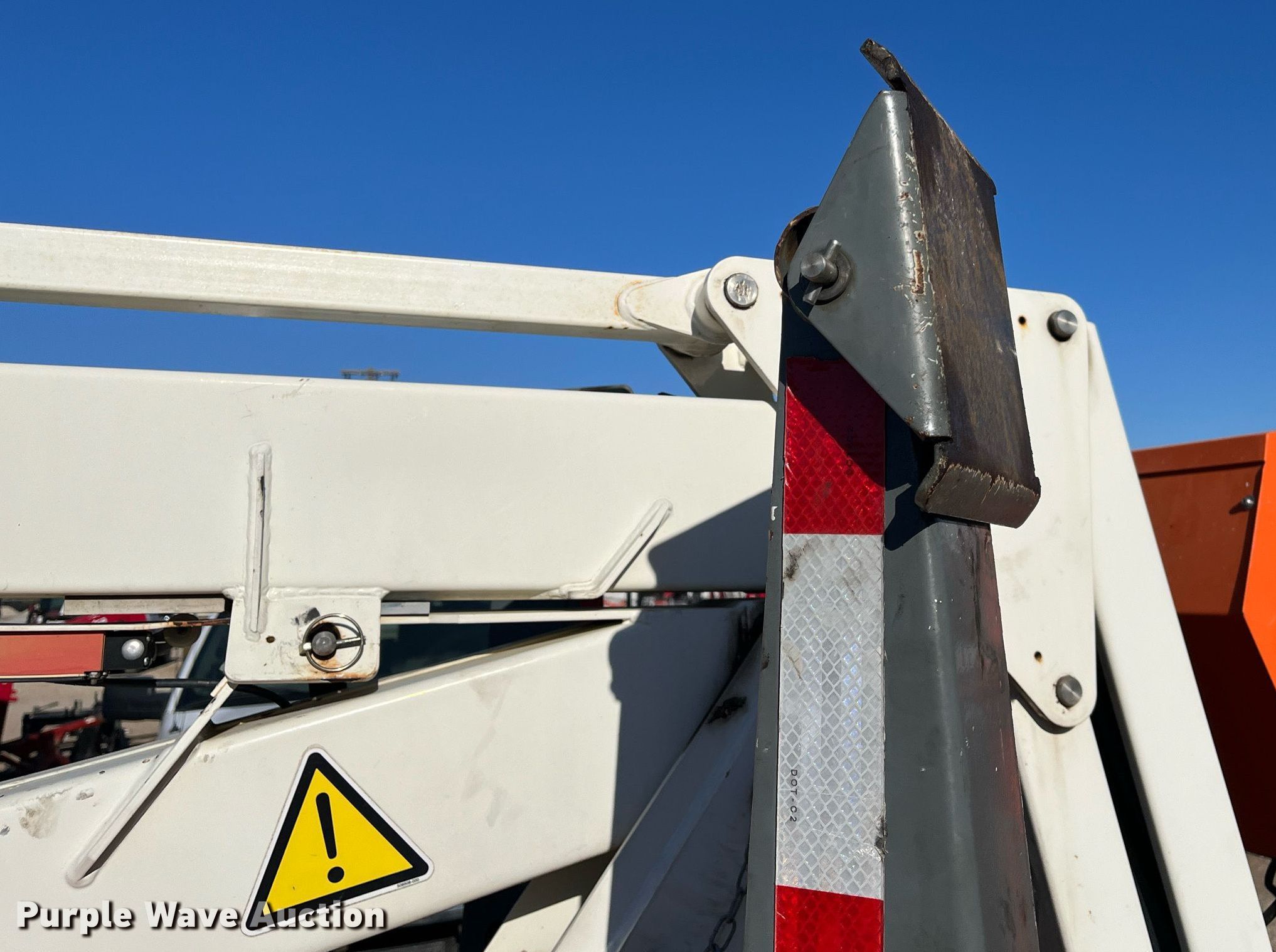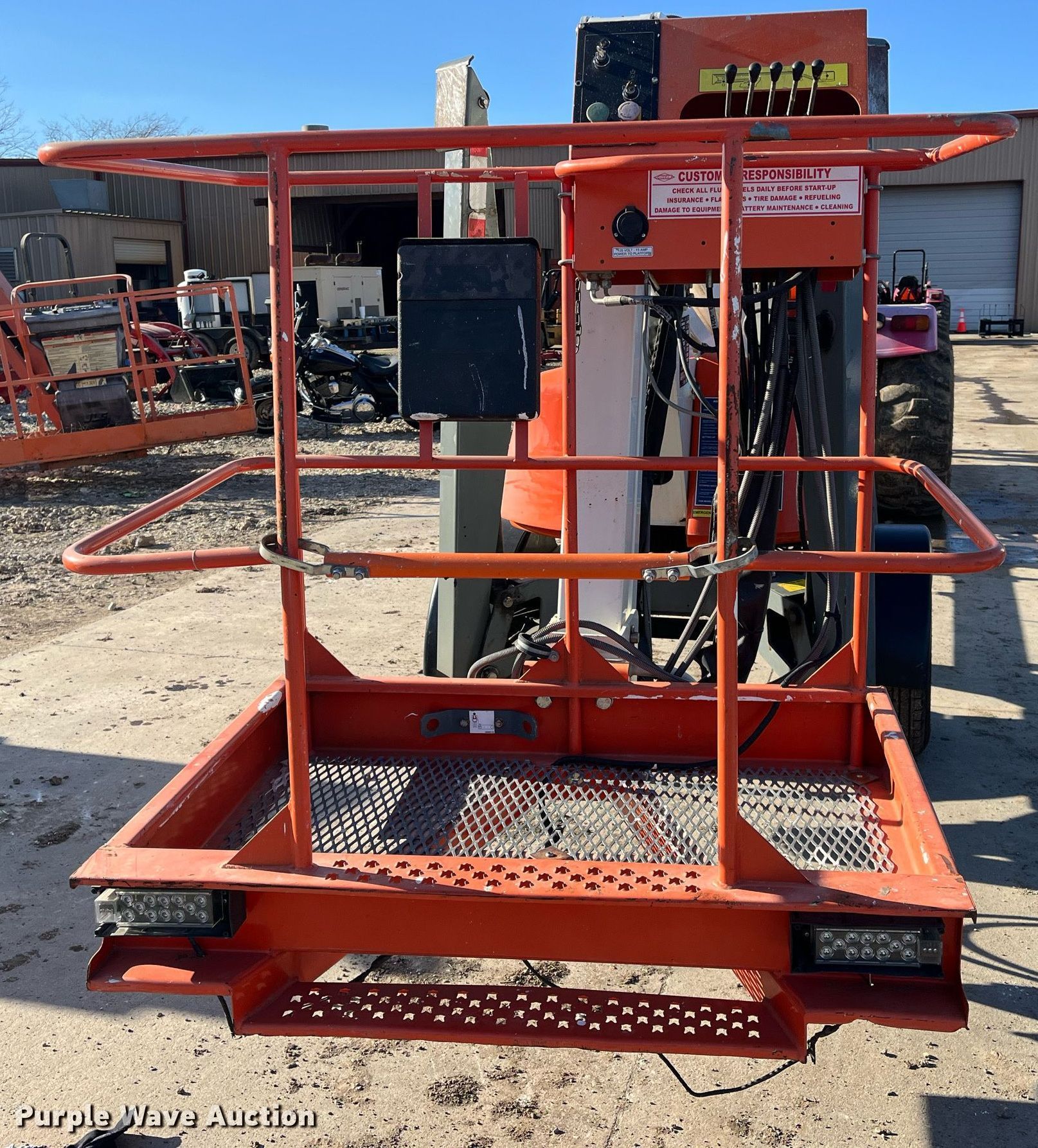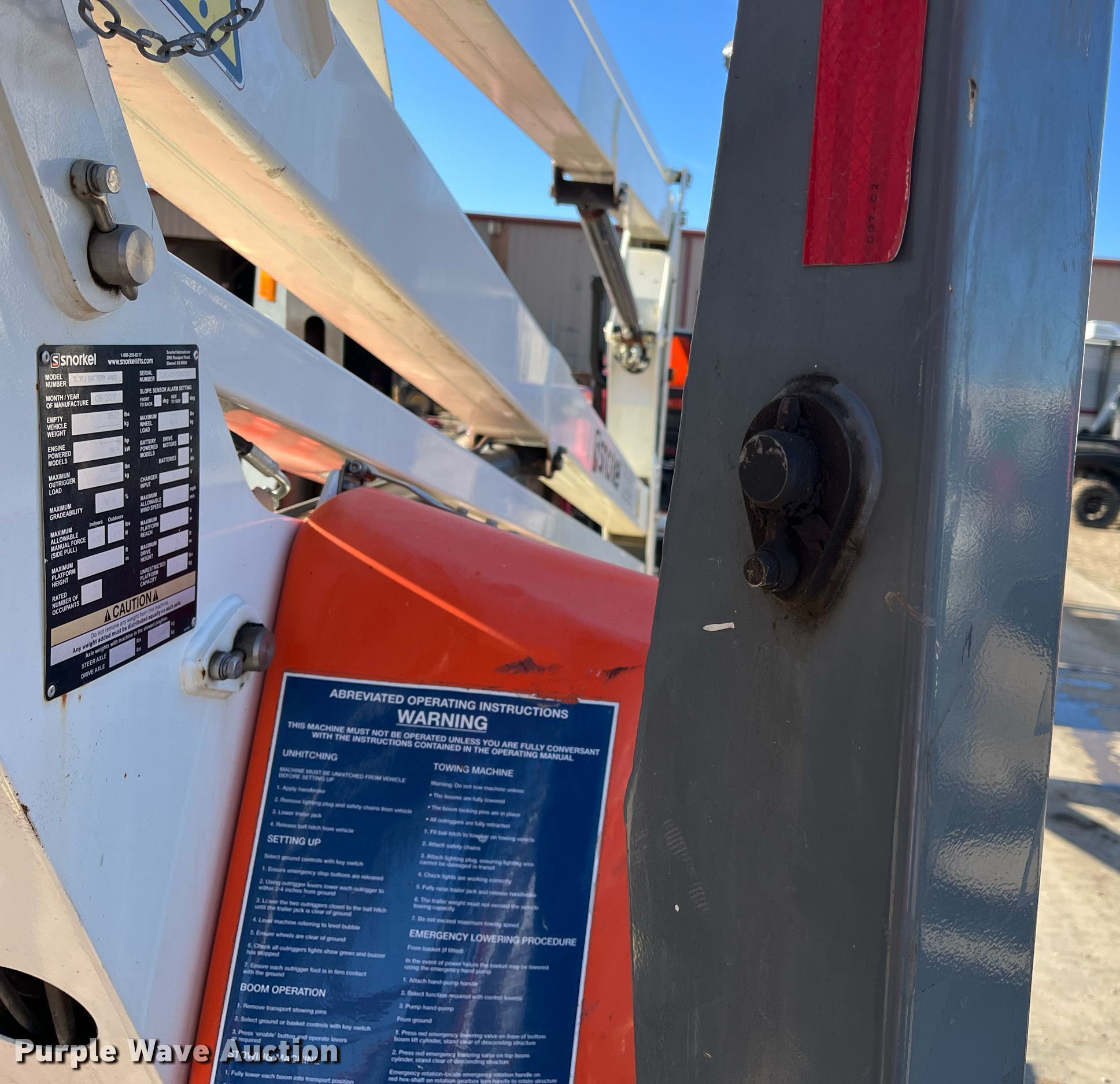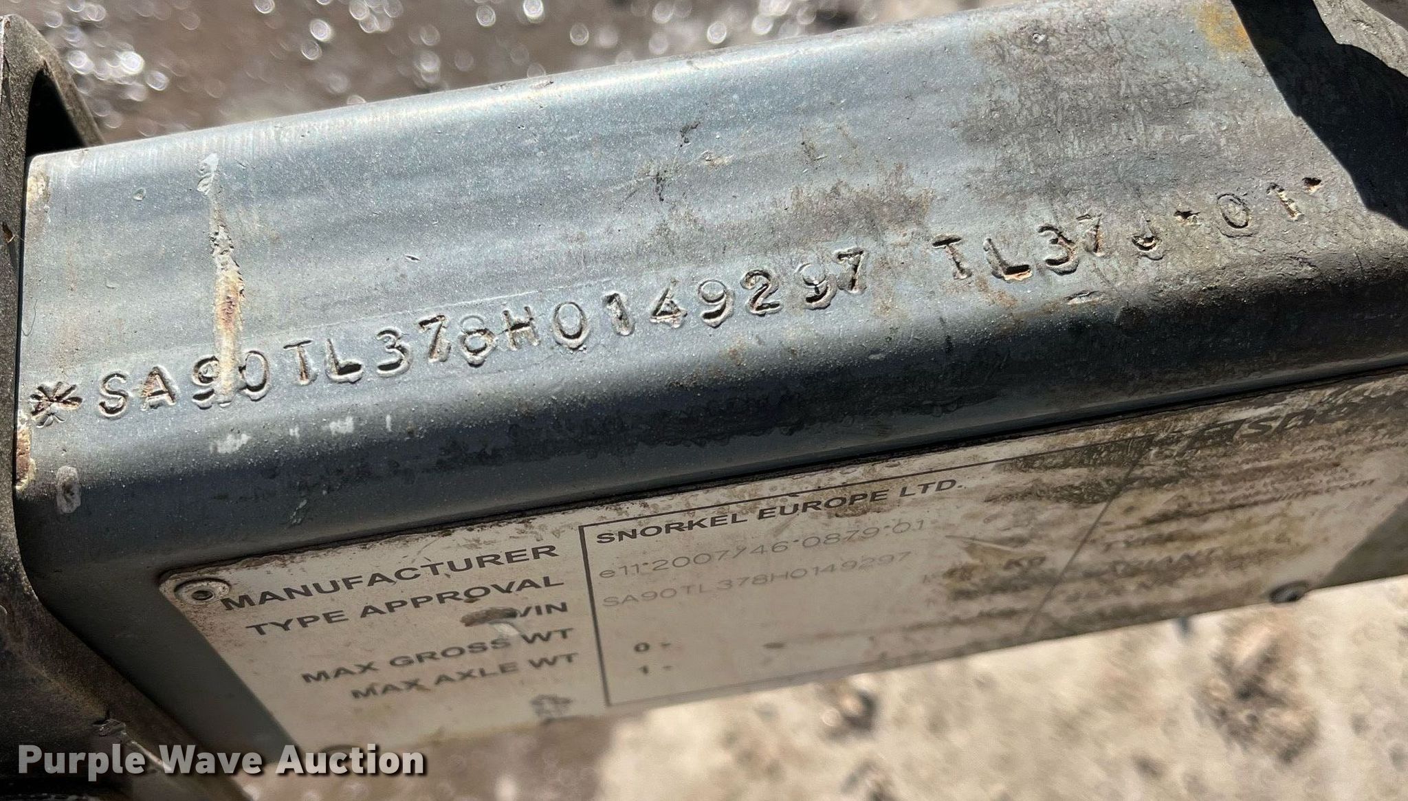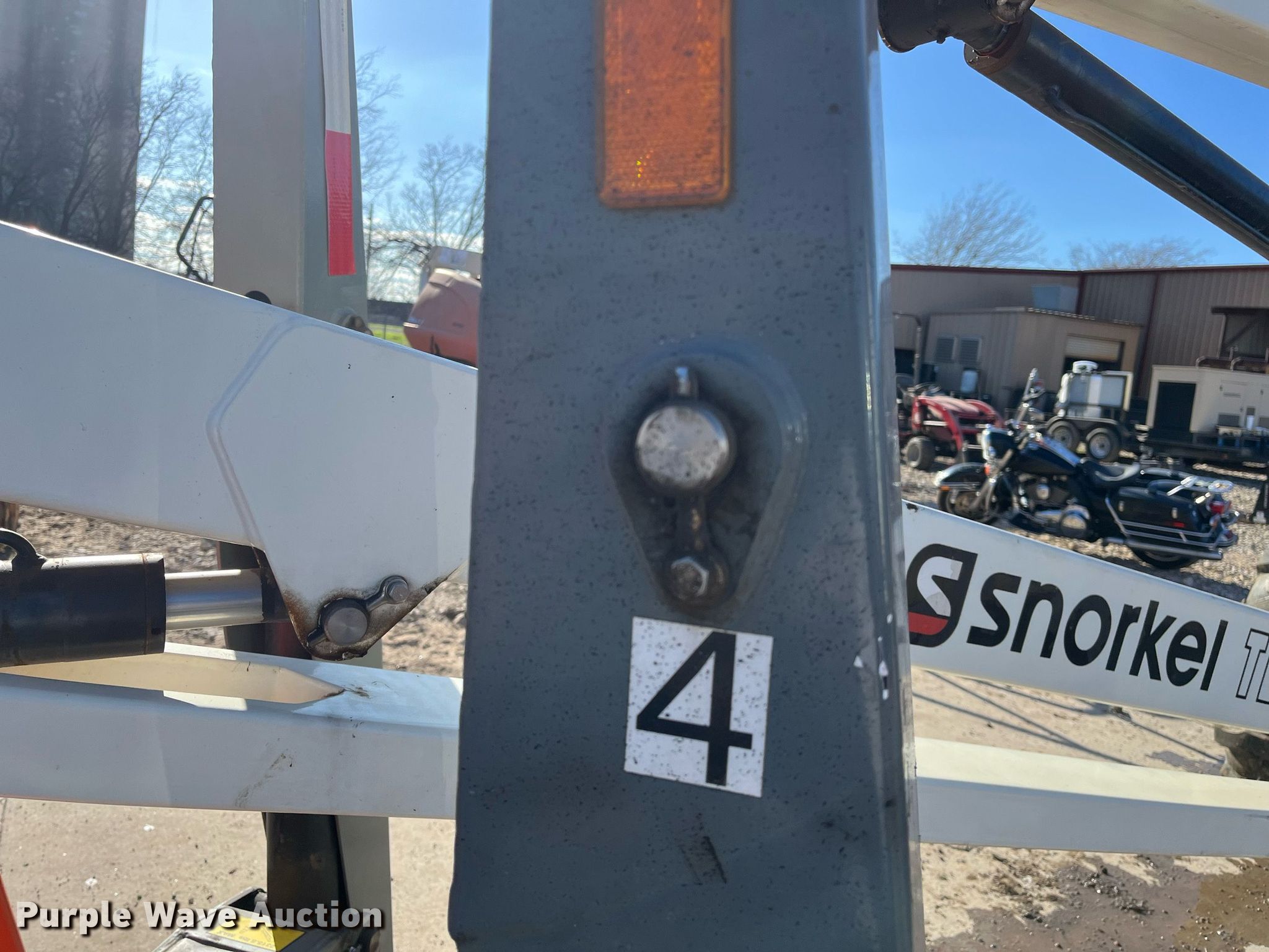 2017 Snorkel TL37J boom lift. Hours: 65,535 on meter, VIN: SA90TL378H0149297, Serial: TL37J01-170800297. Electric Motor Volts: 24. Features Articulating, Tow behind, Maximum lift capacity: 474 lbs, Maximum reach length: 19' 4", Maximum lift height: 35' 9", Hydraulic outriggers, Hydraulic extendable jib, Hydraulic leveling, Platform: 47" L x 33" W, AC power outlet, Controls: Platform, Ground, Platform rotation: Hydraulic. Tires Tire size: 205/75R14. Notes Tractor not included. This is worksite support equipment and will not come with a title. Transfer of ownership documentation will be a bill of sale. North Texas Equipment. 800 Burlington Road. Saginaw, TX 76179