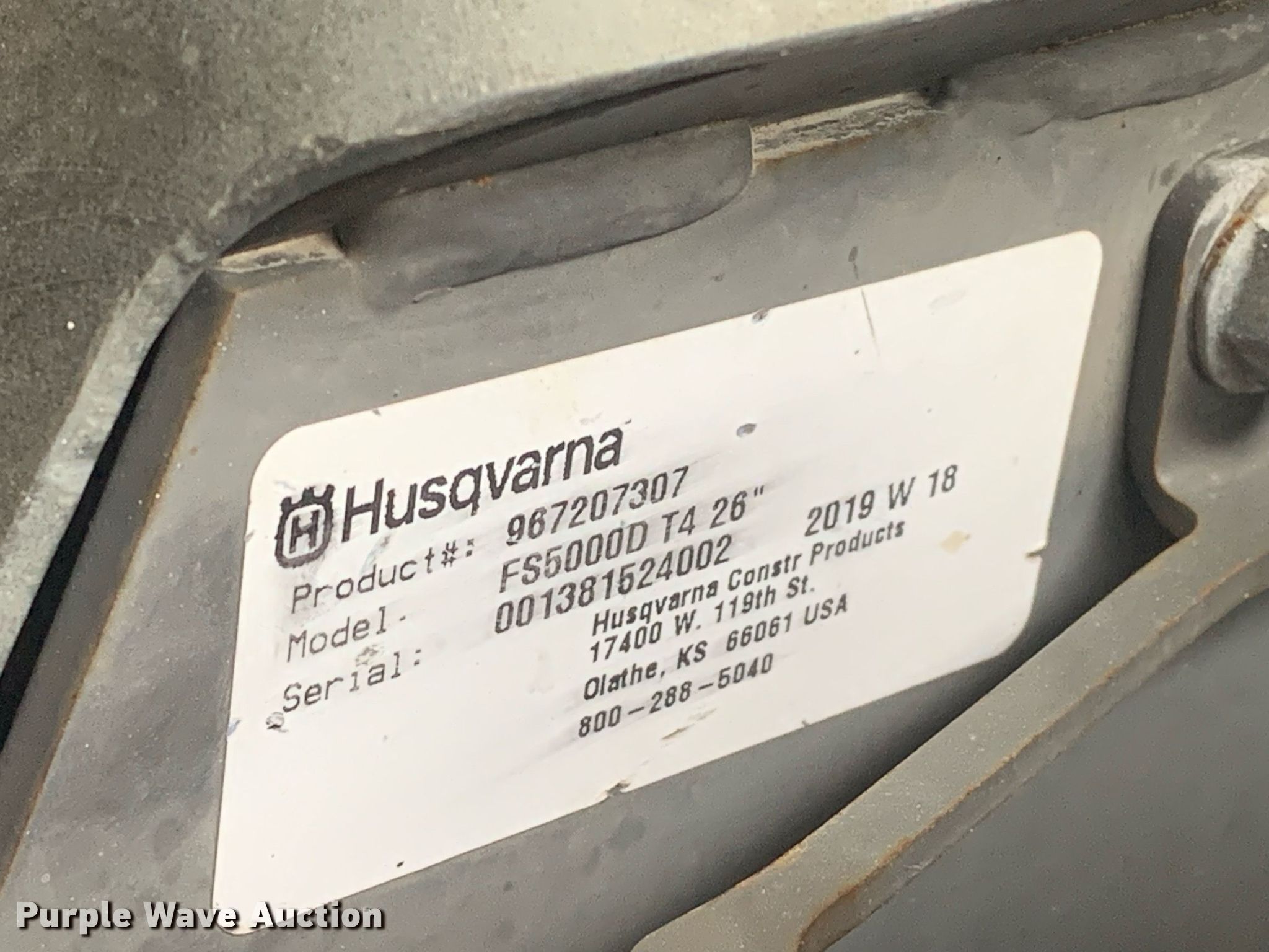 2019 Husqvarna FS 5000D Concrete saw. Hours: 616 on meter, Serial: 001381524002. Engine Yanmar 4TNV88C-DHQ, Displacement: 2.19L, Cylinders: 4, Fuel type: Diesel. Transmission Hydrostatic. Features Blade capacity: 26". 1800 Alsdorf Road. Ennis, TX 75119