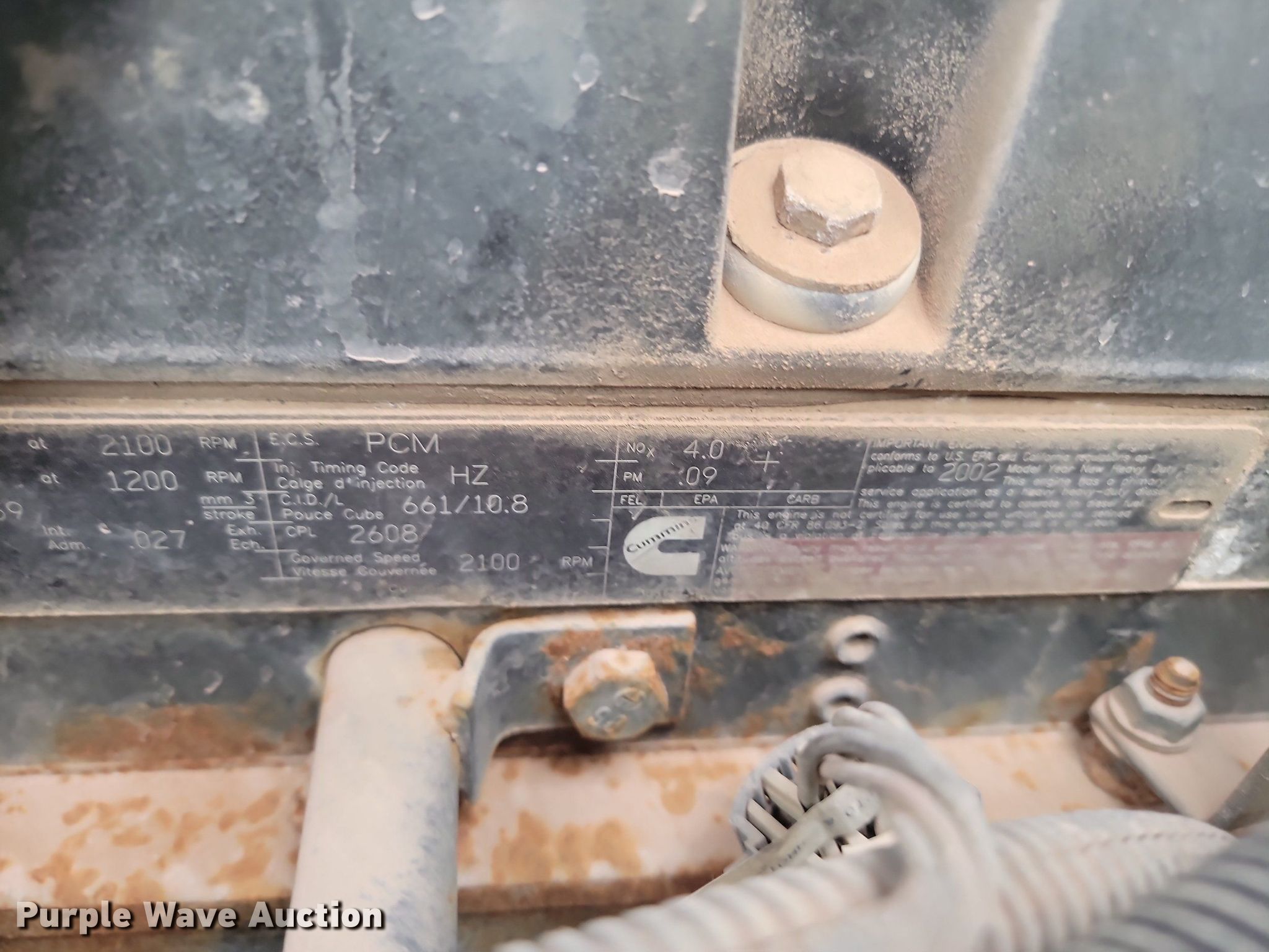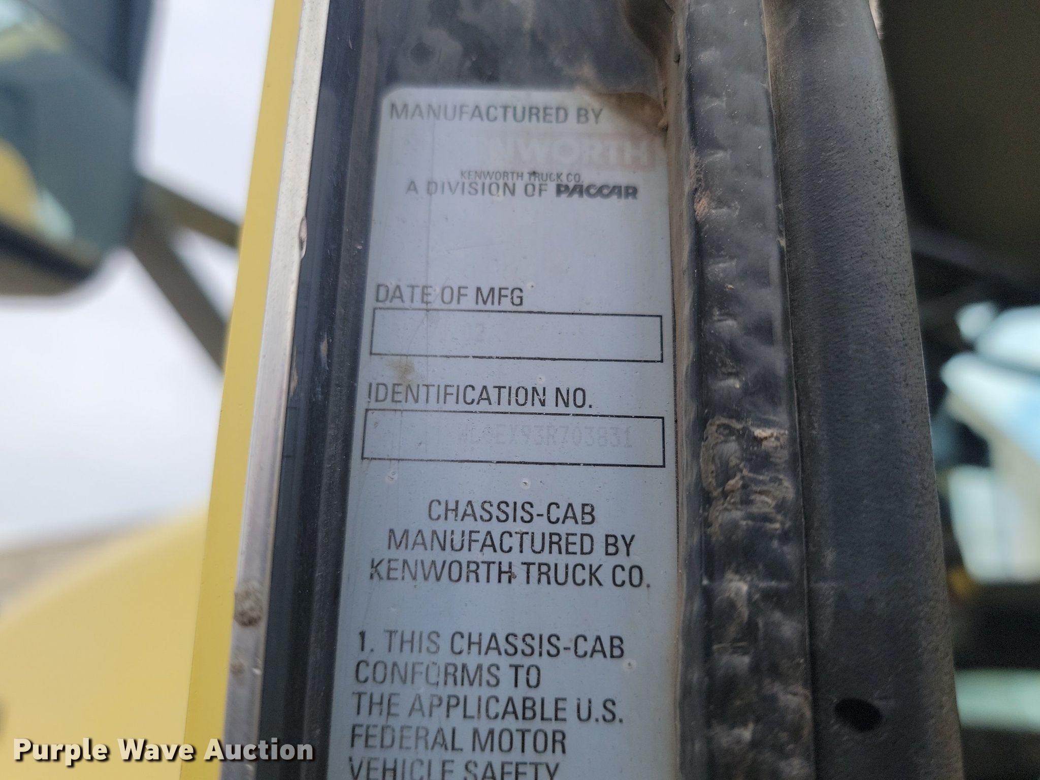 2003 Kenworth W900 ready mix truck. Miles: 209,266 on odometer, Hours: 27,170 on meter, VIN: 1NKWL0EX93R703831. Engine Cummins ISM, Displacement: 10.8L, Cylinders: 6, Fuel type: Diesel. Transmission Eaton Fuller, Manual, Speed: 11. Chassis Axles: 4, Pusher axle Steerable, Differential lock: Inter-axle, Suspension: Spring over walking beam, Brakes: Air, PTO, GVWR: 78,000 lbs. Interior AC, Heat, Heated mirrors, Cruise control. Features Mixer Kimberly K-2000, Serial: K211HD2007, Capacity: 11 cu.yd., Discharge: Rear, Bins: Sand, In-cab controls, Rear drum controls, Water tank capacity: 150 gallons, Chute Extensions: 3, Chute type: Aluminum.. Tires Front: 425/65R22.5, Rear: 11R22.5, Lift axle: 215/75R17.5. South Dakota title. Title distribution may be delayed up to 14 days from verification of funds. Knife River - Sweetman Const.. 1305 N Louise Ave. Sioux Falls, SD 57107