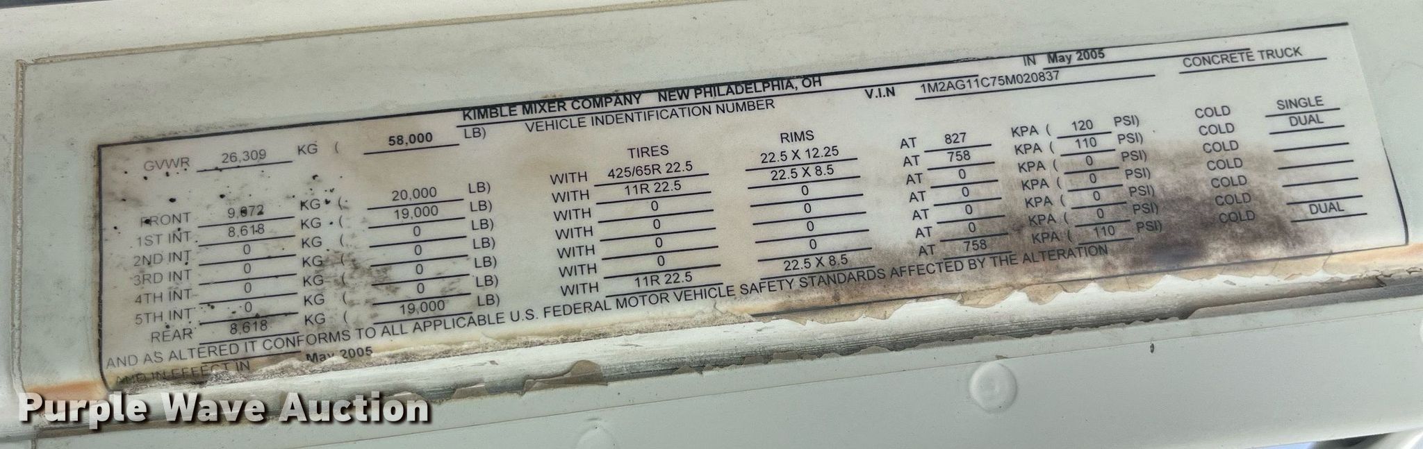 2005 Mack CV713 ready mix truck. Miles: 117,585 on odometer, Hours: 10,984 on meter, VIN: 1M2AG11C75M020837, Unit #: 217. Engine Mack AI-350, Serial: 403012, Displacement: 12.0L, Cylinders: 6, Fuel type: Diesel, HP: 350. Transmission Mack Maxitorque ES, Manual, Speed: 10. Chassis Axles: Tandem, Differential lock: Inter-axle, Suspension: Spring over walking beam, Brakes: Air, PTO, GVWR: 58,000 lbs FAWR: 20,000 lbs, IAWR: 19,000 lbs, RAWR: 19,000 lbs. Interior AC, heat, Cruise control. Features Mixer Kimble, Serial: KS29HD2963, Capacity: 9 cu.yd., Discharge: Rear, In-cab controls, Rear drum controls, Water tank capacity: 125 gallons, Chute Extensions: 3, Chute type: Steel.. Tires Front: 425/65R22.5, Rear: 11/R22.5. Missouri title. Title has a lien that will be released following the close of the auction. Title distribution may be delayed up to 14 days from verification of funds. Bleigh Ready Mix. 144 Bleigh Drive. Hannibal, MO 63401