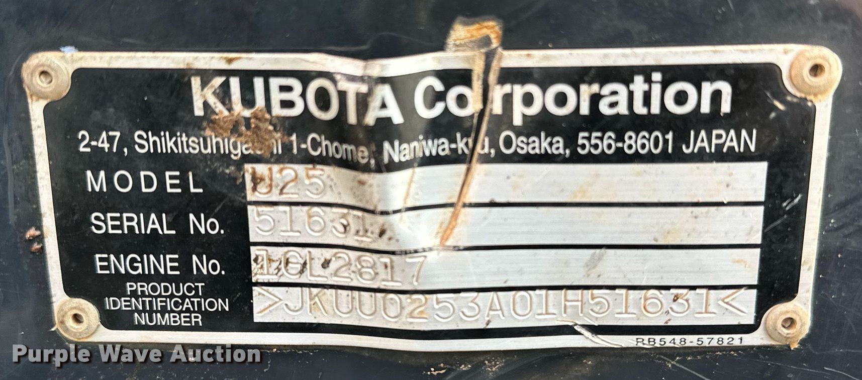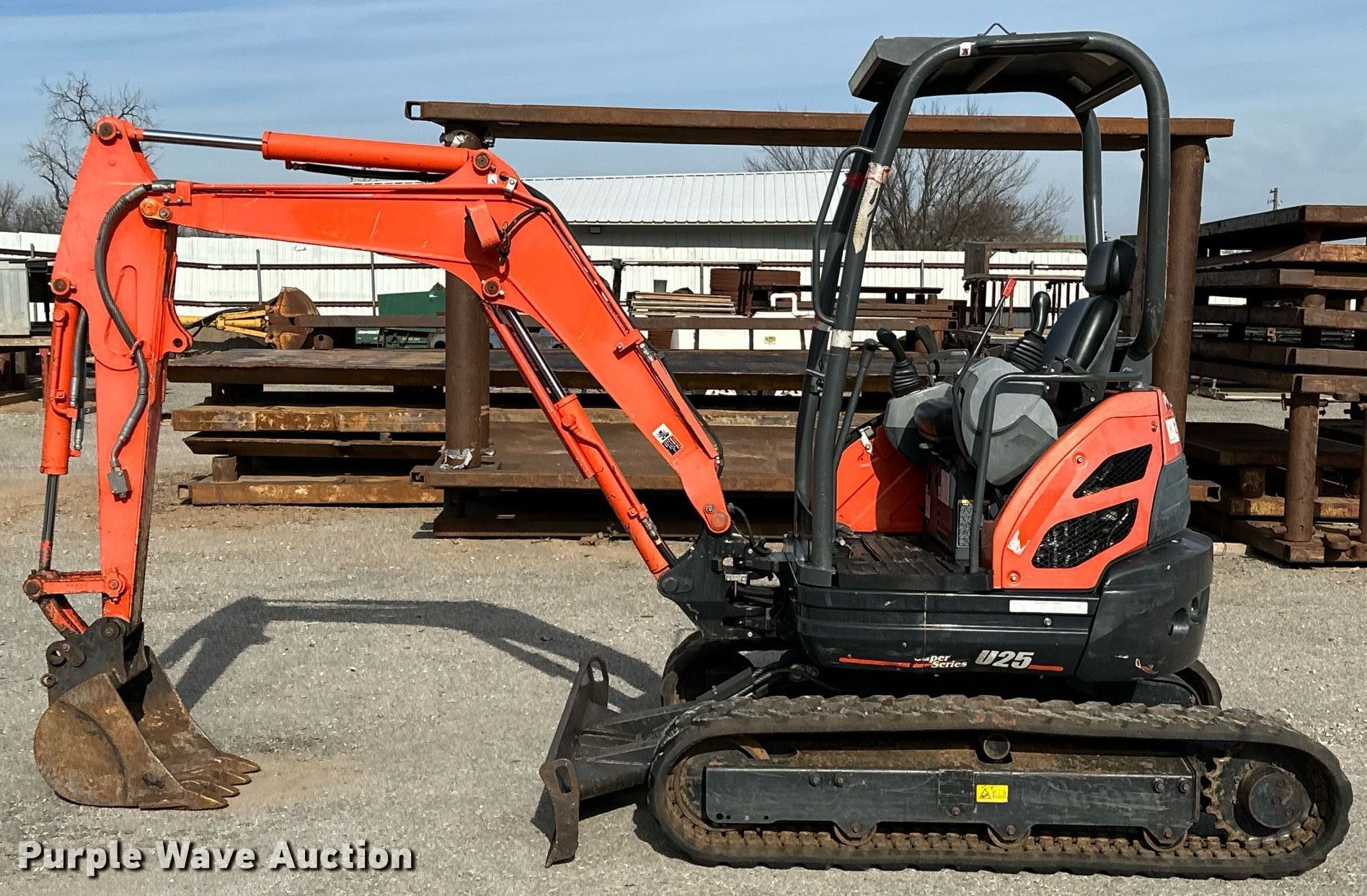 Purple Wave is selling a used Mini Excavator in Oklahoma. This item is a 2016 Kubota U25 mini excavator with the following: Hours: 1,182 on meter, Serial: 51631