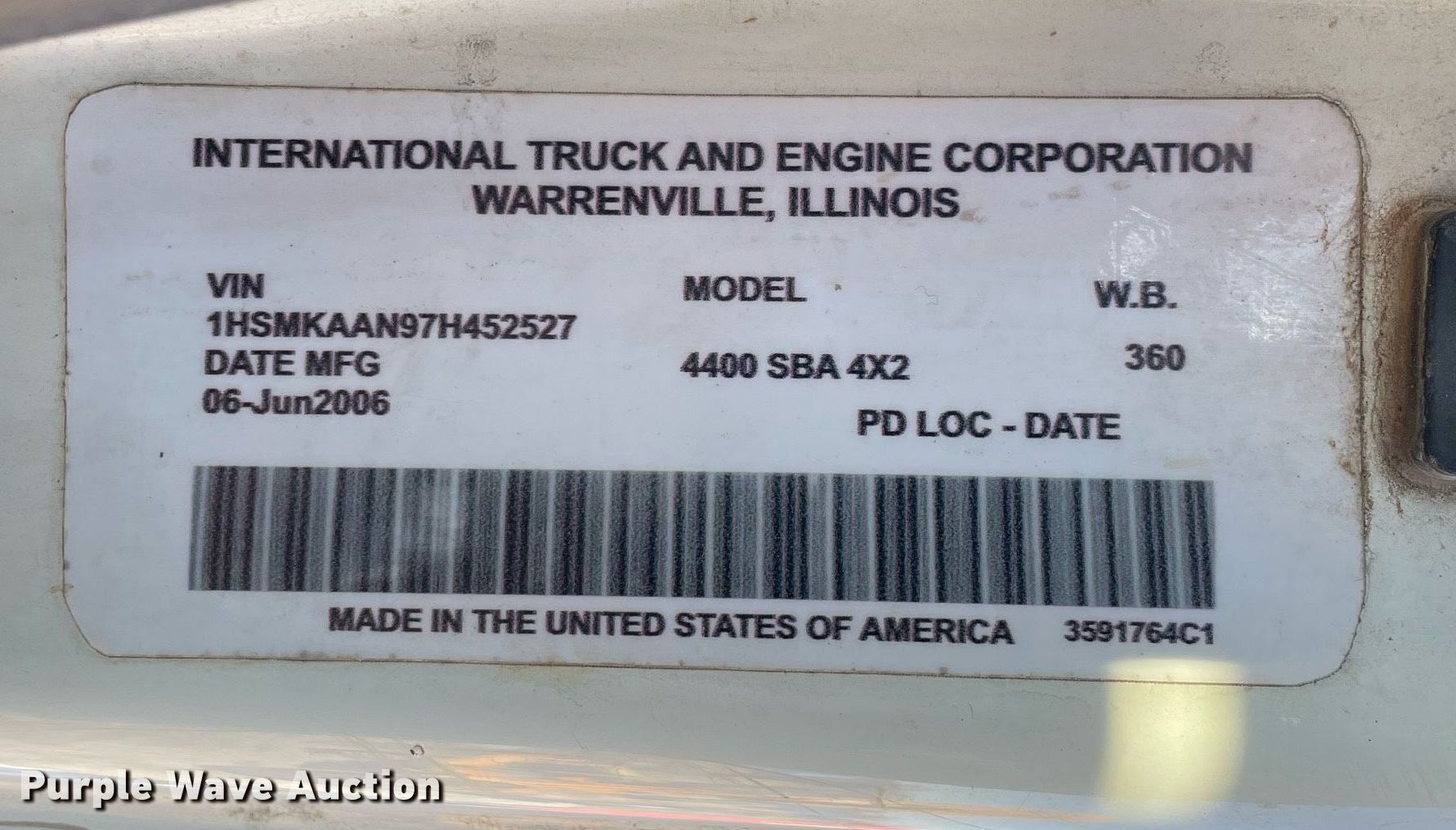 2007 International 4400 dump truck. Miles: 175,190 on odometer, Hours: 9,430 on meter, VIN: 1HSMKAAN97H452527. Engine International DT466, Displacement: 7.6L, Cylinders: 6, Fuel type: Diesel. Transmission Automatic. Chassis Axles: Single, Suspension: Spring, Brakes: Air, PTO, GVWR: 32,000 lbs FAWR: 12,000 lbs, RAWR: 20,000 lbs. Interior AC, Heat, Cruise control, Brake controller. Features Dump bed Duraclass, 12' L x 96" W, Side height: 34", Bed type: Steel, Ram: Single, End gate: Air operated. Tires Front: 295/75R22.5, Rear: 11R22.5. Notes Dash warning indicator: ABS, Windshield chipped or cracked, Possible engine issues, smokes. Illinois title. Title distribution may be delayed up to 14 days from verification of funds. American Fiber Construction. 111 North Commercial Drive. Teutopolis, IL 62467