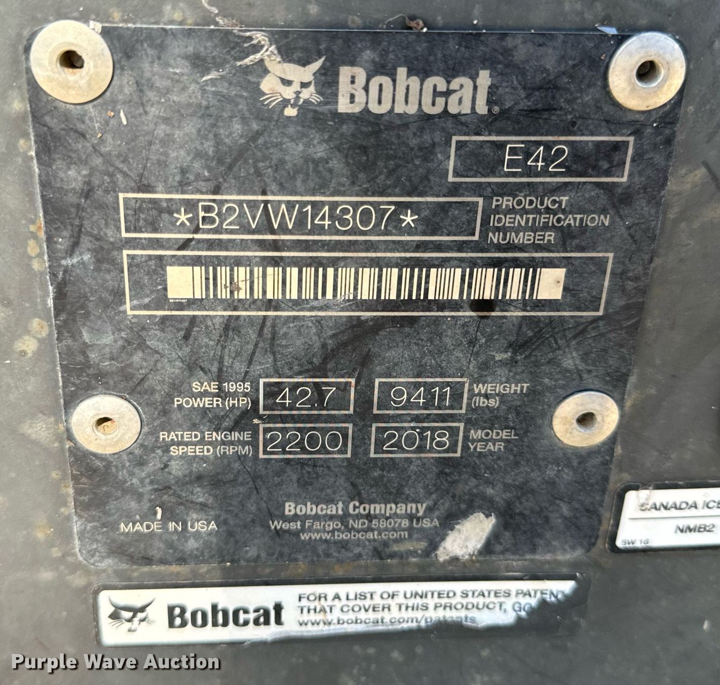 Purple Wave is selling a used Mini Excavator in Missouri. This item is a 2018 Bobcat E42 mini excavator with the following: Hours: 1,249 on meter, Miles or hours may vary, unit still in use, Serial: B2VW14307