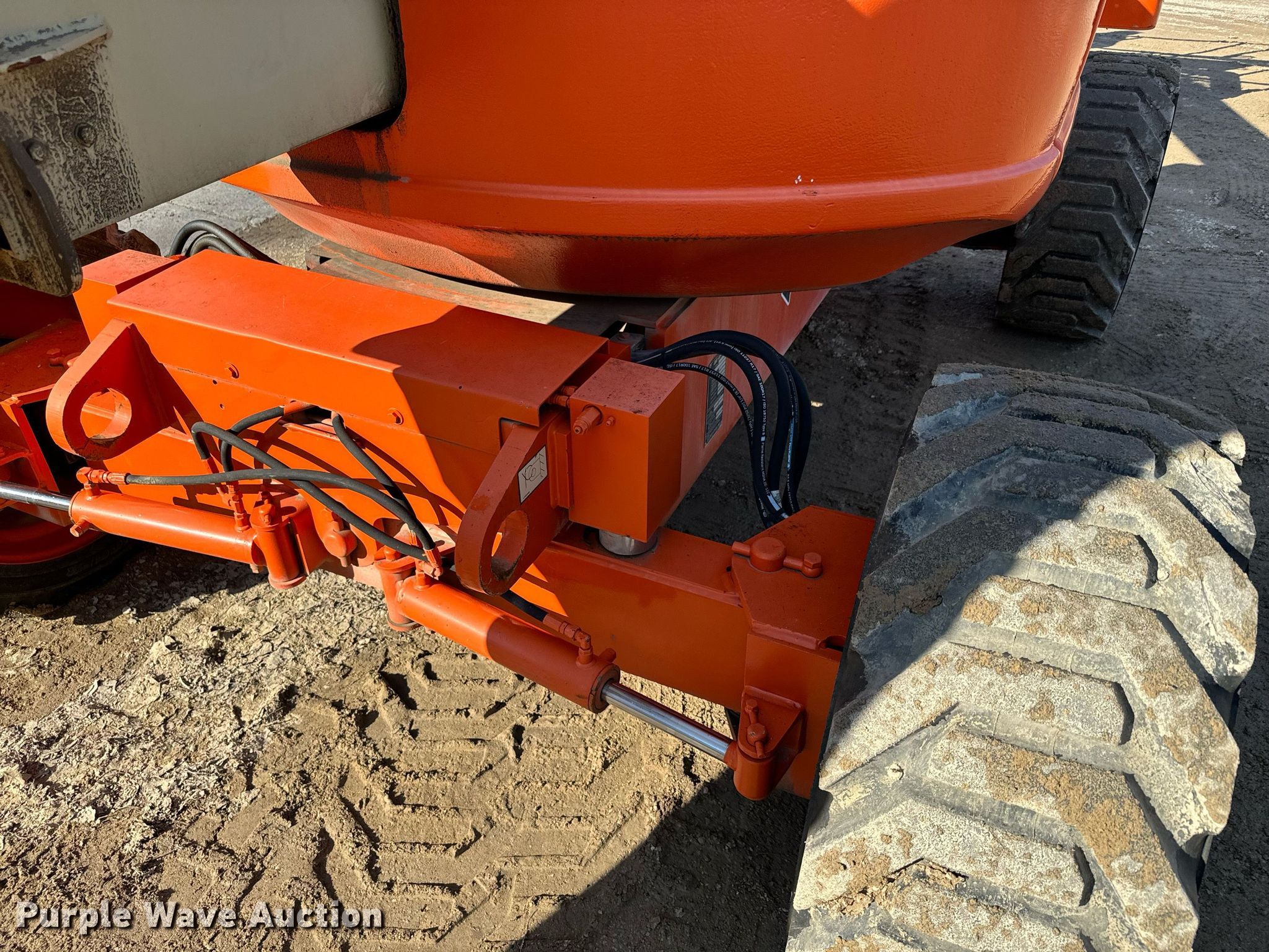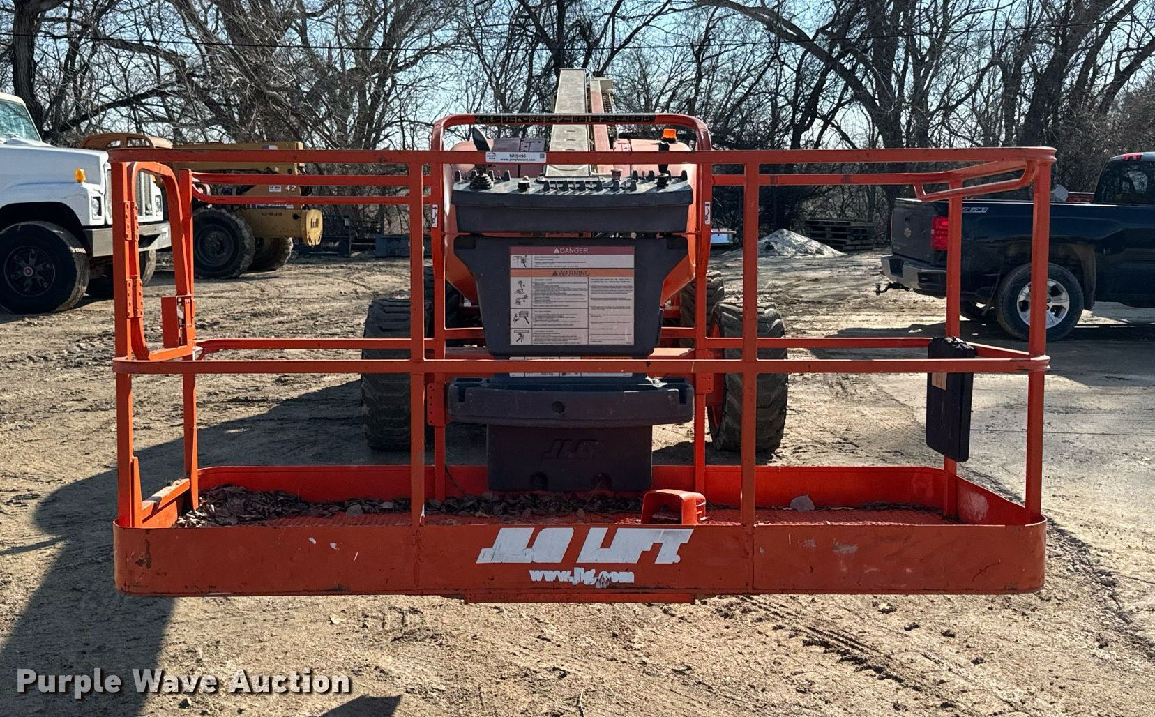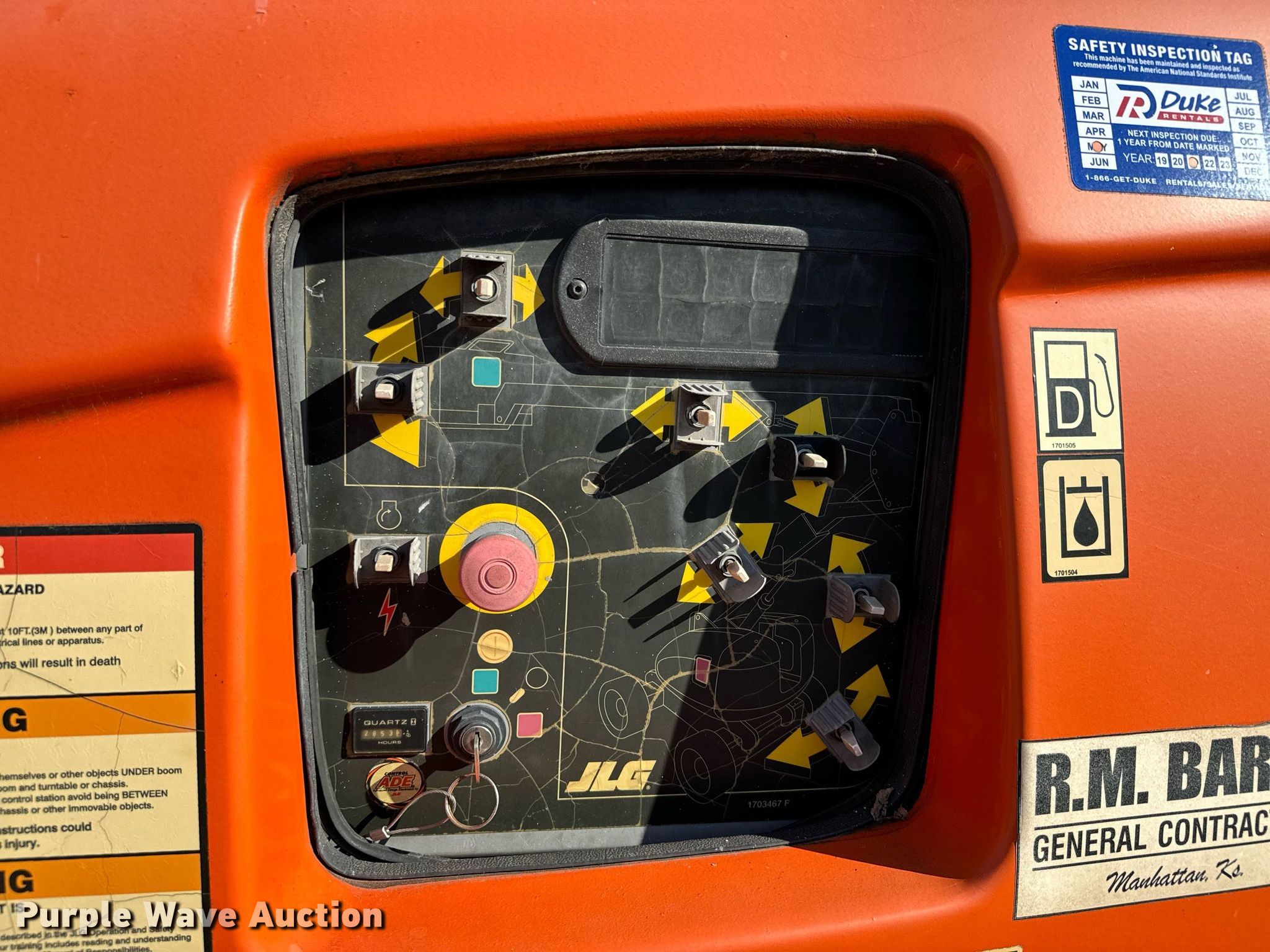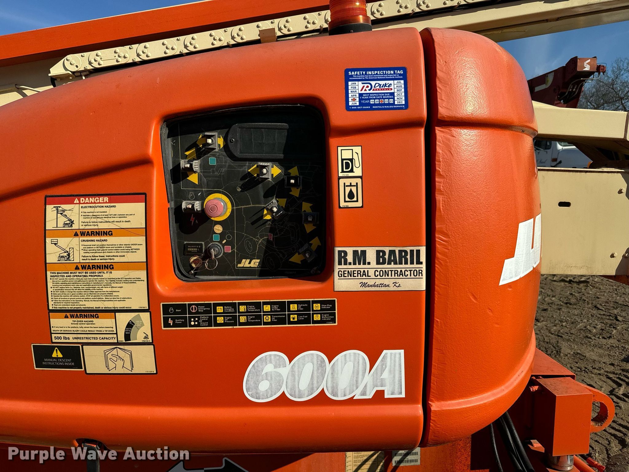 2005 JLG 600A boom lift. Hours: 2,854 on meter, Serial: 0300083946. Engine Deutz, Cylinders: 4, Fuel type: Diesel. Chassis Four wheel drive. Features Rough terrain, Maximum lift capacity: 1,000 lbs, Maximum reach length: 39', Maximum lift height: 60', AC power outlet, Controls: Platform, Ground, Platform rotation: Hydraulic, Safety alarm. Tires Solid. RM Baril General Contractor Inc. Manhattan, KS 66502