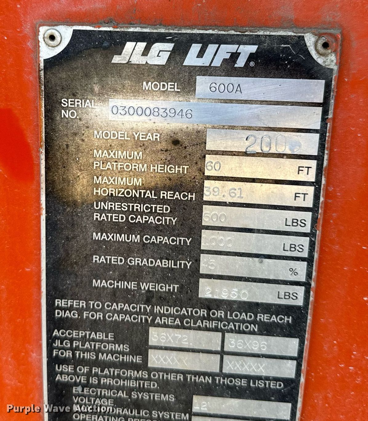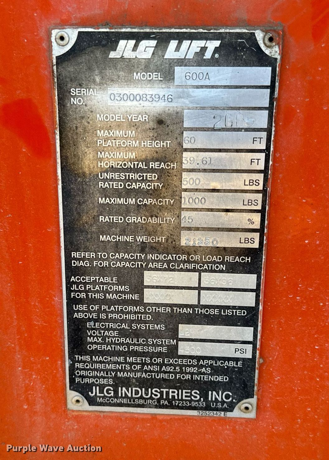 Purple Wave is selling a used Boom Lift in Kansas. This item is a 2005 JLG 600A boom lift with the following: Hours: 2,854 on meter, Serial: 0300083946