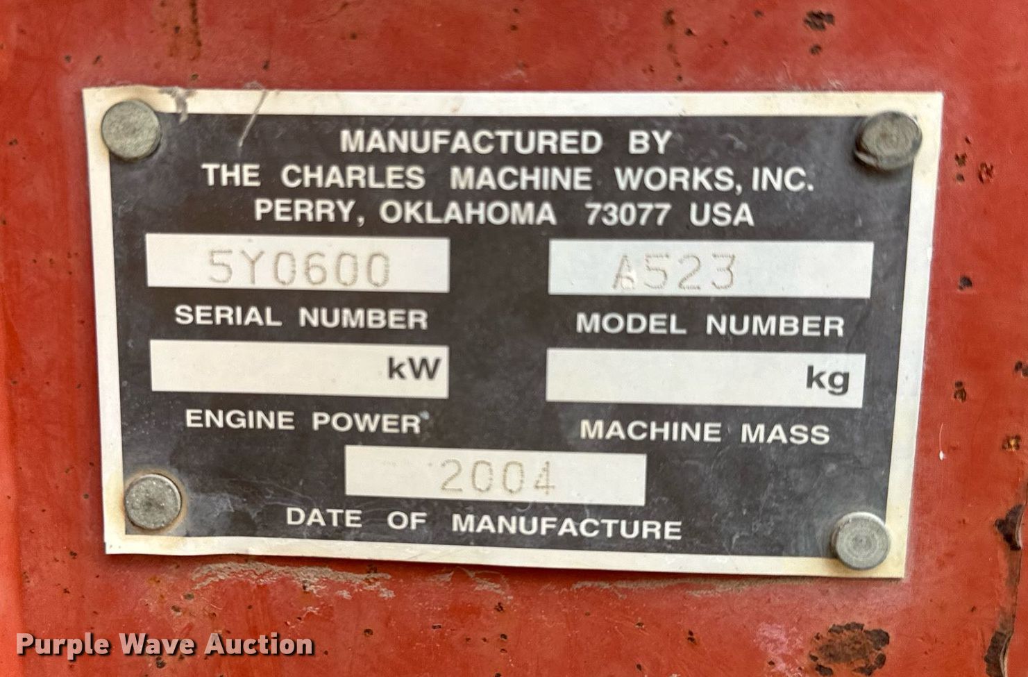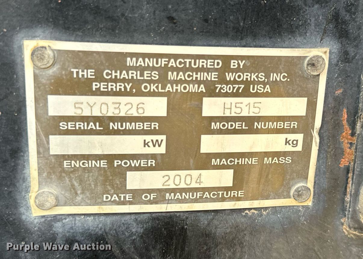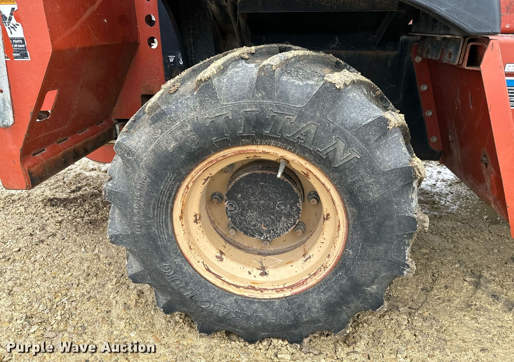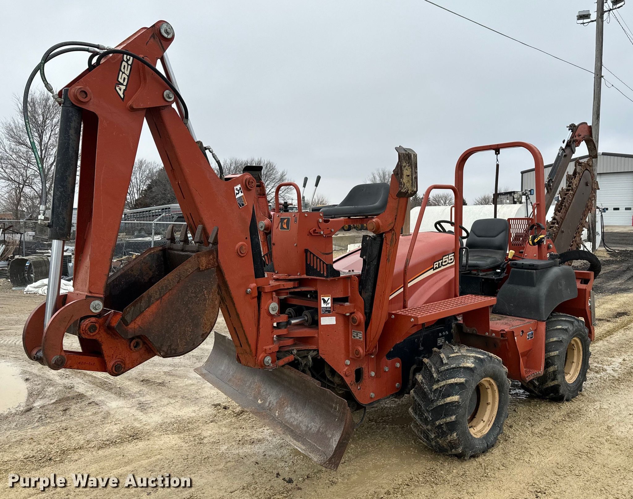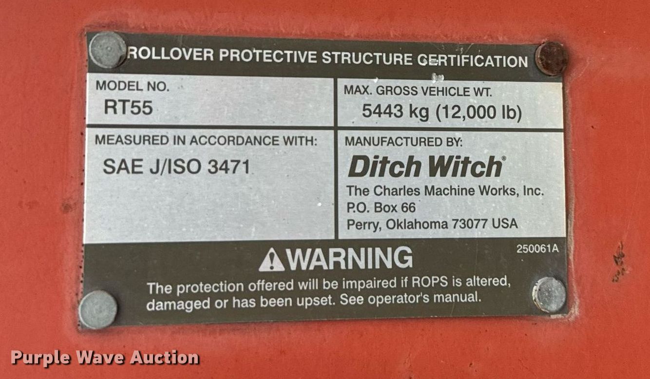 2004 Ditch Witch RT55 trencher. Hours: 1,255 on meter, Serial: 5Y0326. Engine Cylinders: 4, Fuel type: Diesel. Transmission Hydrostatic, Four wheel drive, Differential lock, Four wheel steer. Operators station OROPS. Features Trencher Estimated dig depth: 84", Cutting width: 7", Side shift, Teeth: Rock, Dirt, Hydraulic crumber, Backhoe Model: A523, Serial: 5Y0600, Bucket width: 18", Backfill blade Width: 72". Tires Size: 31x15.50-15. Hood Heating & Air. Concordia, KS 66901