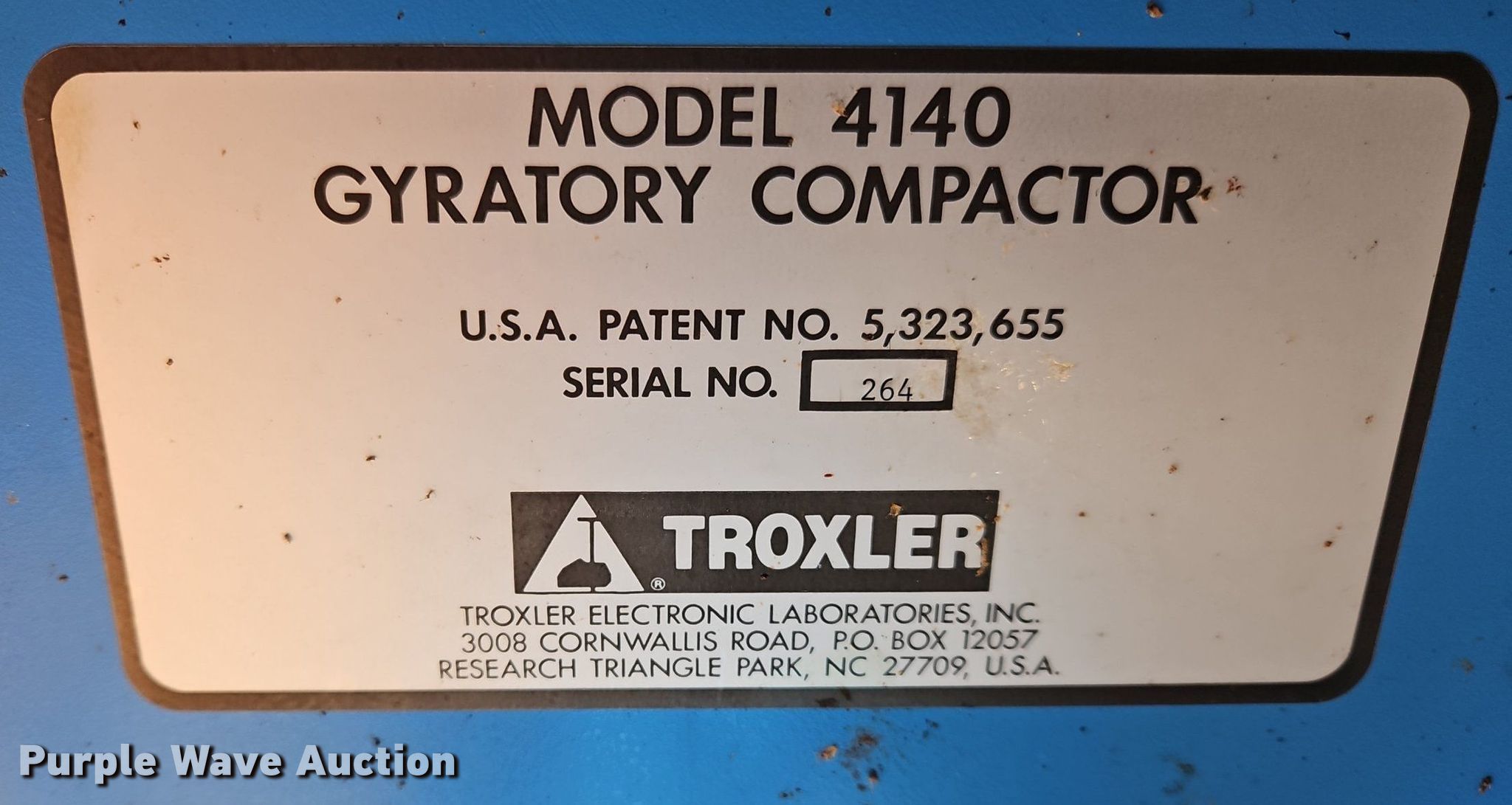 Troxler 4140 gyratory compactor. Serial: 264. Features Capacity: 100 to 150 mm, Adjustable angle:.5 degrees to 2 degrees, Molds. Notes Unknown operating condition. Howell Paving Inc. 2500 North 3rd Street. Effingham, IL 62401