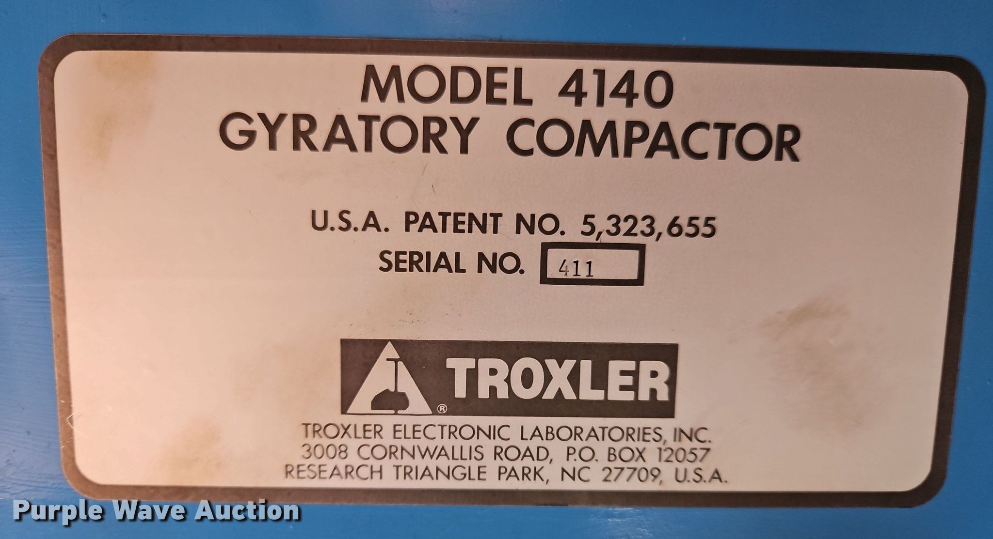 Troxler 4140 gyratory compactor. Serial: 411. Features Capacity: 100 to 150 mm, Adjustable angle:.5 degrees to 2 degrees, Molds. Notes Unknown operating condition. Howell Paving Inc. 2500 North 3rd Street. Effingham, IL 62401