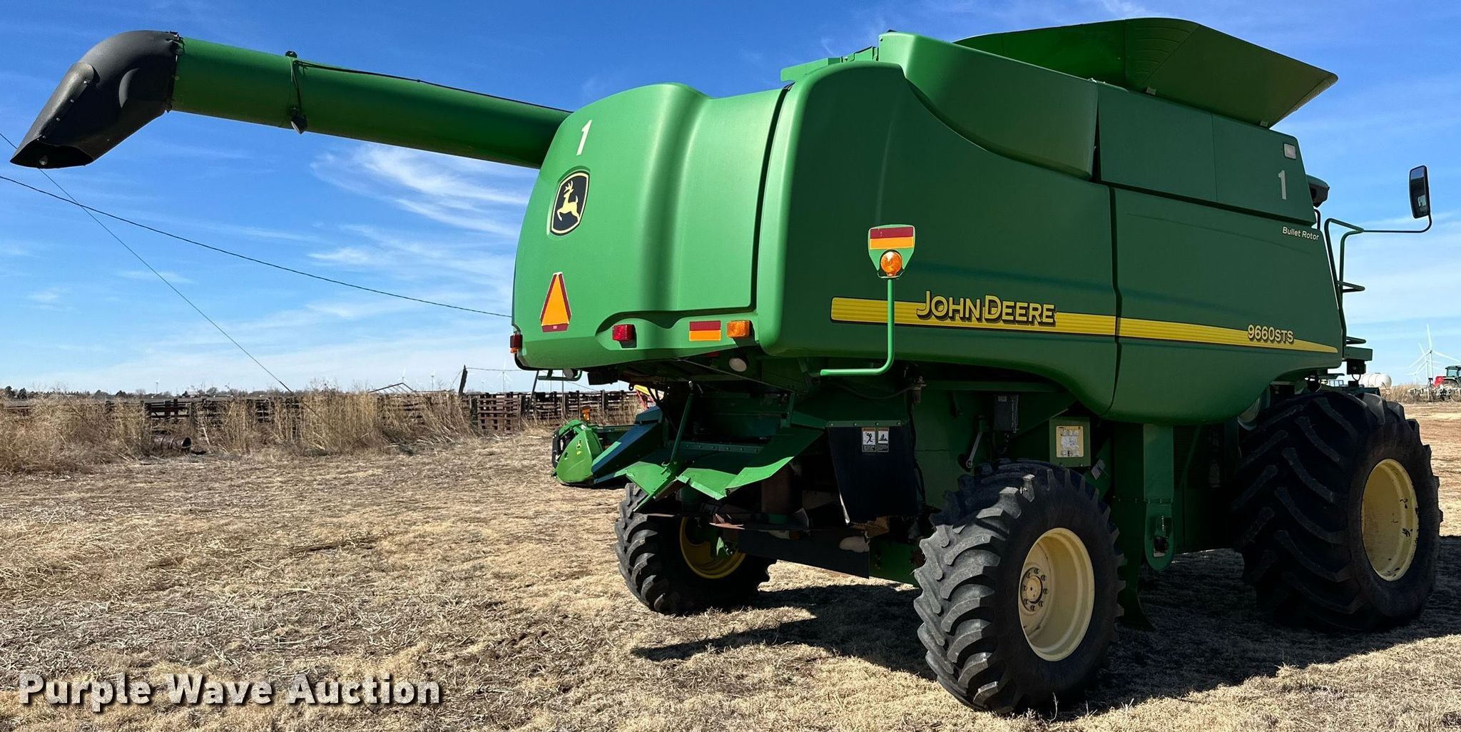 Purple Wave is selling a used Combine in Texas. This item is a 2006 John Deere 9660 STS combine with the following: Engine hours: 3,023 on meter, Separator hours: 2,093 on meter, Serial: H09660S715741