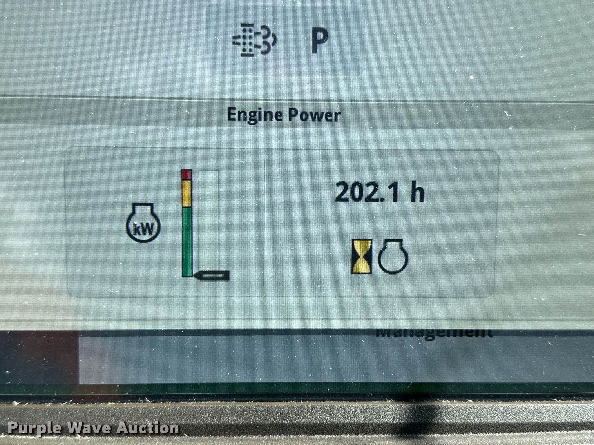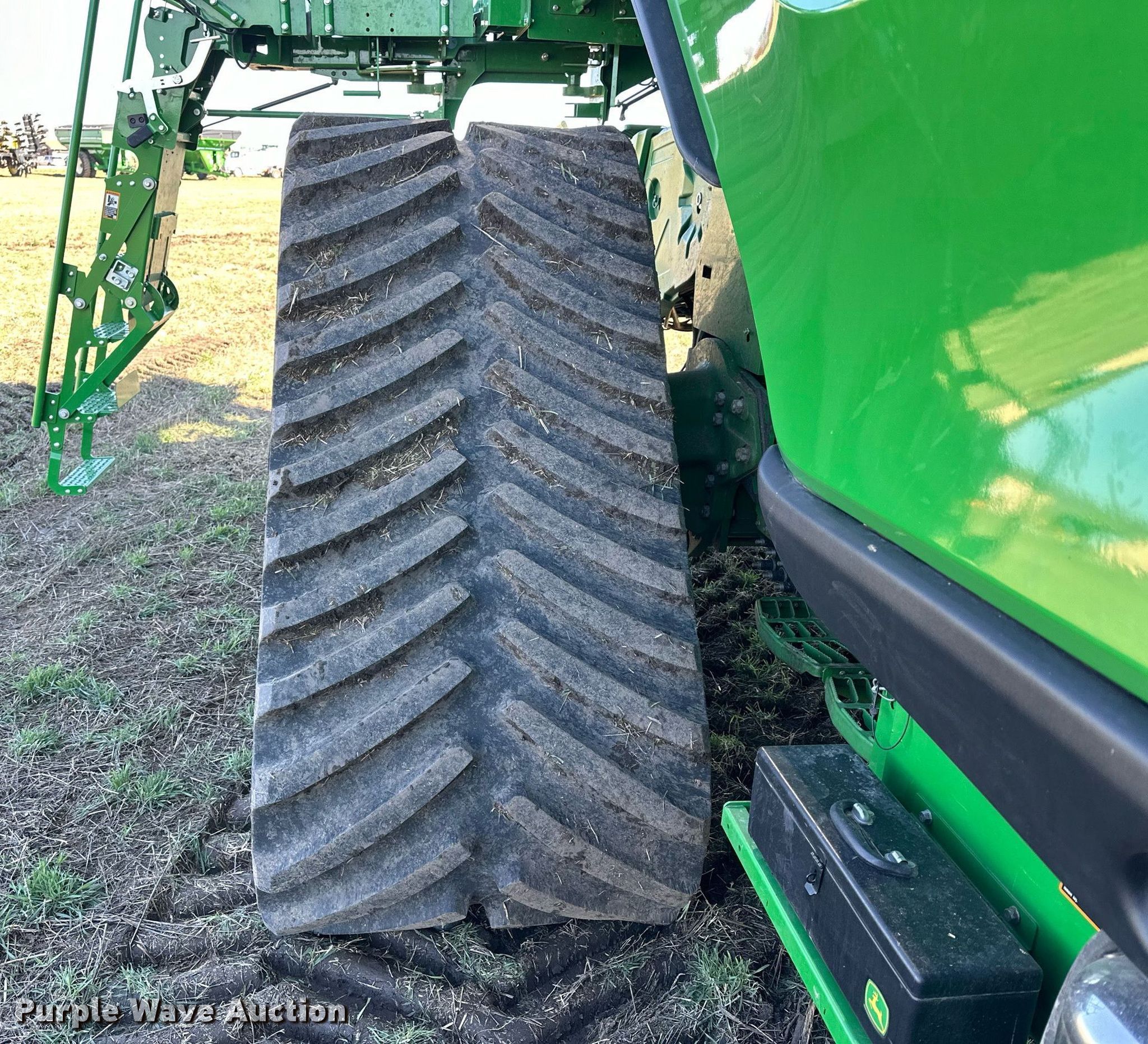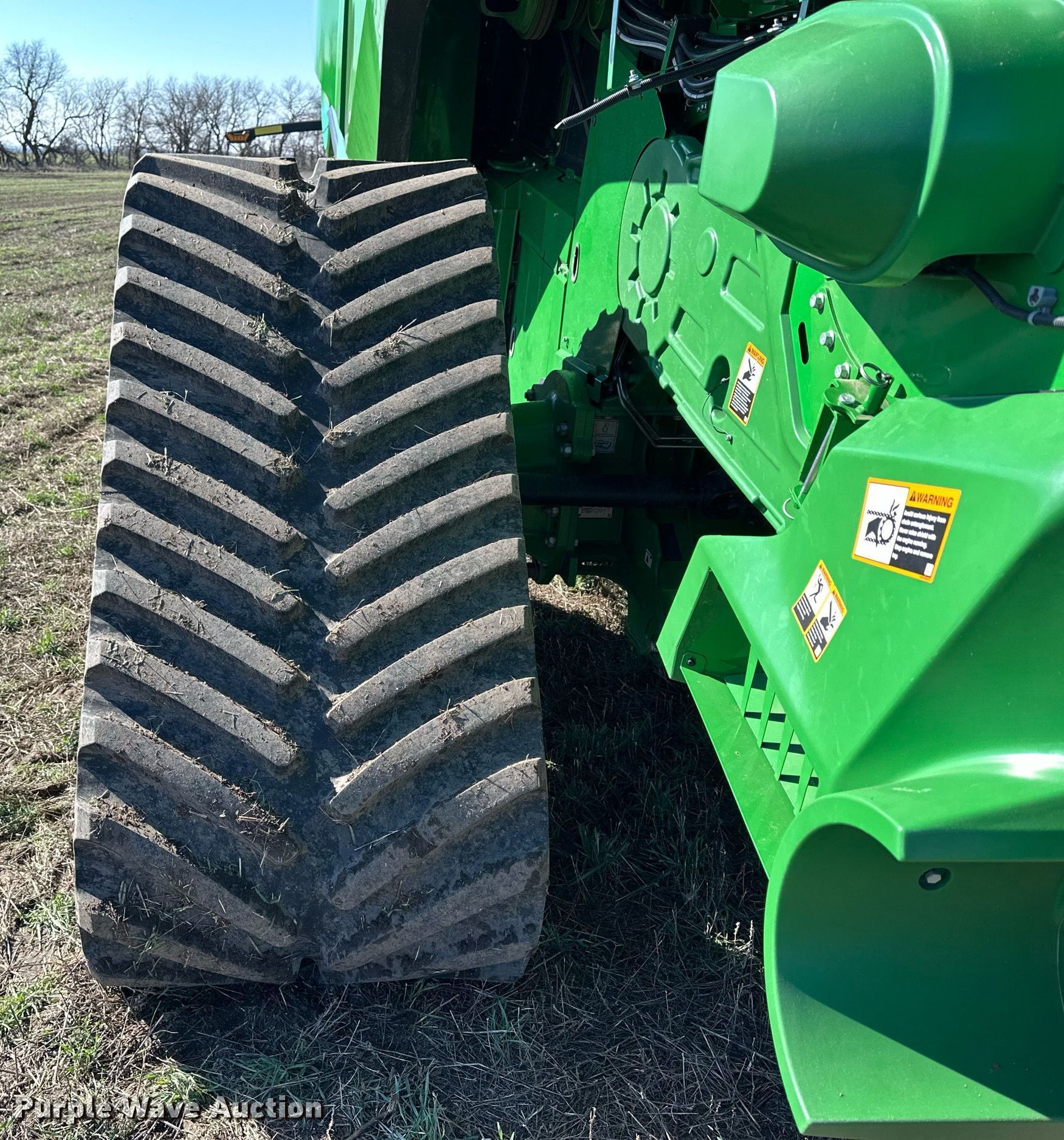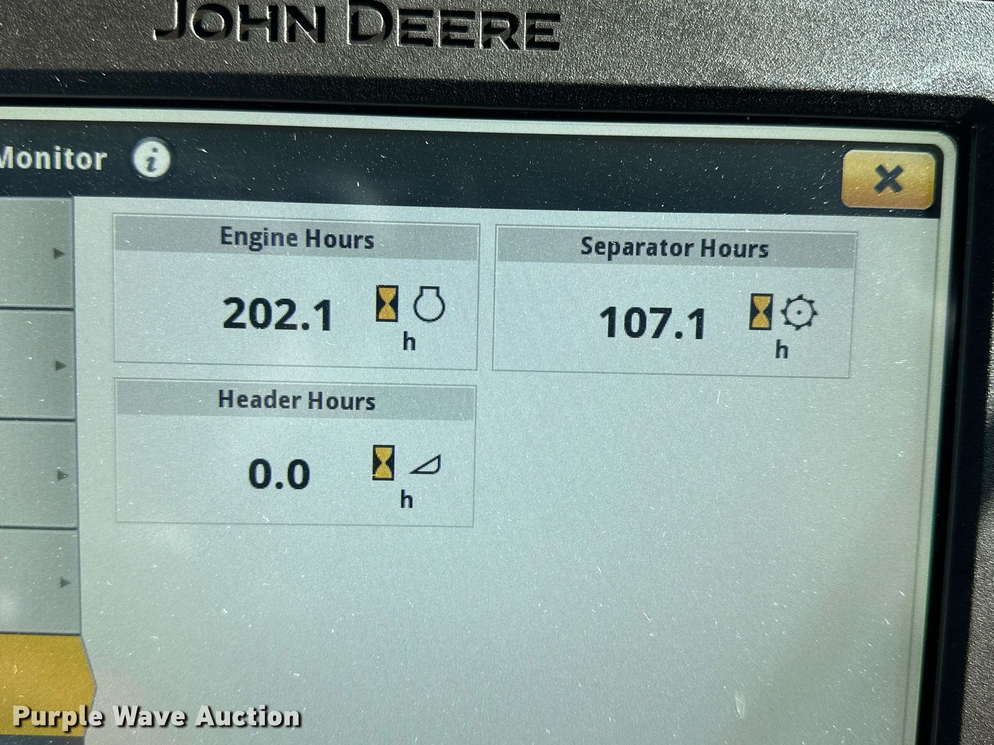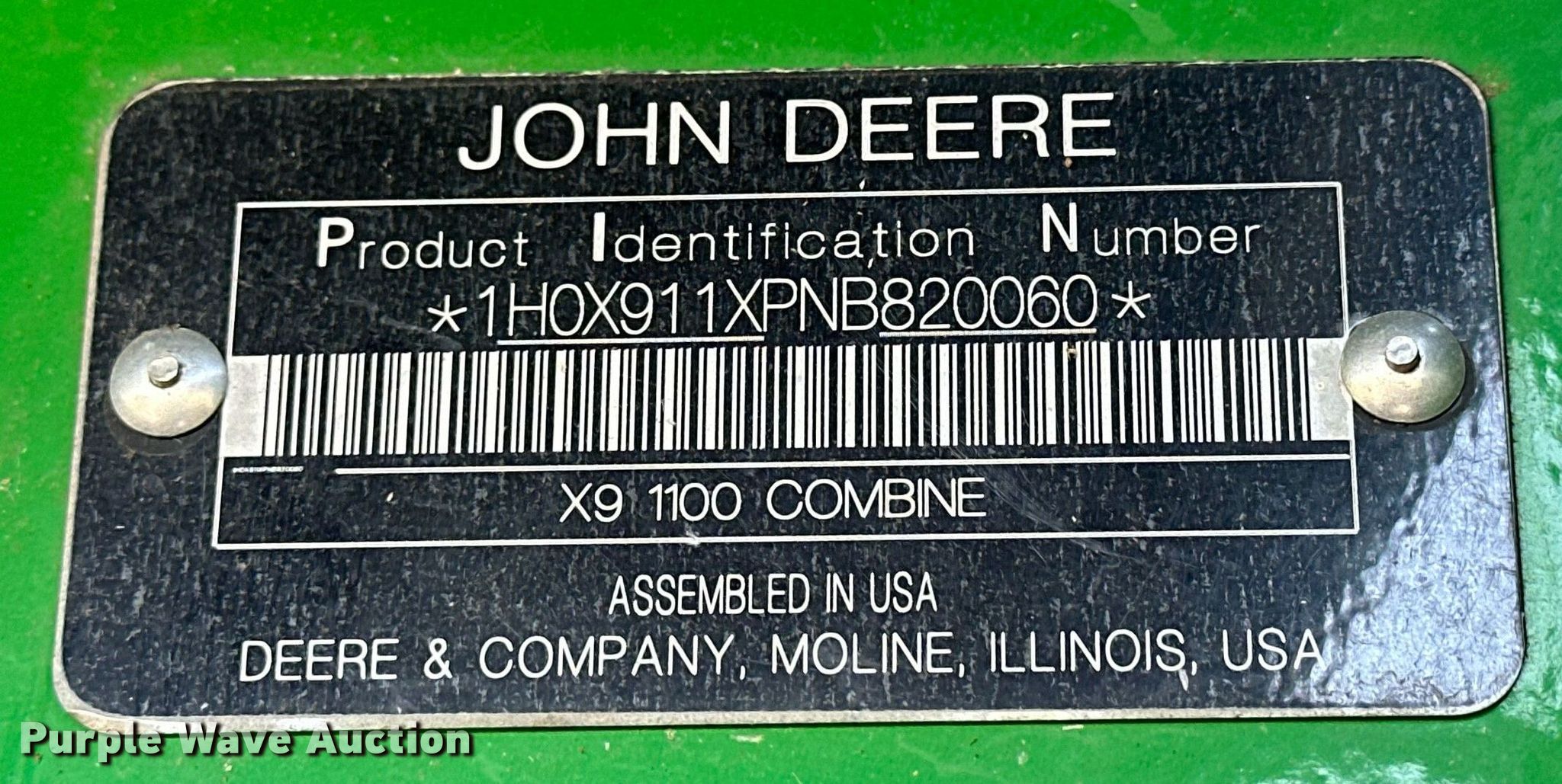 2022 John Deere X9 1100 Signature Edition RWA combine. Engine hours: 202 on meter, Separator hours: 107 on meter, Serial: 1H0X911XPNB820060. Engine John Deere PowerTech, Displacement: 13.6L, Cylinders: 6, Fuel type: Diesel. Transmission ProDrive XL, Hydrostatic. Chassis RWA, Differential lock. Interior AC, Heat, Seat: Heated, Cooled, Massage, GPS receiver John Deere Starfire 6000. Features Combine advisor ActiveVision, Auto maintain, Machine sync, Operator manual, Single point header coupler, Feederhouse: Lateral tilt, Variable speed, Reverser, Concaves: Extended wear round, Chaff spreader, Straw chopper, Power tailboard, Bin: Power folding bin, Extended wear grain handling system, Unloading auger length: 31'. Tires Size 750/65R26. Tracks Width: 36", Rubber. Notes CB radio not included, Engine warranty valid until September 22, 2024 or 2,000 hours, Emissions warranty valid until September 23, 2027 or 3,000 hours, Extended Powertrain warranty valid until September 20, 2028 or 2,500 hours. Pursuant to Kansas law, Purple Wave will not be collecting sales taxes on any of the purchases made in this business liquidation auction.. Ingermanson Farms - Open inspection March 15. 6529 North Solomon Road. Solomon, KS 67480
