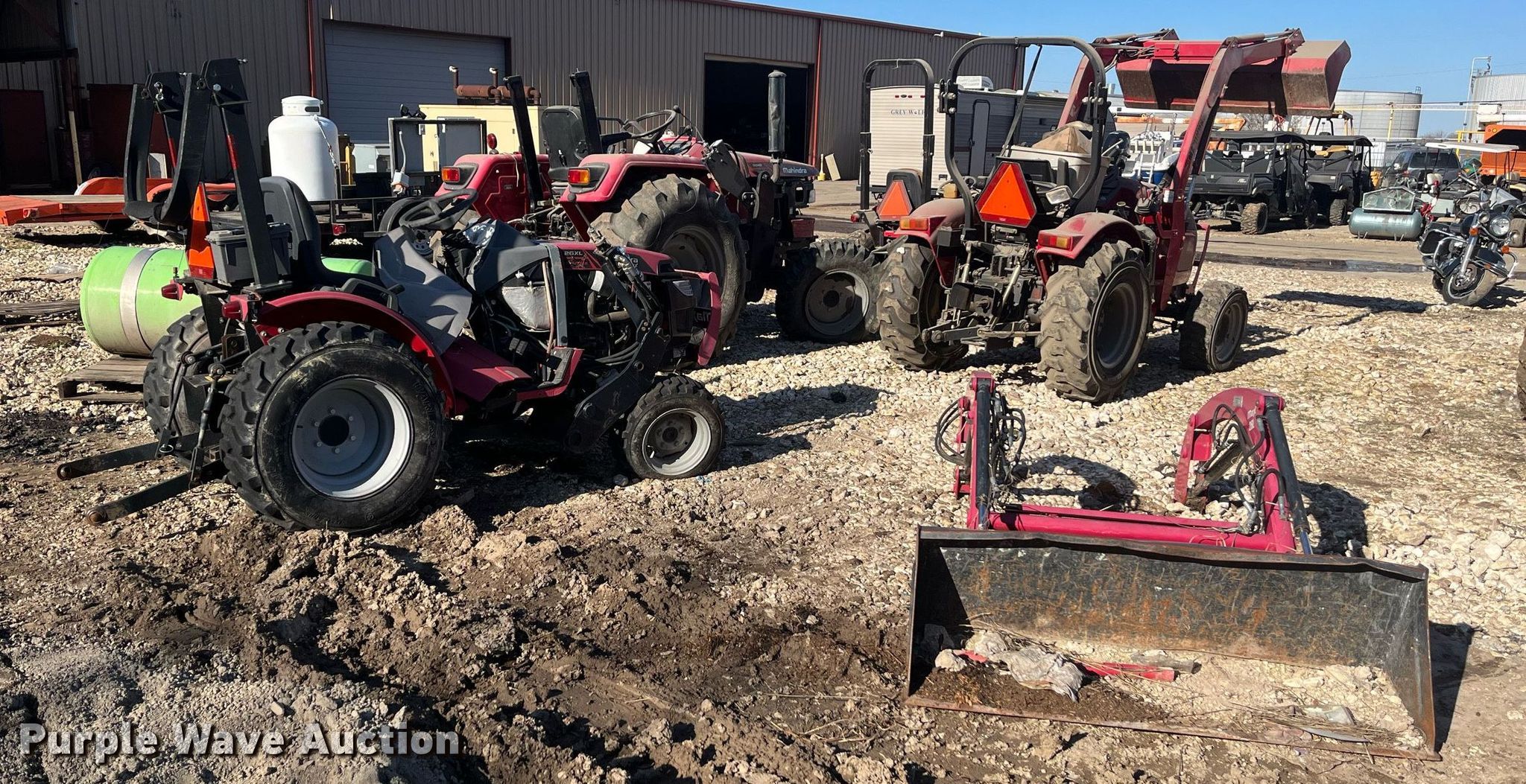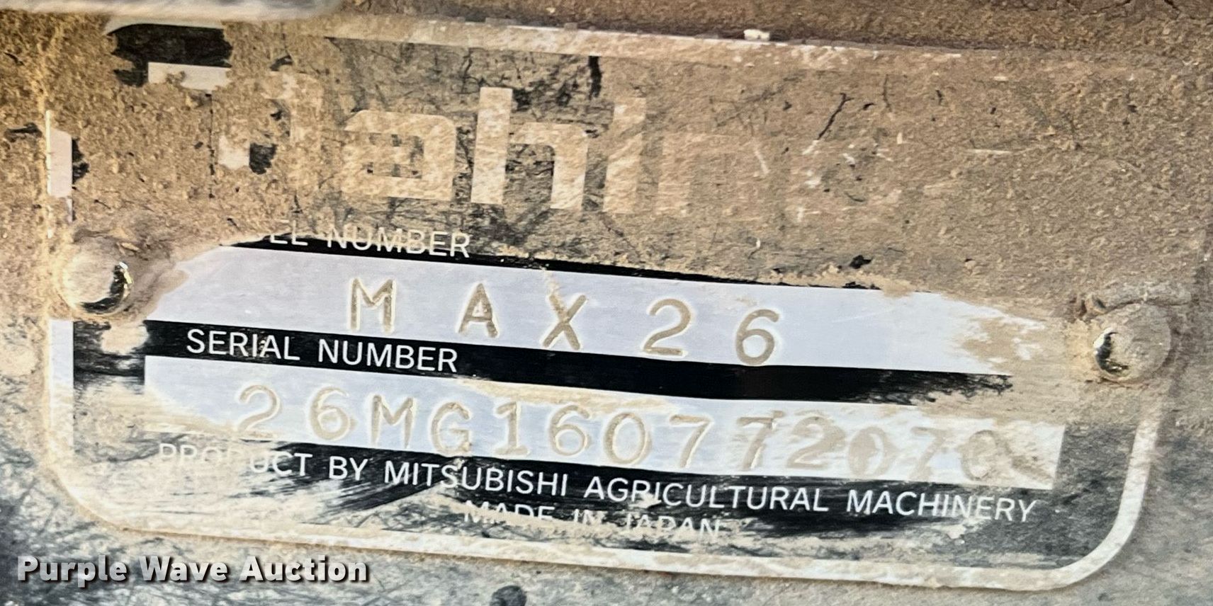 2016 Mahindra Max 26XL MFWD tractor. Hours: 287 on meter, Serial: 26MG160772070. Engine Cylinders: 3, Fuel type: Diesel. Transmission Manual, 8F - 2R, Differential lock. Features PTO: 540, Three point, Loader Mahindra Max 26L, Quick attach, Controls: Joystick, Bucket Width: 54".. Tires Front: 23x8.50-12, Rear: 12-16.5. Notes Unknown operating condition. North Texas Equipment. 800 Burlington Road. Saginaw, TX 76179