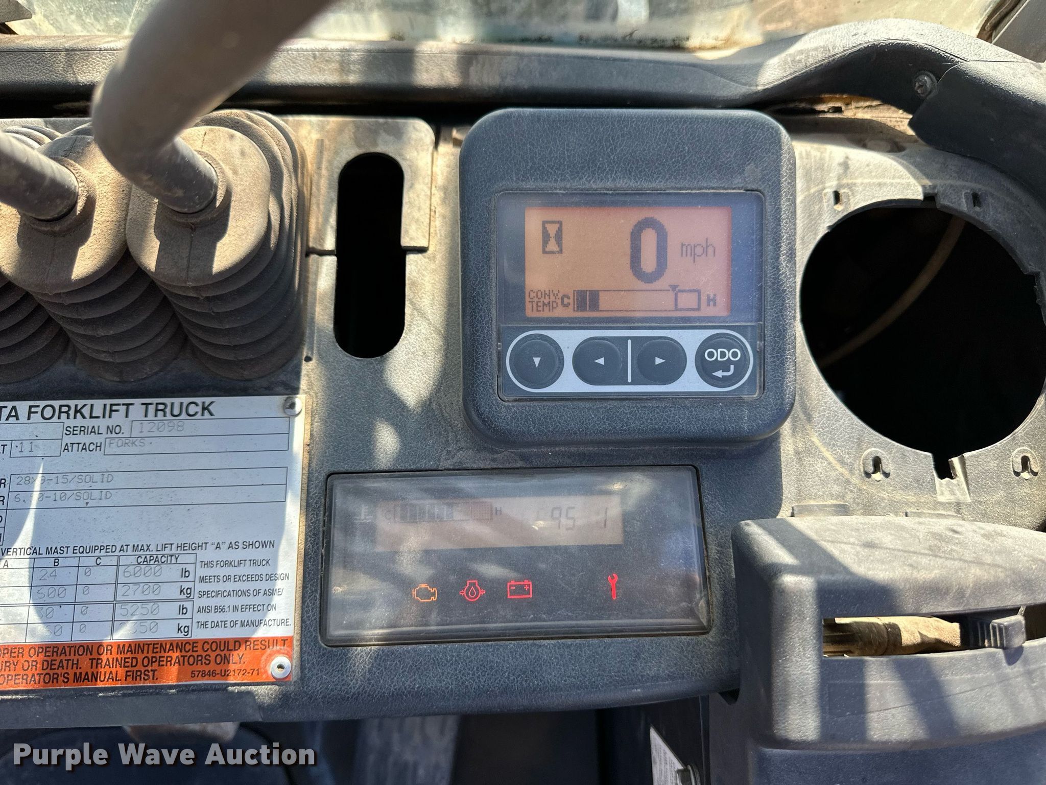 Toyota 8FGU30 forklift. Hours: 5,967 on meter, Serial: 12098. Engine Toyota, Cylinders: 4, Fuel type: LPG LP bottle: Not included. Transmission Powershift. Operators station Enclosed cab. Features Maximum lift capacity: 6,000 lbs, Maximum lift height: 131.5", Mast stages: 2, Side shift, Mast tilt, Hydraulic fork positioning, Fork length: 72". Tires Front: 28x9-15, Rear: 6.50-10, Solid. Notes Glass cracked, Door missing. Peter Teichroeb. 1587 Cottonwood. Sublette, KS 67877