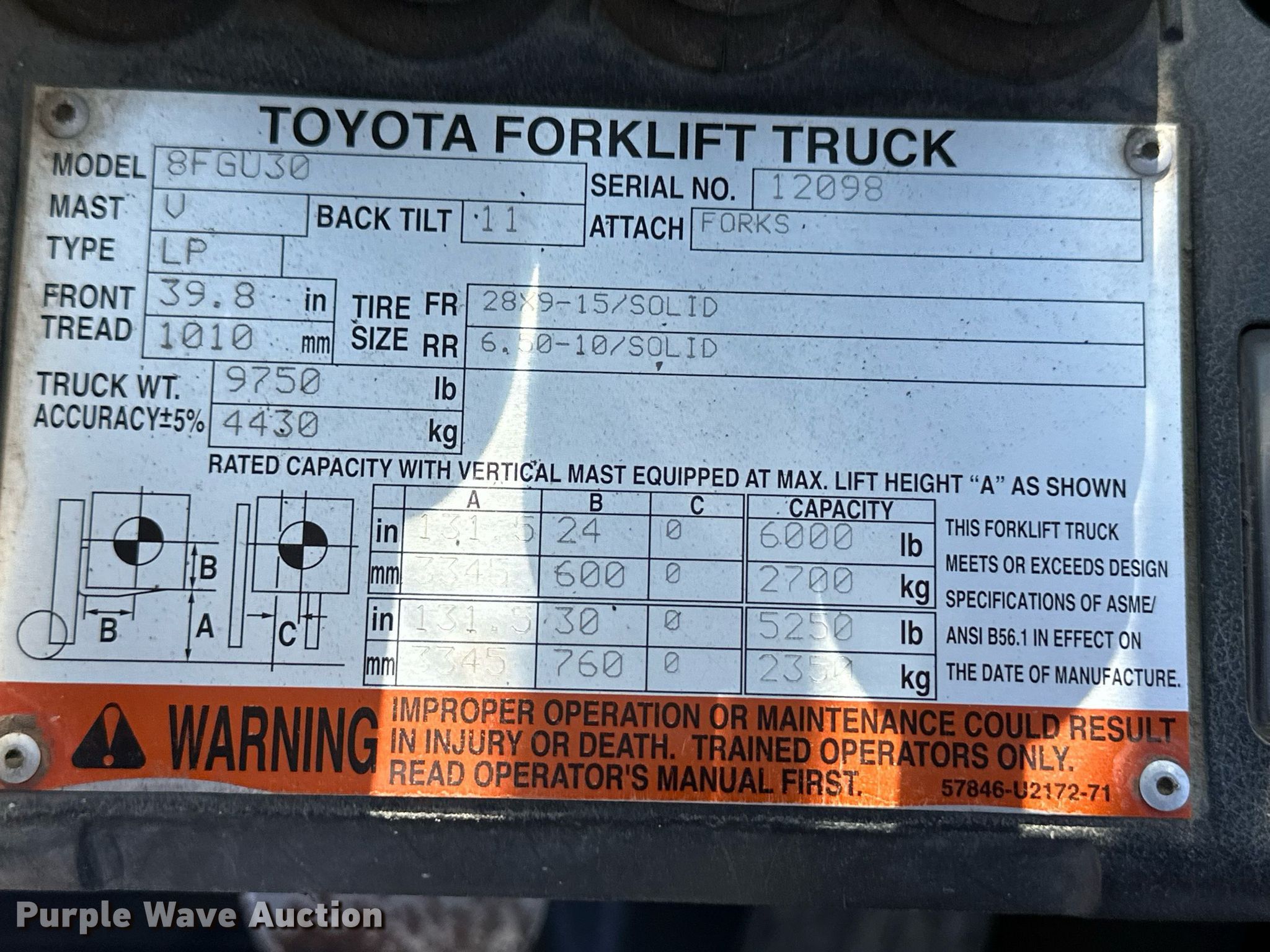Purple Wave is selling a used Warehouse Forklift in Kansas. This item is a Toyota 8FGU30 forklift with the following: Hours: 5,967 on meter, Serial: 12098