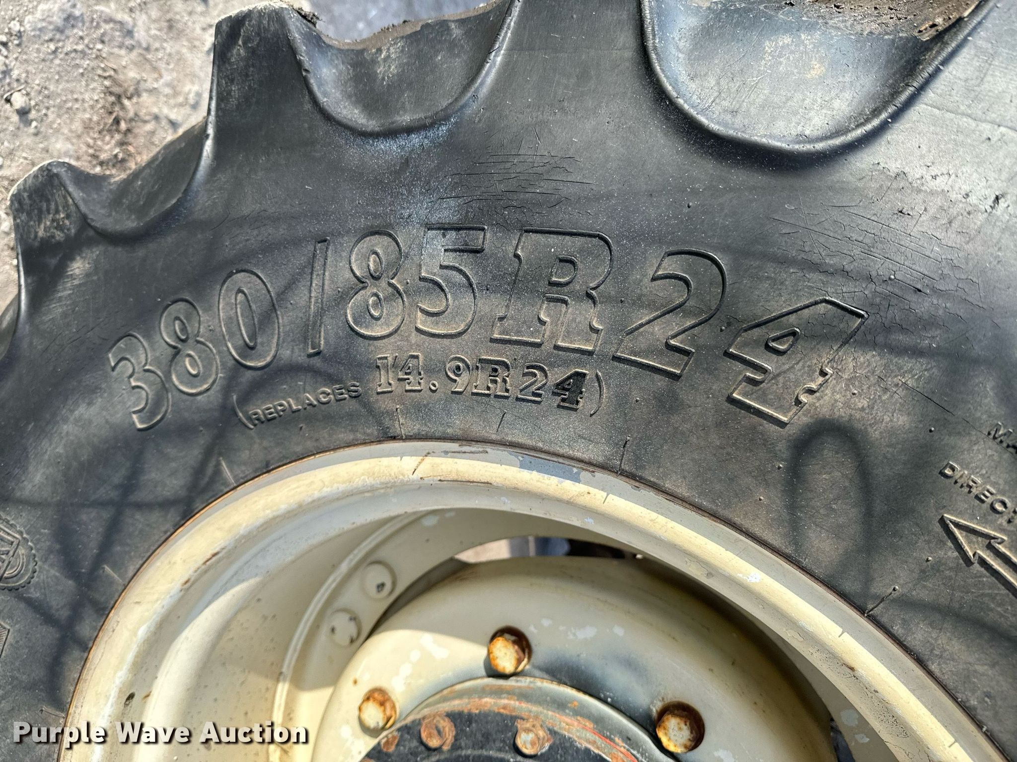2002 Ford New Holland TS110 tractor. Hours: 10,949 on meter, Serial: 185699B. Engine Displacement: 274 C.I.D, Cylinders: 4, Fuel type: Diesel. Transmission Synchro, 12F - 12R. Operators station AC, heat. Features PTO: 540, Three point Top link, Hydraulic remote sets Rear: 6, Loader Bush Hog M646, Controls: Joystick, Bucket Width: 84".. Tires Front: 380/85R24, Rear: 460/85R34. 11-39 48000th St. Savonberg, KS 66772