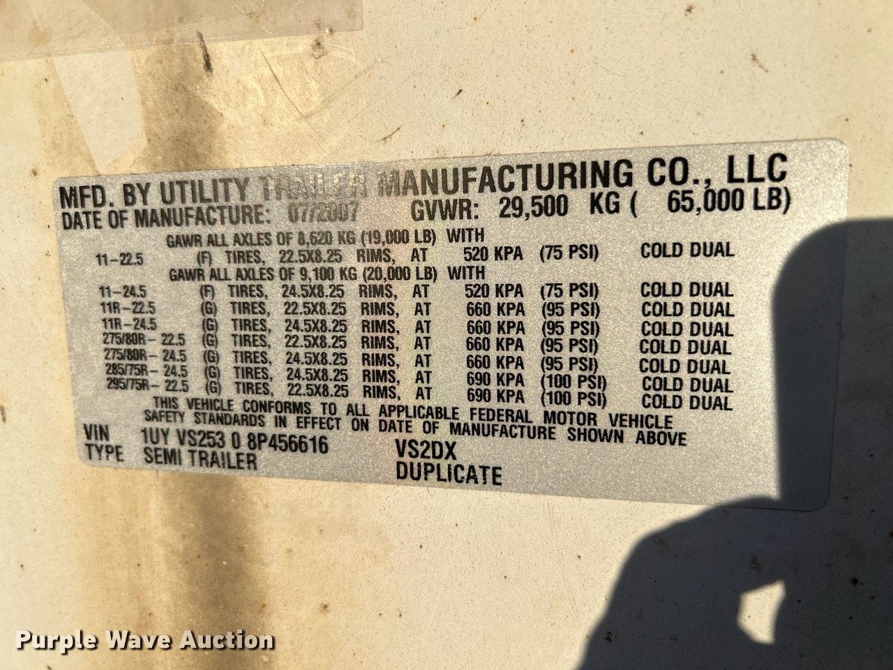 2008 Utility 4000D-X dry van trailer. VIN: 1UYVS25308P456616, Unit #: 952. Dimensions Overall: 52' 6" L x 101" W. Features Deck type: Wood. Chassis Landing gear: Dual, Suspension: Air, Brakes: Air, Axles: Tandem, Sliding, GVWR: 65,000 lbs, GAWR: 19,000 lbs. Tires Steel wheels, Size: 295/75R22.5. Missouri title. Buchheit Logistics/World Wide Leasing, Inc.. 600 Daugherty Street. Scott City, MO 63780