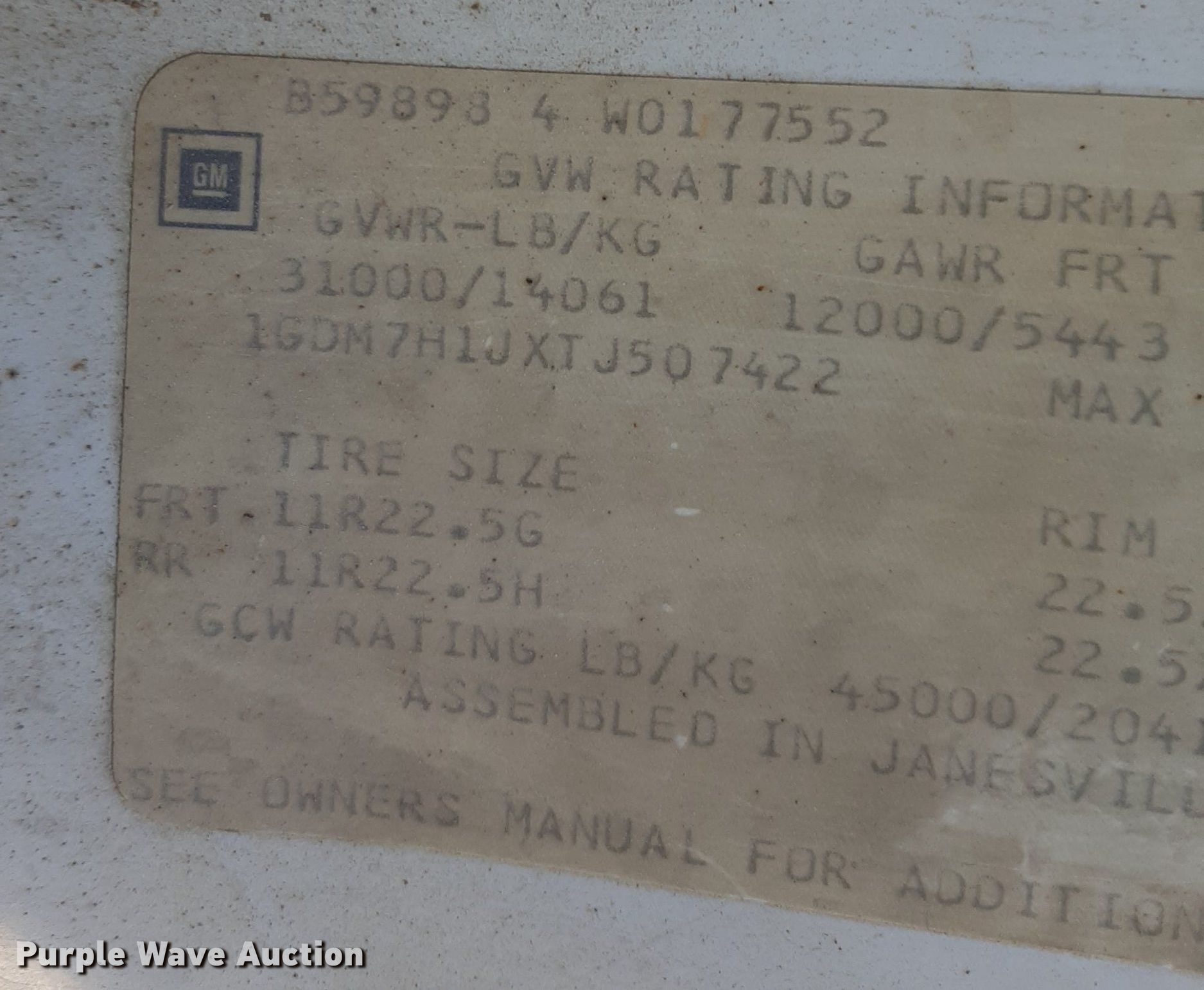 1996 GMC TopKick forestry bucket truck. Miles: 135,788 on odometer, VIN: 1GDM7H1JXTJ507422. Engine Caterpillar 3116, Displacement: 6.6L, Cylinders: 6, Fuel type: Diesel. Transmission Manual, Speed: 6. Chassis Axles: Single, Suspension: Spring, Brakes: Air, GVWR: 31,000 lbs. Interior AC, Heat. Features Bed Altec, 16' L x 94" W, Boom Teco V5A-50IP-2TFE2, Serial: 66939609, Maximum lift capacity: 600 lbs, Maximum lift height: 50', Boom type: Articulating, Insulated, Man basket, Boom controls Ground, Platform/ basket.. Tires Size: 11R22.5. Notes Clutch replaced, Fuel pump replaced, Batteries replaced, Boom issues, hydraulic leak. View repairs. Kansas title. Title distribution may be delayed up to 14 days from verification of funds. Augusta, KS 67010