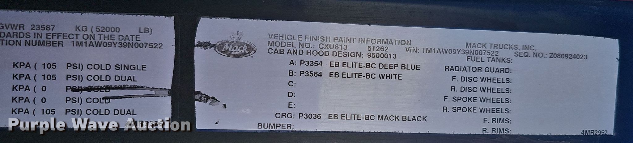 2009 Mack CXU613 semi truck. Miles: 703,120 on odometer, VIN: 1M1AW09Y39N007522. Engine Mack MP8-415C, Serial: 921761, Displacement: 12.8L, Cylinders: 6, Fuel type: Diesel, HP: 338, Engine brake. Transmission Eaton Fuller, Manual, Speed: 10. Chassis Axles: Tandem, Differential lock: Inter-axle, Suspension: Air, Brakes: Air, PTO, Wet kit, GVWR: 52,000 lbs FAWR: 12,000 lbs, IAWR: 20,000 lbs, RAWR: 20,000 lbs, Wheelbase: 186". Interior AC, Heat, Heated mirrors, Power windows, Cruise control, Air ride cab. Features Deck plate: Aluminum, Fifth wheel type: Air operated, Sliding, Fuel tank: Single. Tires Size: 295/75R22.5. Notes EGR deleted, DEF deleted, Trailer not included, Dash warning indicator: ATC, ABS, Fault codes, Windshield chipped or cracked. Nebraska title. Title distribution may be delayed up to 14 days from verification of funds. 1705 Veterans Memorial Highway. Council Bluffs, IA 51501