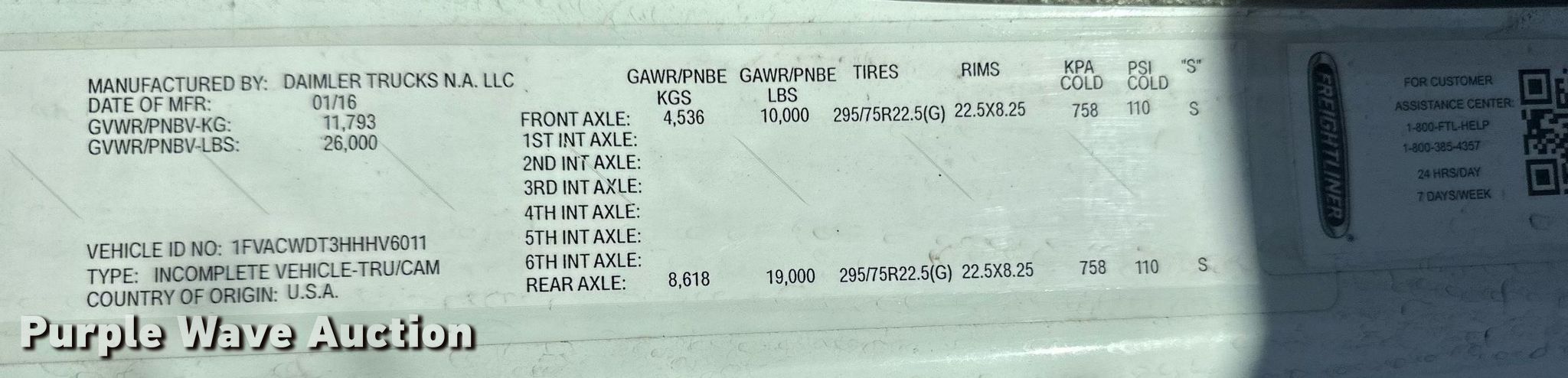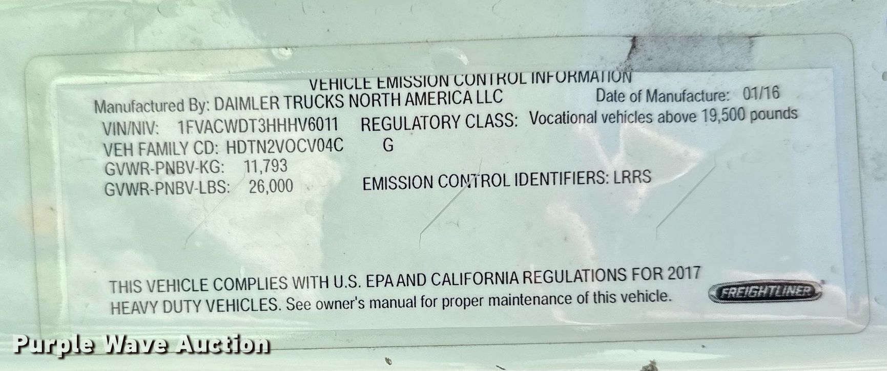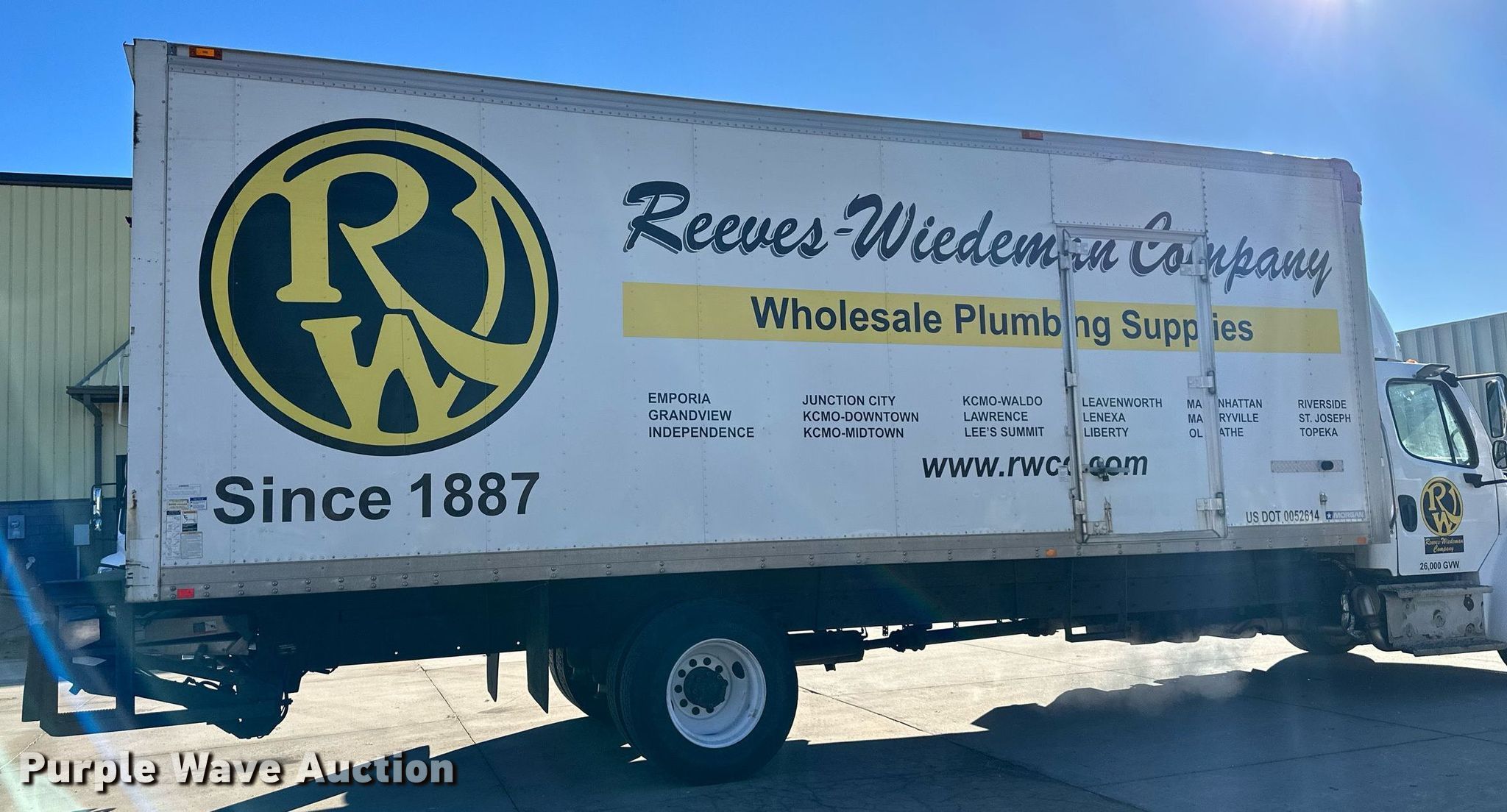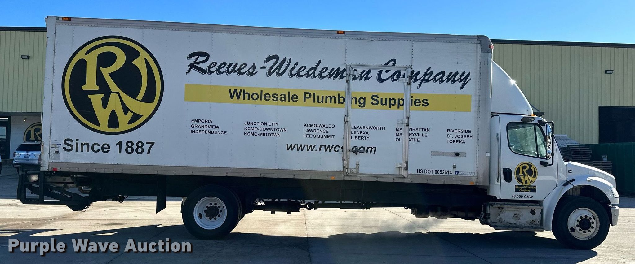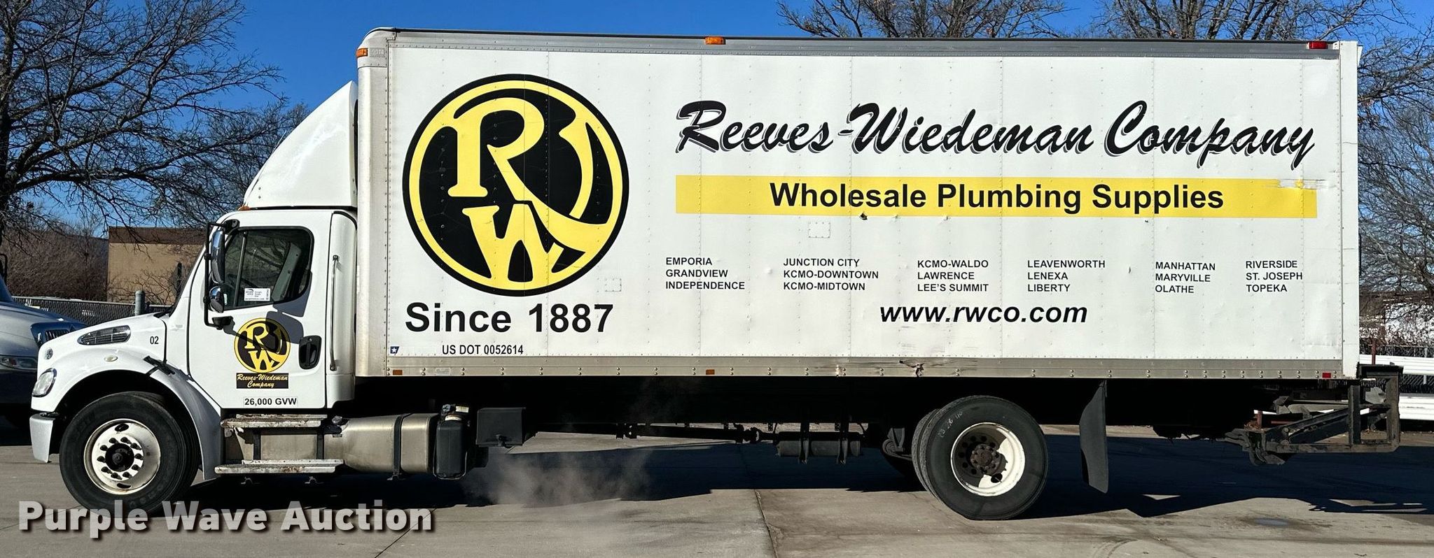 2017 Freightliner Business Class M2 box truck. Miles: 352,495 on odometer, Hours: 8,510 on meter, VIN: 1FVACWDT3HHHV6011. Engine Cummins, Displacement: 6.7L, Cylinders: 6, Fuel type: Diesel. Transmission Automatic. Chassis Axles: Single, Suspension: Air, Brakes: Air, GVWR: 26,000 lbs. Interior AC, heat, Heated mirrors, Cruise control. Features Box bed Morgan CVSD10326102, Serial: MLK07VB02694002, 26' L x 102" W x 103" H, Floor: Wood, Slider ramp Width: 23", End gate lift Maxon GPT-3, Capacity: 3,000 lbs.. Tires Size: 295/75R22.5. Notes Dash warning indicator: Check engine. Kansas title. Title distribution may be delayed up to 14 days from verification of funds. Reeves-Wiedeman Co.. 14861 West 100th Street. Lenexa, KS 66215