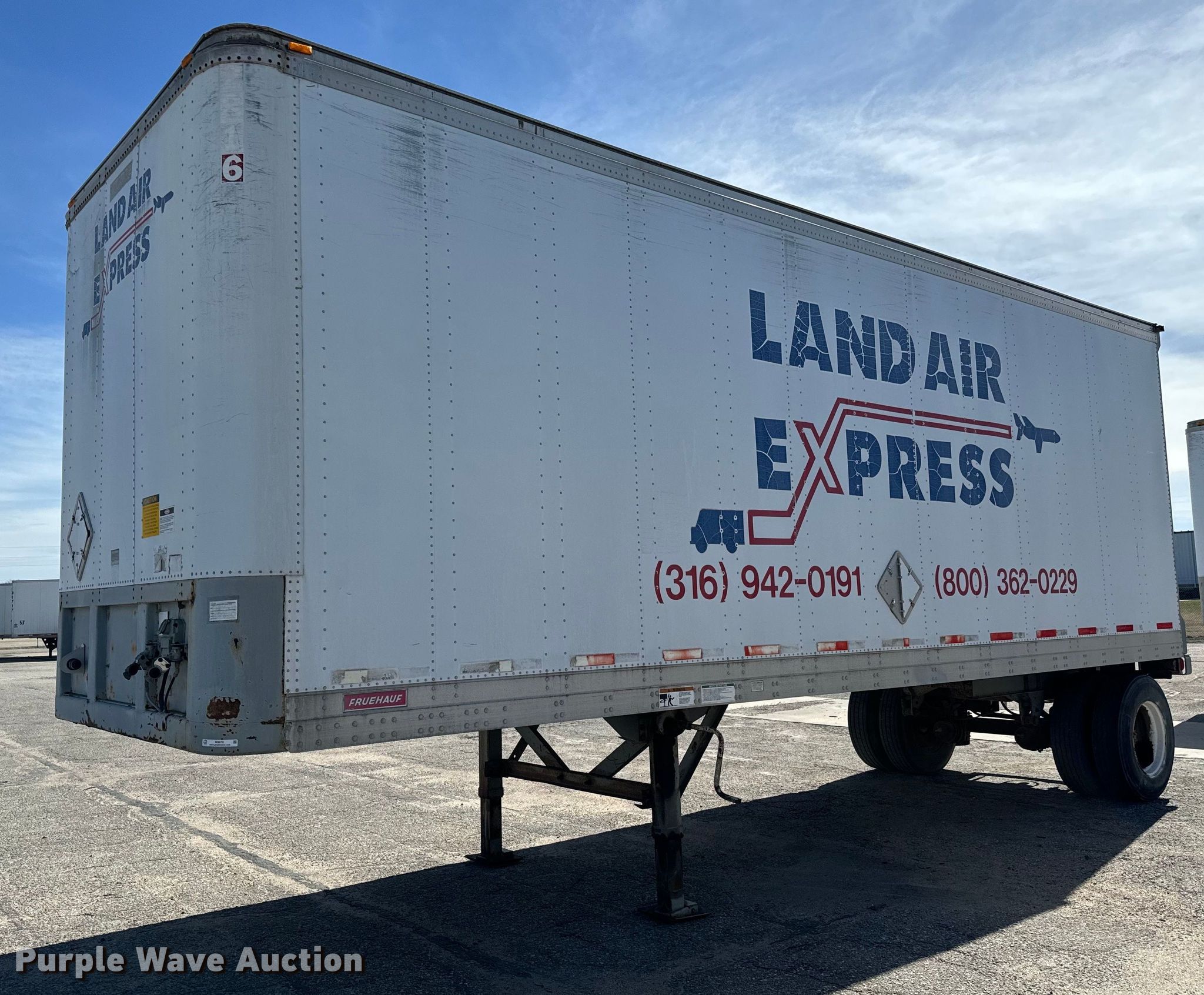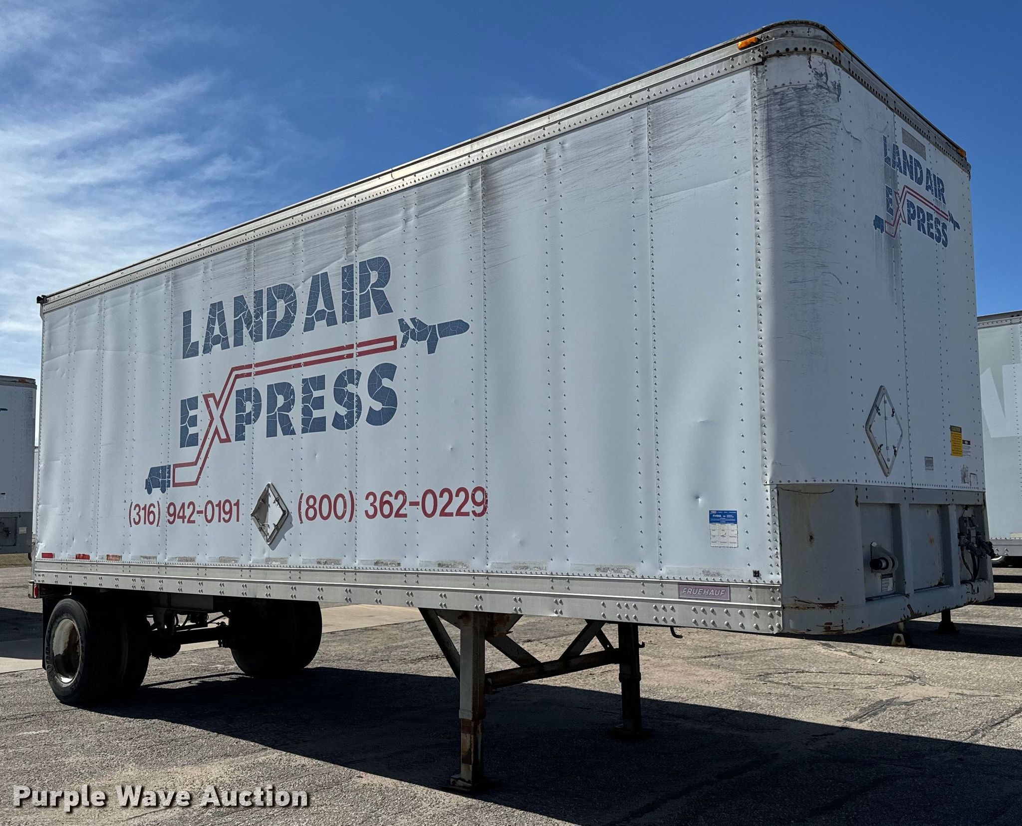 1996 Fruehauf FBB-9-1.5-NF1 28W dry van trailer. VIN: 1H2V02819TE029607. Dimensions Overall: 28' L x 102" W. Features Deck type: Wood. Chassis Landing gear: Dual, Suspension: Spring, Brakes: Air, GVWR: 35,000 lbs, GAWR: 20,000 lbs. Tires Steel wheels, Size: 295/75R22.5. Kansas title. Title distribution may be delayed up to 14 days from verification of funds. Wichita, KS 67213
