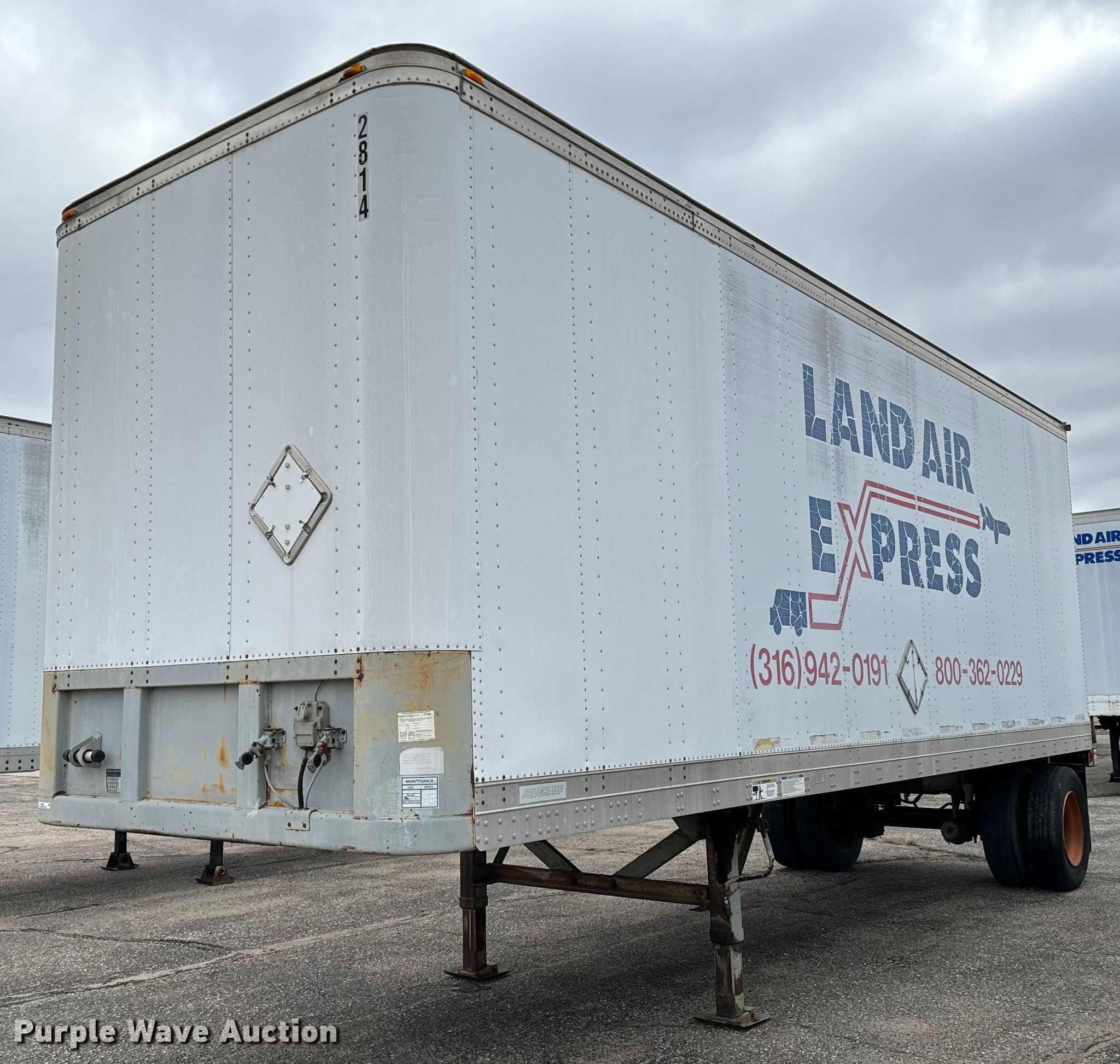 1996 Fruehauf FBB-9-1.5-NF1 28W dry van trailer. VIN: 1H2V02815TE029605. Dimensions Overall: 28' L x 102" W. Features Deck type: Wood. Chassis Landing gear: Dual, Suspension: Spring, Brakes: Air, GVWR: 35,000 lbs, GAWR: 20,000 lbs. Tires Steel wheels, Size: 295/75R22.5. Kansas title. Title distribution may be delayed up to 14 days from verification of funds. Wichita, KS 67213
