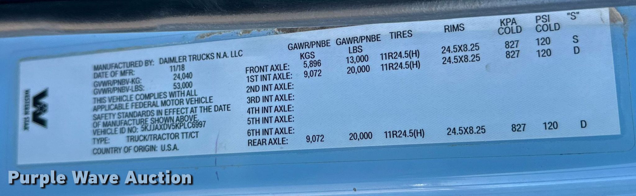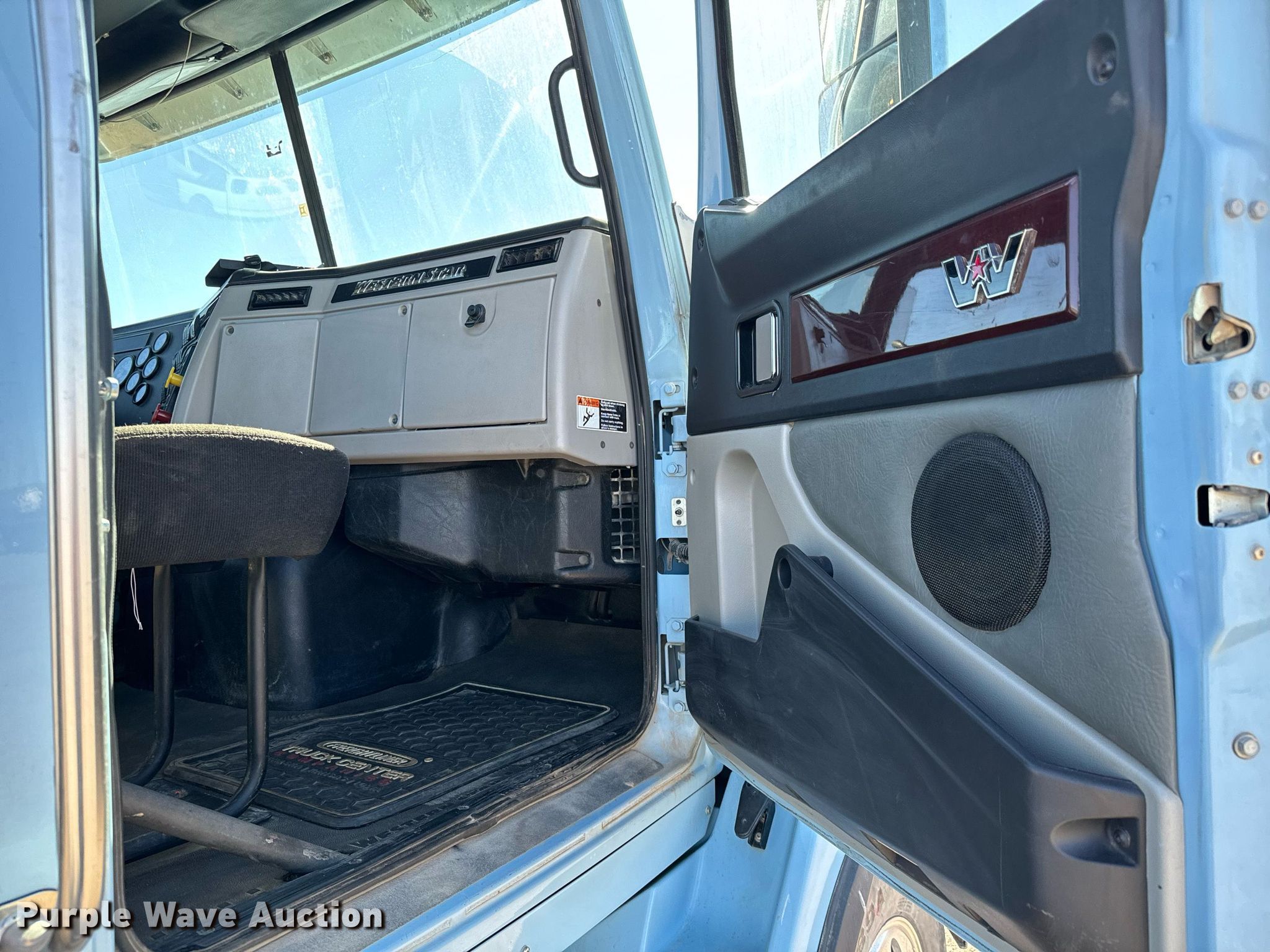 2019 Western Star 4700 SB semi truck. Miles: 423,485 on odometer, VIN: 5KJJAXDV5KPLC6997, Unit #: 6997. Engine Detroit Diesel DD13, Displacement: 12.8L, Cylinders: 6, Fuel type: Diesel, Engine brake. Transmission Eaton Fuller, Automatic. Chassis Axles: Tandem, Differential lock: Inter-axle, Suspension: Air Dump valves, Brakes: Air, PTO, Wet kit, GVWR: 53,000 lbs FAWR: 13,000 lbs, IAWR: 20,000 lbs, RAWR: 20,000 lbs. Interior AC, Heat, Heated mirrors, Power windows, Power locks, Cruise control, Air ride cab. Features Deck plate: Aluminum, Fifth wheel type: Air operated, Sliding. Tires Size: 11R24.5. Notes Windshield chipped or cracked. Kansas title. Title distribution may be delayed up to 30 days from verification of funds. 3760 S Broadway. Wichita, KS 67216