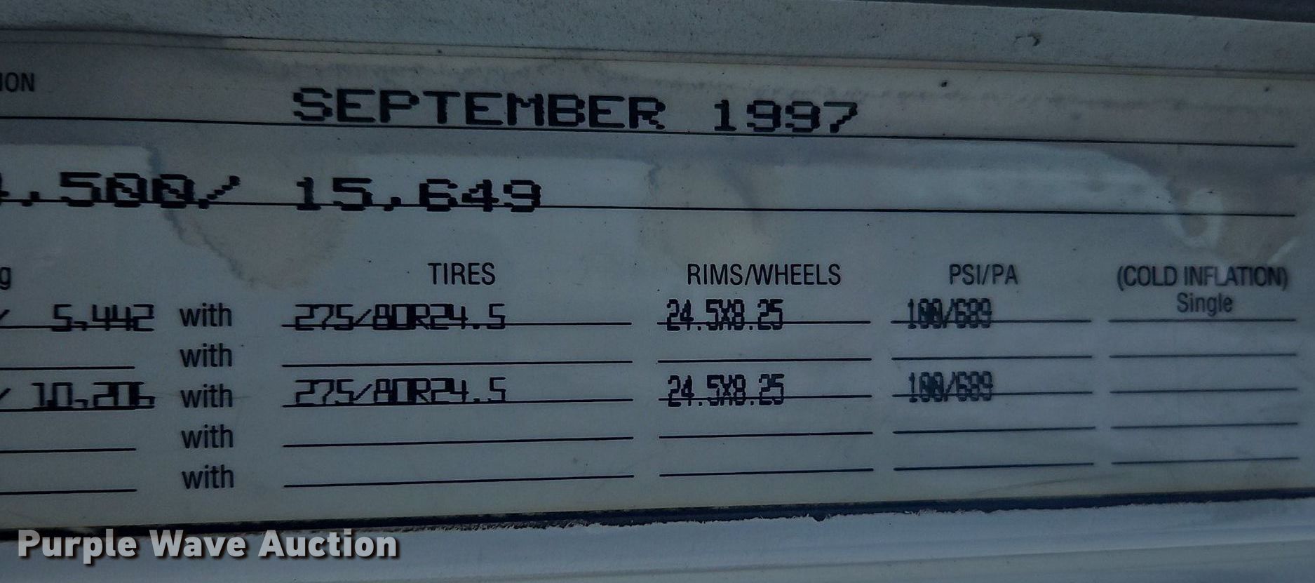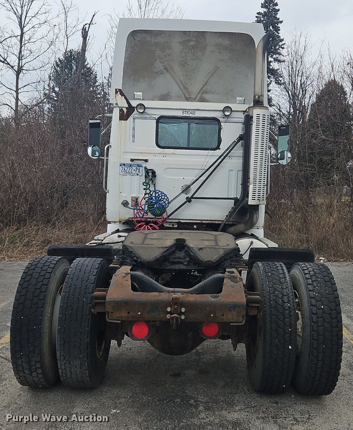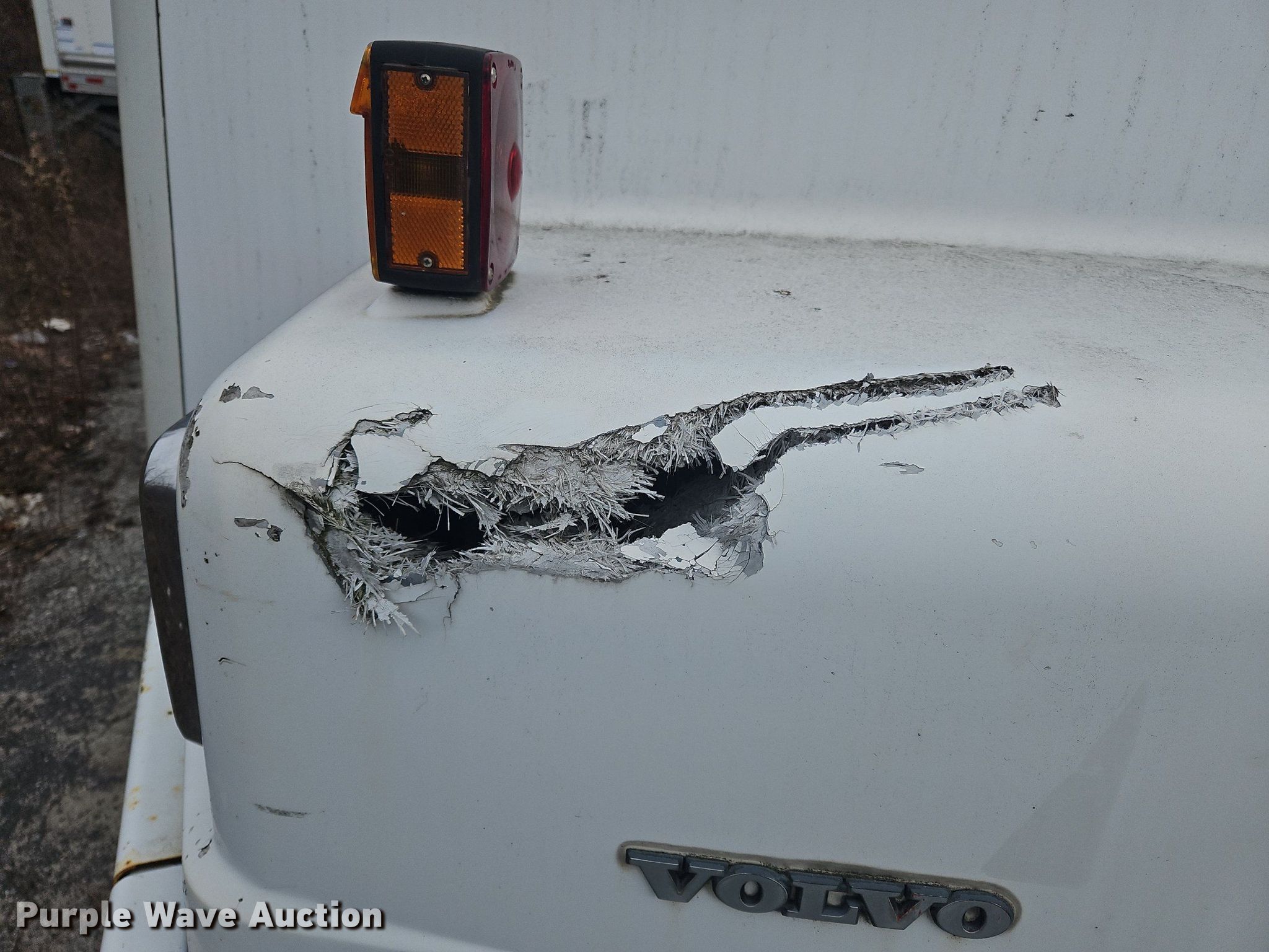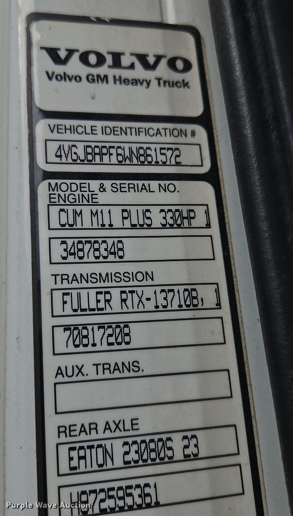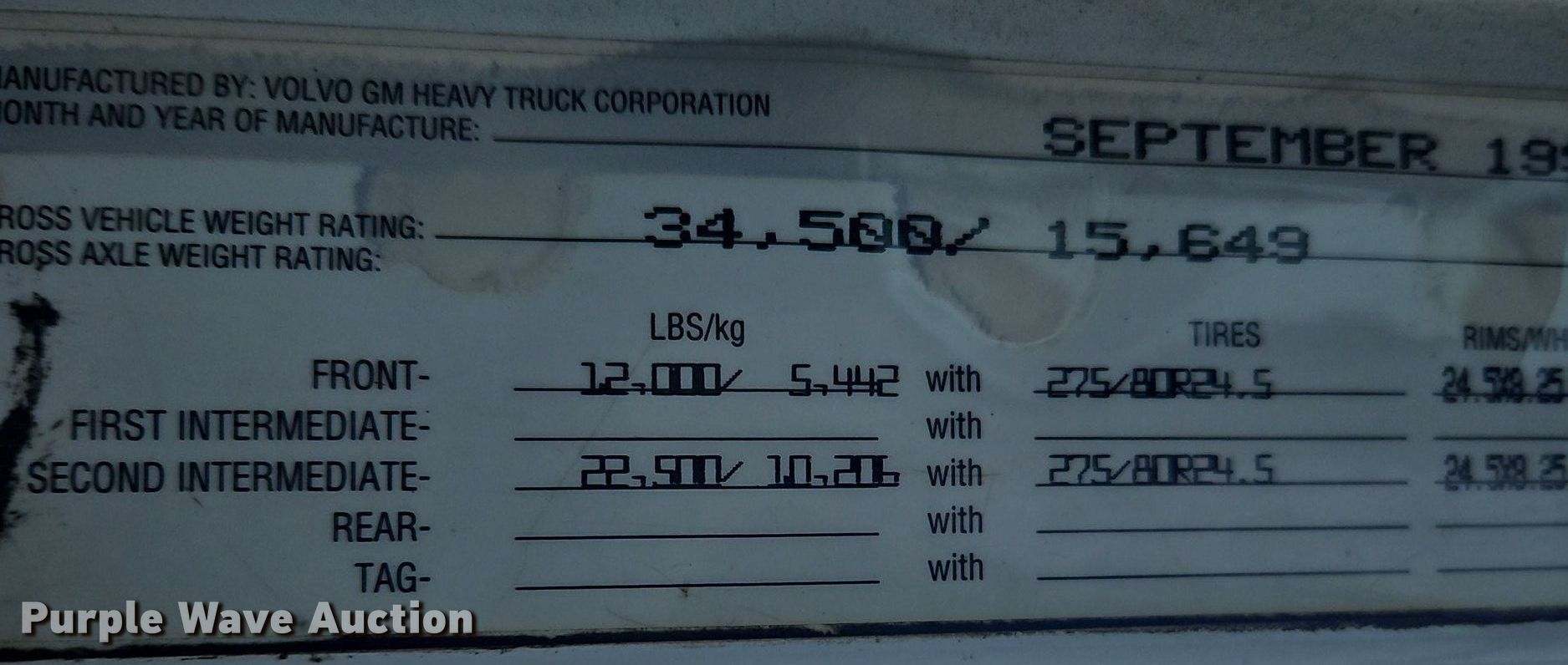 1998 Volvo WG semi truck. Miles: 104,858 on odometer, VIN: 4VGJBAPF6WN861572. Engine Cummins, Displacement: 10.8L, Fuel type: Diesel, Engine brake. Transmission Manual, Speed: 10. Chassis Axles: Single, Suspension: Spring, Brakes: Air, GVWR: 34,500 lbs FAWR: 12,000 lbs, IAWR: 22,500 lbs. Interior AC, Heat, Cruise control. Features Deck plate: Aluminum, Fifth wheel type: Air operated, Fuel tank: Dual. Tires Front: 285/75R22.5, Rear: 11R22.5. Notes Front brake issues, locked up, Dead battery. New York title. Title distribution may be delayed up to 14 days from verification of funds. Aim NationaLease. 1500 Trumbull Avenue. Girard, OH 44420