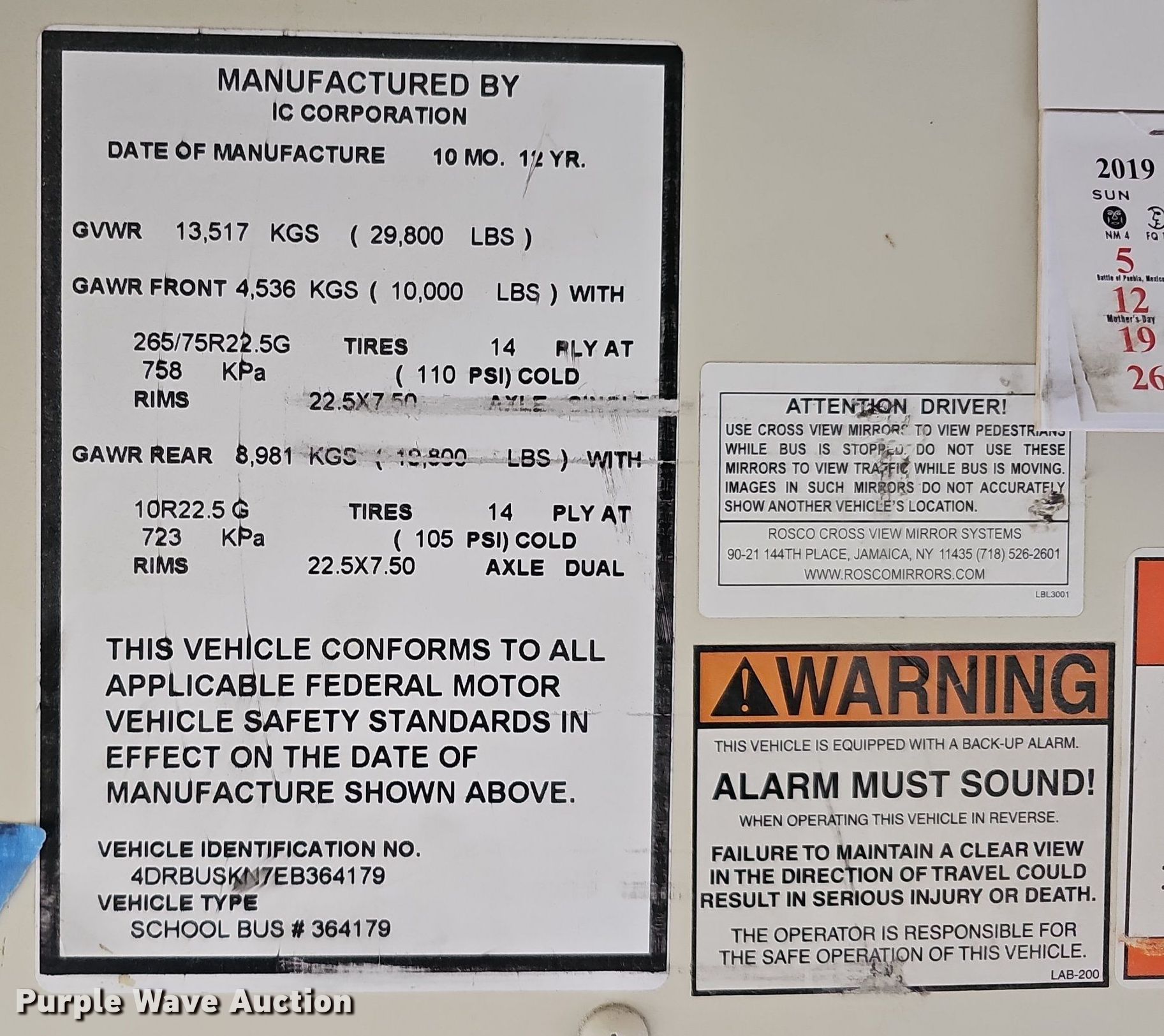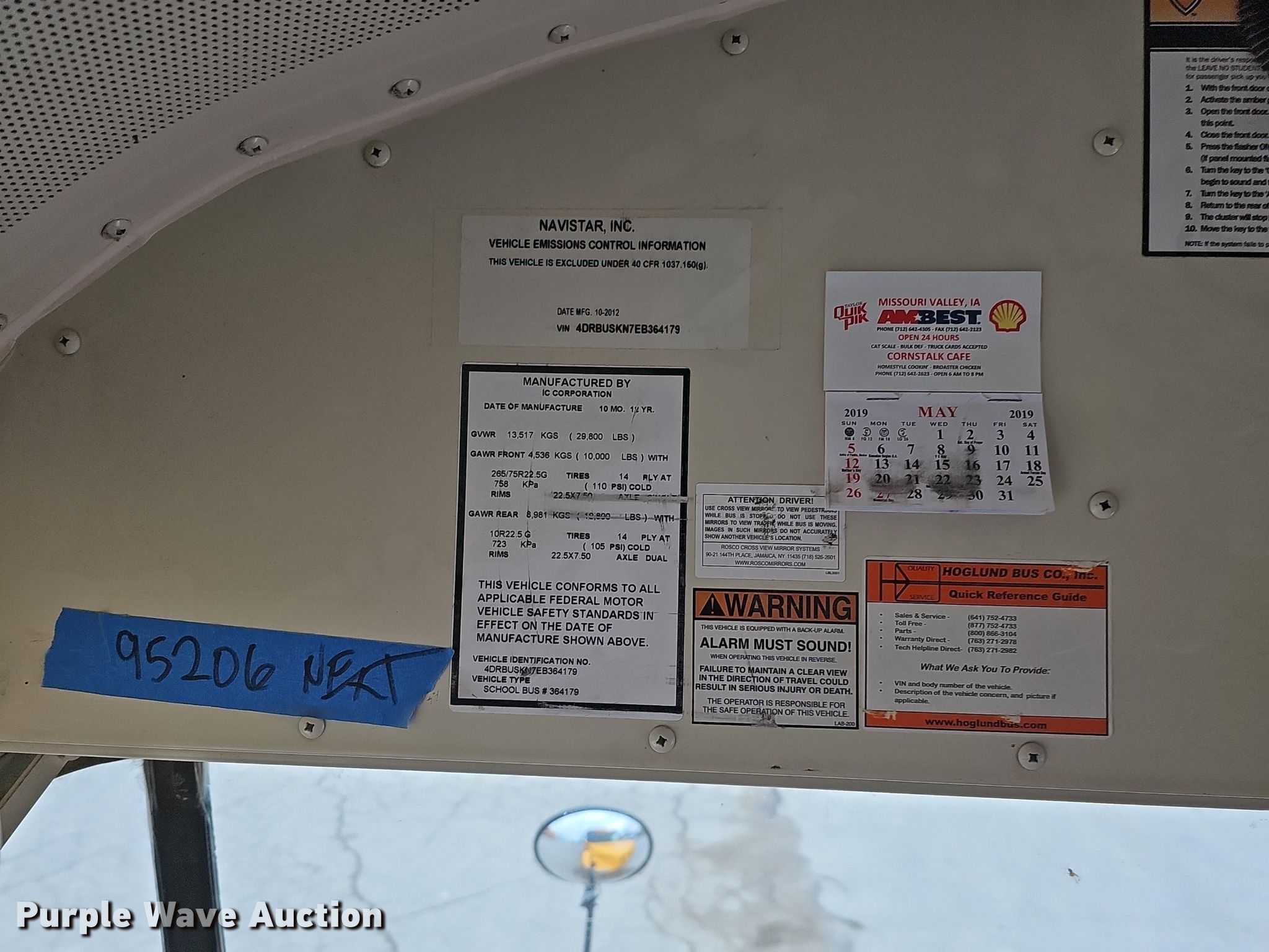 Purple Wave is selling a used Bus in Iowa. This item is a 2014 IC Corporation PB10500 school bus with the following: Miles: 96,486 on odometer, Hours: 5,391 on meter, VIN: 4DRBUSKN7EB364179, Unit #: 14