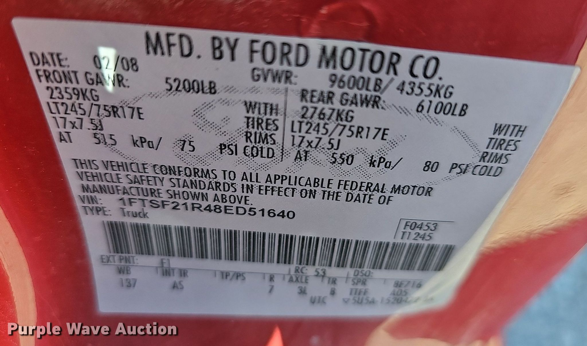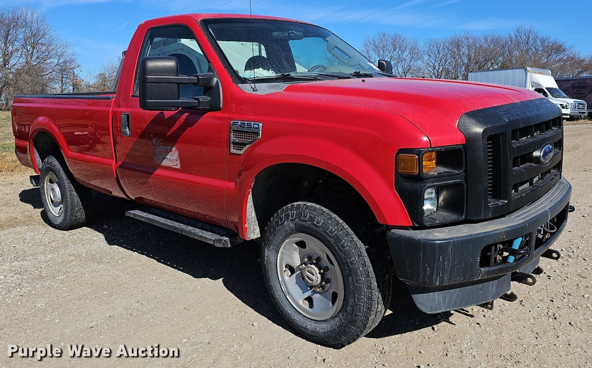 2008 Ford F250 Super Duty XL pickup truck. Miles: 36,018 on odometer, VIN: 1FTSF21R48ED51640, Unit #: PWK3488. Engine Displacement: 6.4L V8 OHV, Cylinders: 8, Fuel type: Diesel. Transmission Automatic, Four wheel drive. Interior AC, Heat. Tires Size: LT245/75R17. Notes Boss plow controls No plow, Dash warning indicator: TPMS. Kansas title. Title distribution may be delayed up to 14 days from verification of funds. Johnson County, KS. 1800 W Old 56 Hwy. Olathe, KS 66061