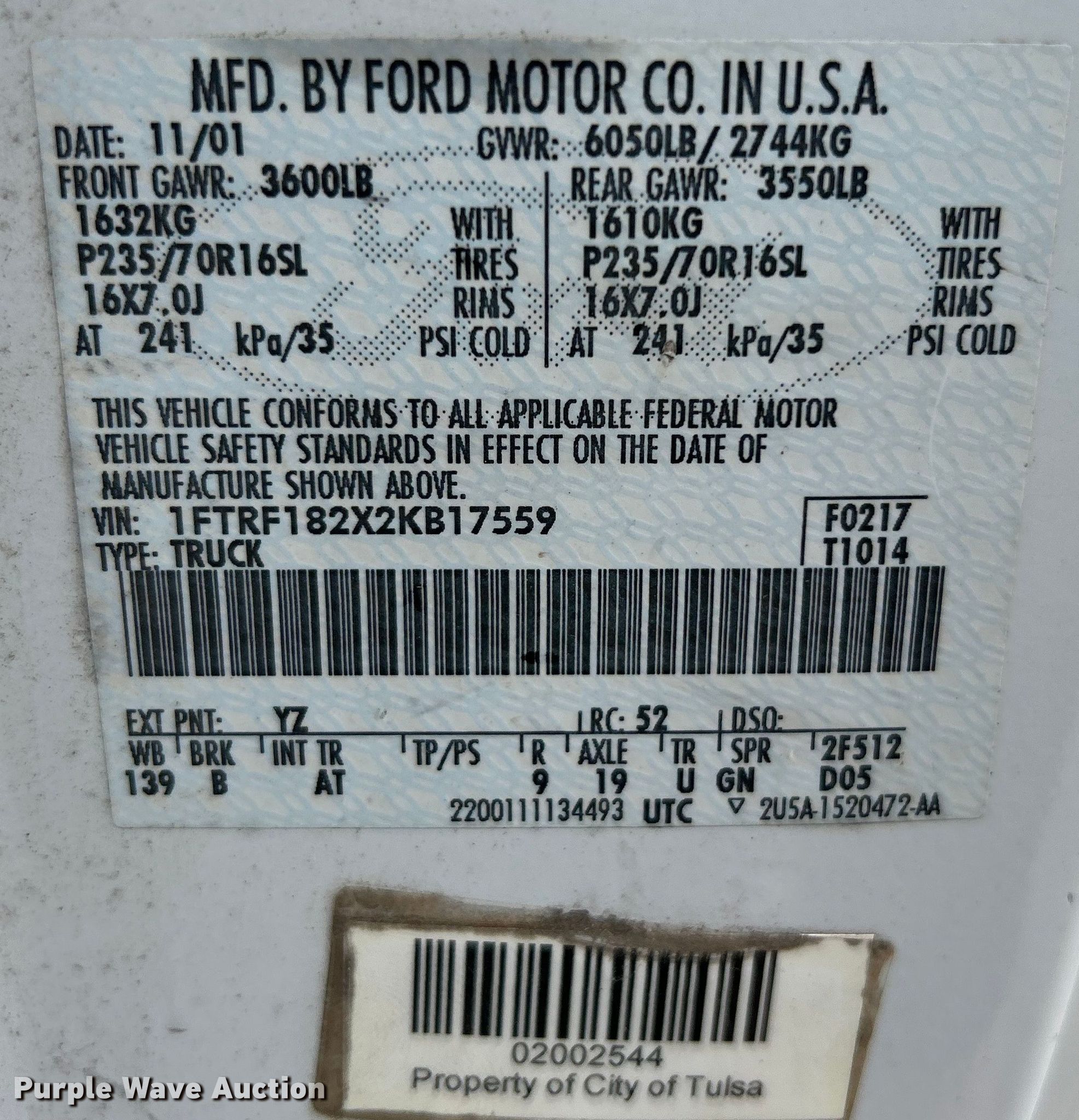 2002 Ford F150 pickup truck. Miles: 143,703 on odometer, VIN: 1FTRF182X2KB17559, Unit #: 523. Engine Displacement: 4.2L V6 OHV, Cylinders: 6, Fuel type: Gas. Transmission Automatic, Four wheel drive. Interior AC, Heat, Cruise control. Tires Size: P235/70R16. Notes Windshield chipped or cracked. Oklahoma title. Seller is a government entity who will be assigning and distributing the title. Please contact the seller for distribution questions. City of Tulsa. 108 N Trenton Ave. Tulsa, OK 74120