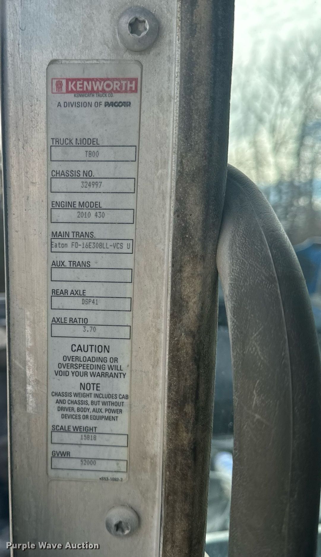 2012 Kenworth T800 semi truck. Miles: 237,279 on odometer, Hours: 6,952 on meter, VIN: 1XKDDP9X5CJ324997. Engine Paccar, Displacement: 12.9L, Cylinders: 6, Fuel type: Diesel, HP: 430. Transmission Eaton Fuller, Automatic. Chassis Axles: Tandem, Differential lock: Inter-axle, Suspension: Air, Brakes: Air, GVWR: 52,000 lbs FAWR: 12,000 lbs, IAWR: 20,000 lbs, RAWR: 20,000 lbs. Interior AC, heat, Power windows, power locks, Cruise control, Air ride cab. Features Deck plate: Aluminum, Fifth wheel type: Fixed, Fuel tank: Single. Tires Size: 11/R22.5. Notes Windshield chipped or cracked. Missouri title. Title distribution may be delayed up to 14 days from verification of funds. Howard Co. Mo.. 1 COURTHOUSE SQUARE. FAYETTE, MO 65248